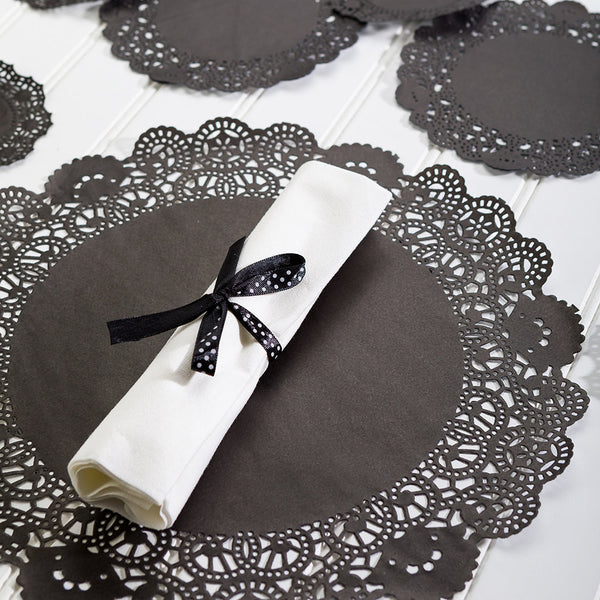Add a sophisticated touch to your table decorations with the Pastry Tek Black Paper Doilies. Made from premium paper, these 12-inch doilies offer a blend of durability and design to showcase a variety of desserts. The intricate lace-like details of these circular black paper doilies increase the visual appeal of your food presentation, creating a dramatic and elegant contrast against the strong black backdrop. These lace doilies are designed with a unique ability to absorb excess moisture, ensuring the longevity of food presentation by keeping baked fares fresh and dry. The bold black finish of these paper doilies adds depth and character to any table setting by creating an elegant look. These black paper doilies are disposable to ensure a huss-free cleaning process. Each round doily measure 12 inches in diameter. Shipped in a 4,000 count box.