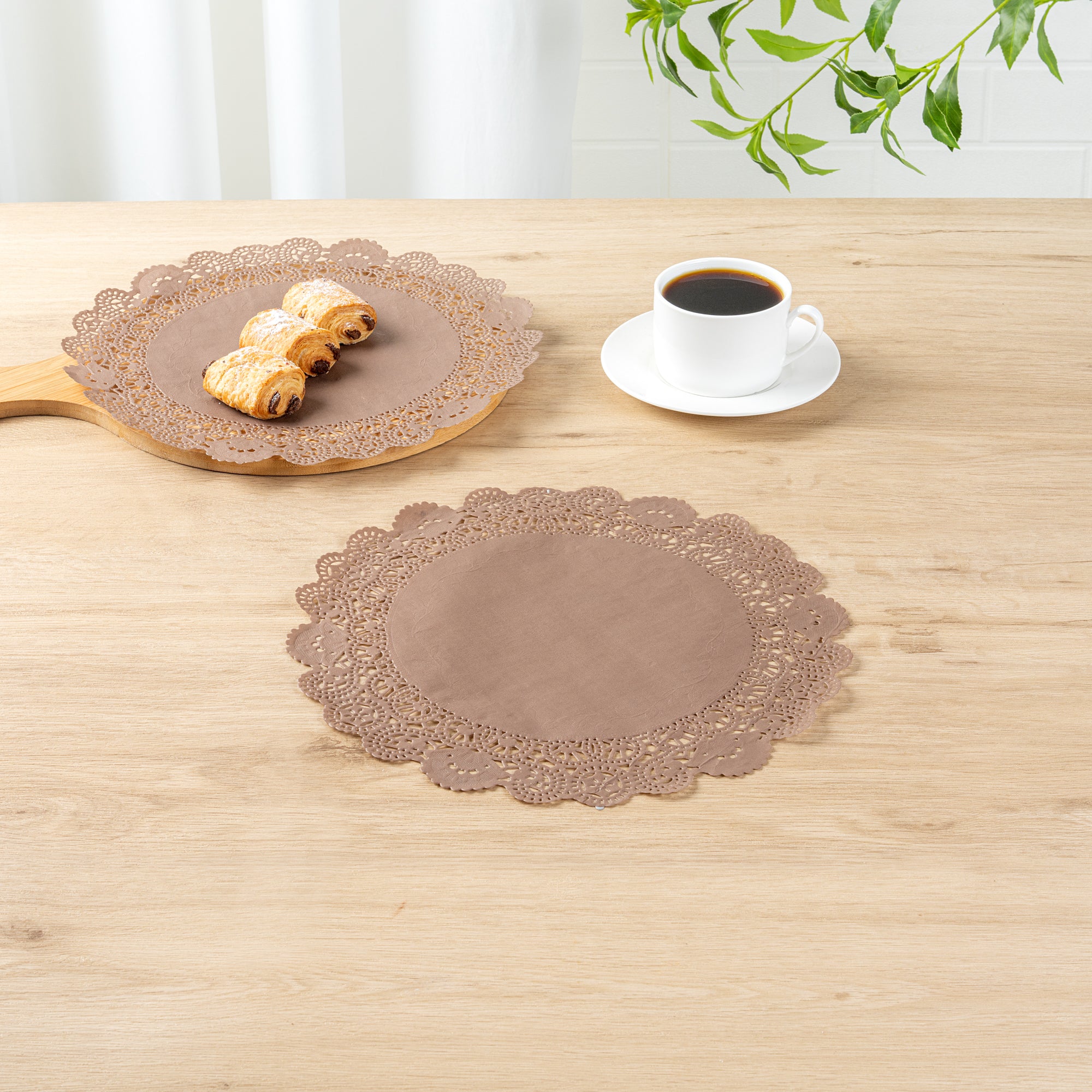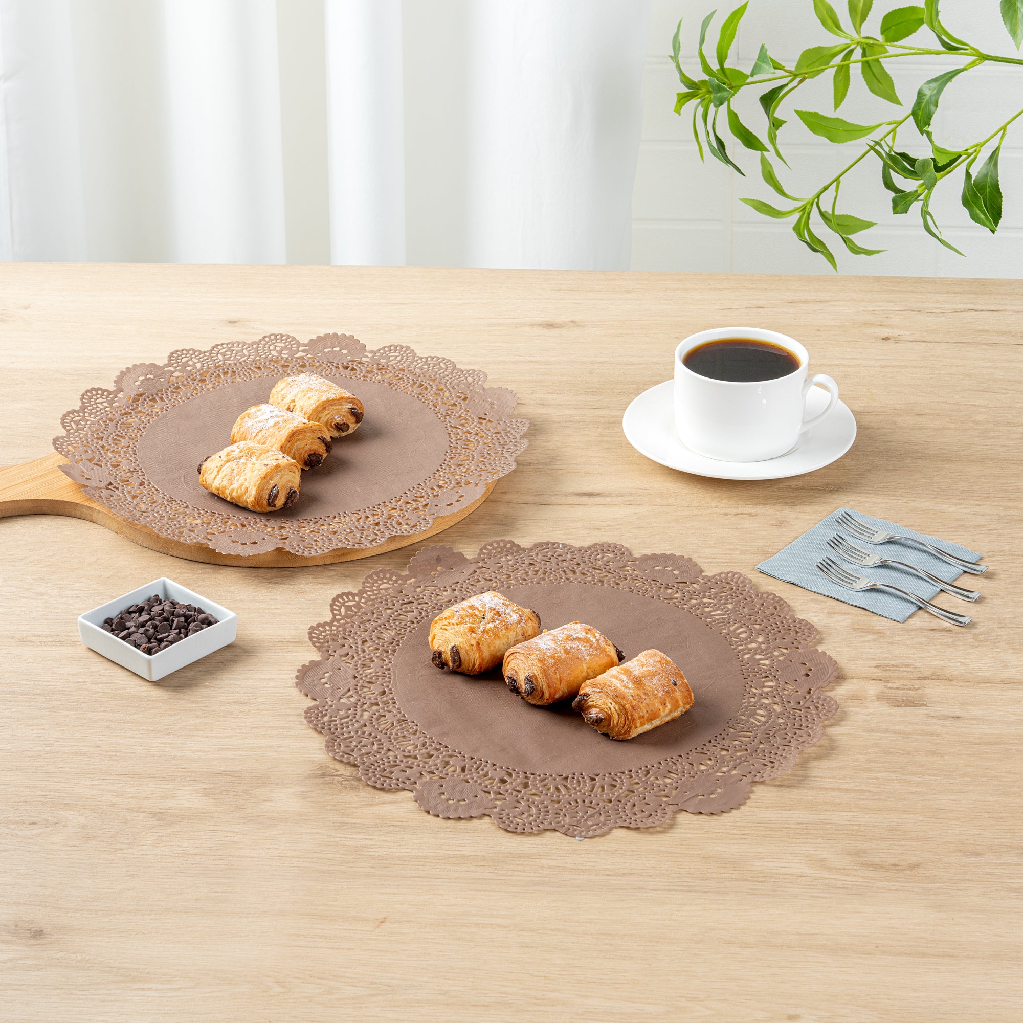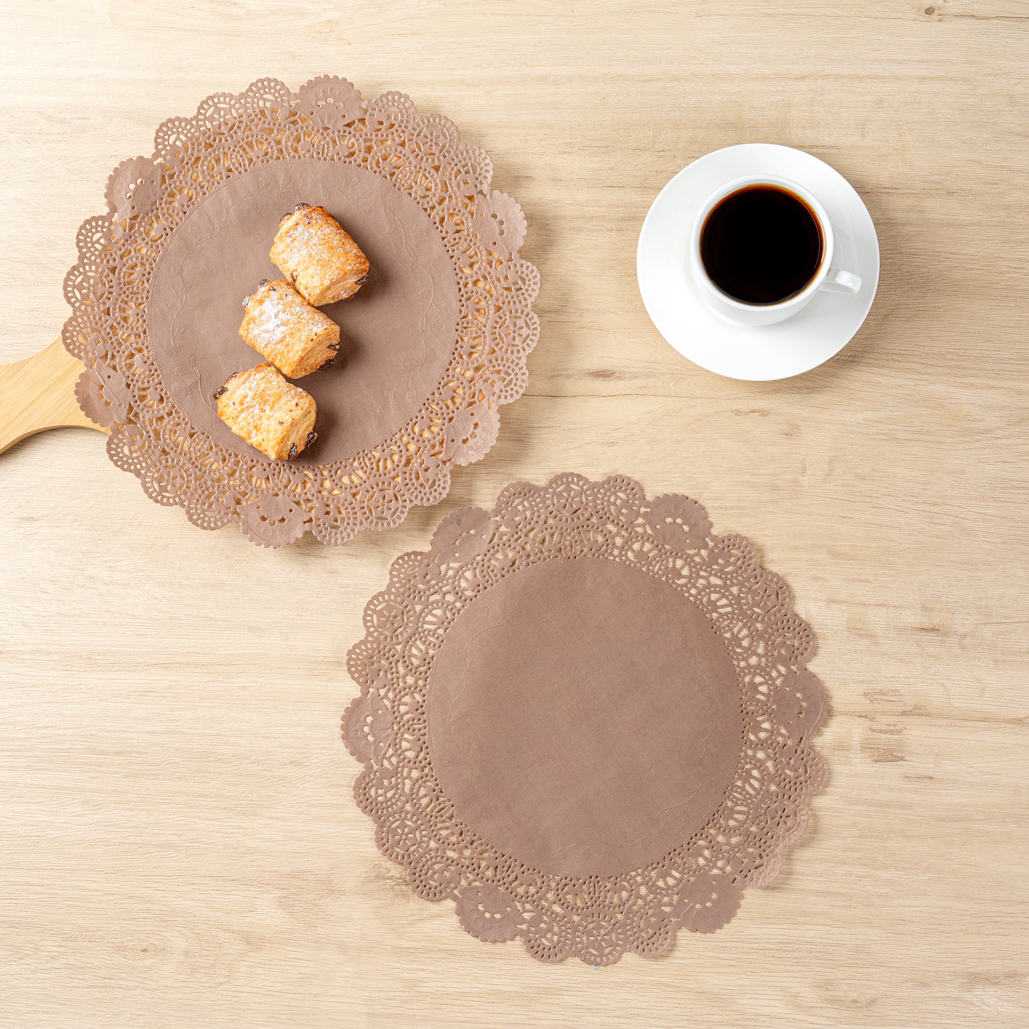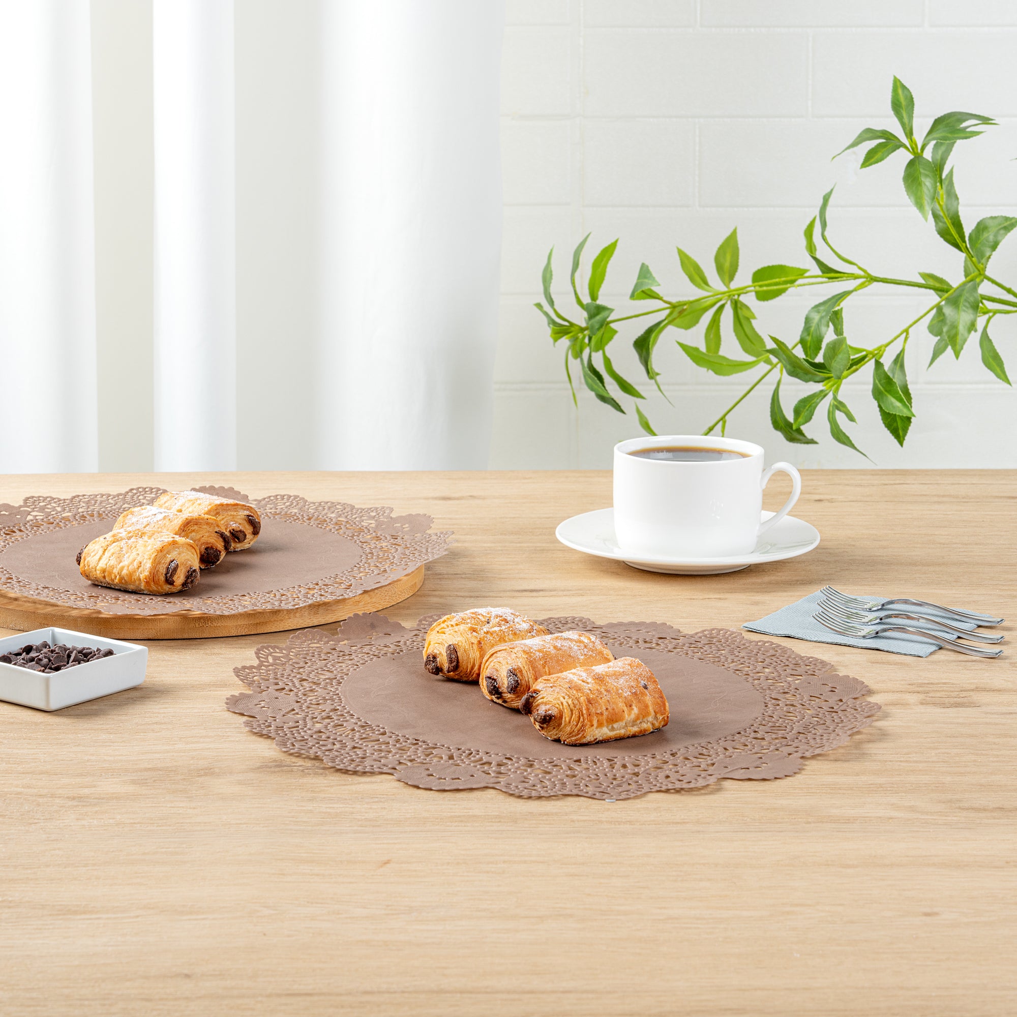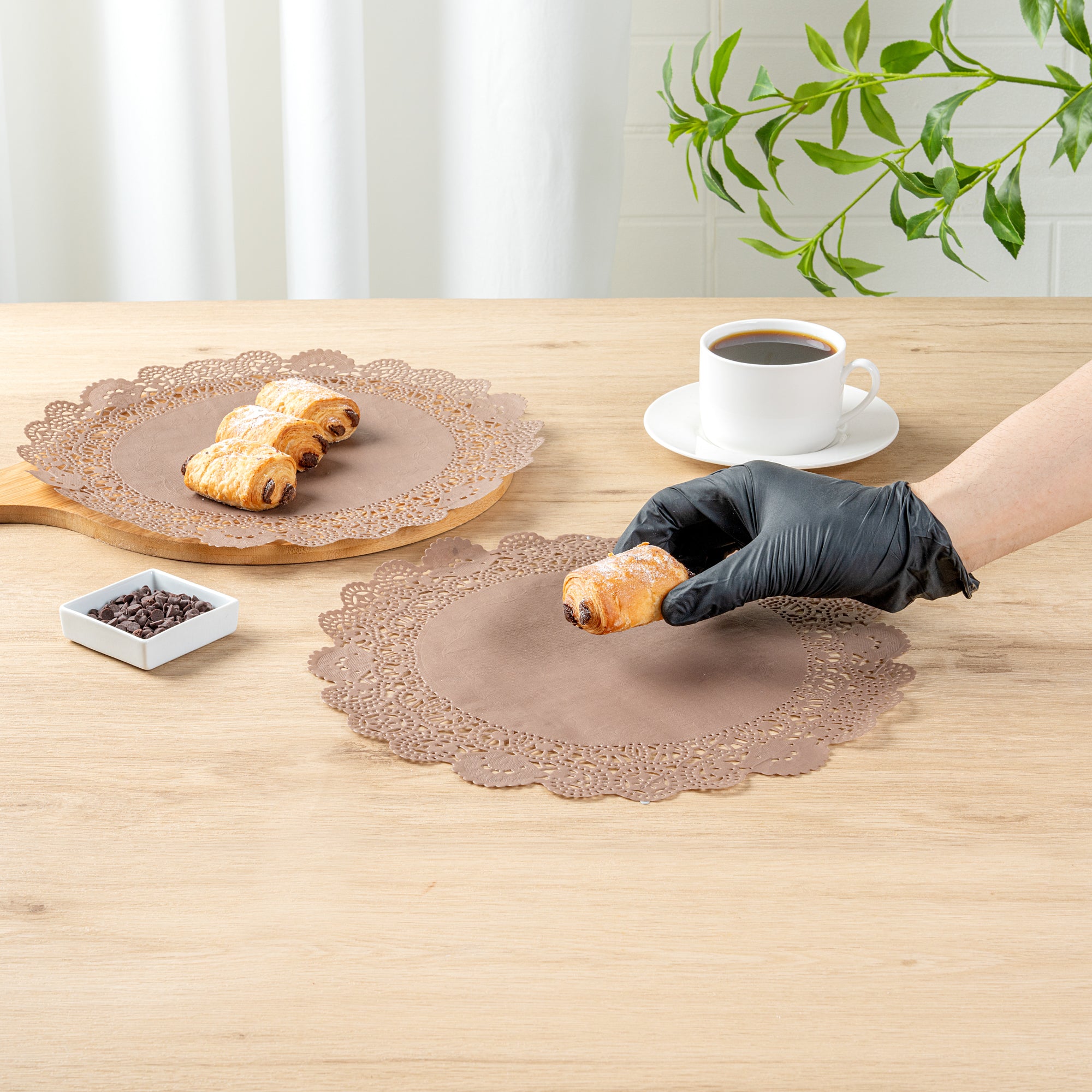 Elevate your dessert displays with our Pastry Tek Round Brown Paper Doilies. Crafted from high-quality paper, these table doilies provide unmatched durability while showcasing your desserts at bakeries or catered luncheons without tearing or losing their structural integrity. Featuring intricate lace-like details, these lace doilies increase the visual appeal of food presentations while serving as functional barriers, protecting surfaces, and absorbing moisture. The brown colored paper doilies complement a wide range of table settings and themes, making them an ideal choice for various events and occasions. Disposable by design, these small doilies eradicate the hassle of post-event cleanup, offering a convenient and time-saving solution for busy hosts and food establishments. Perfectly sized at 12 inches in diameter, these paper doilies can be used under cupcakes, petit fours, macarons, and other small treats. Sold in a 100 count box.