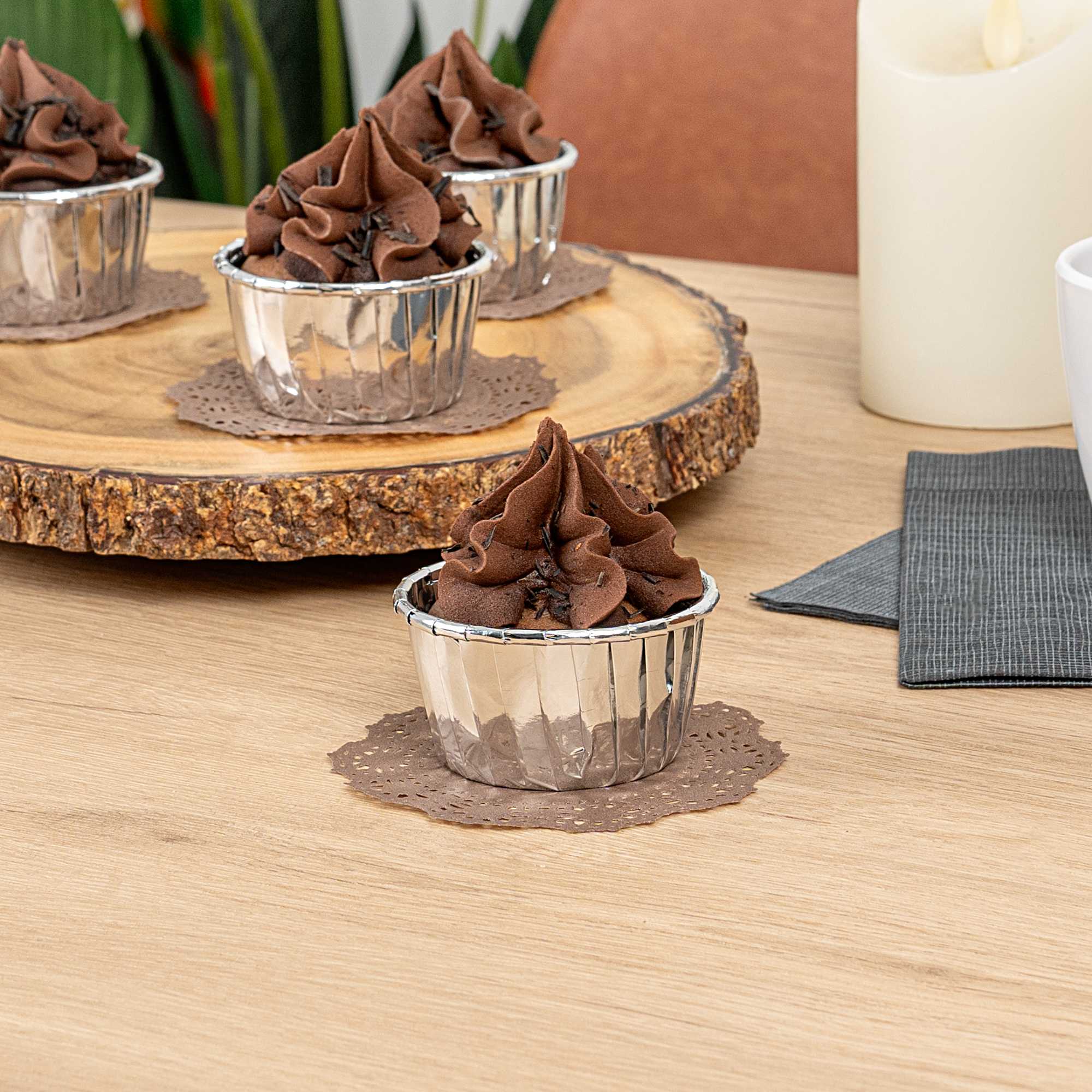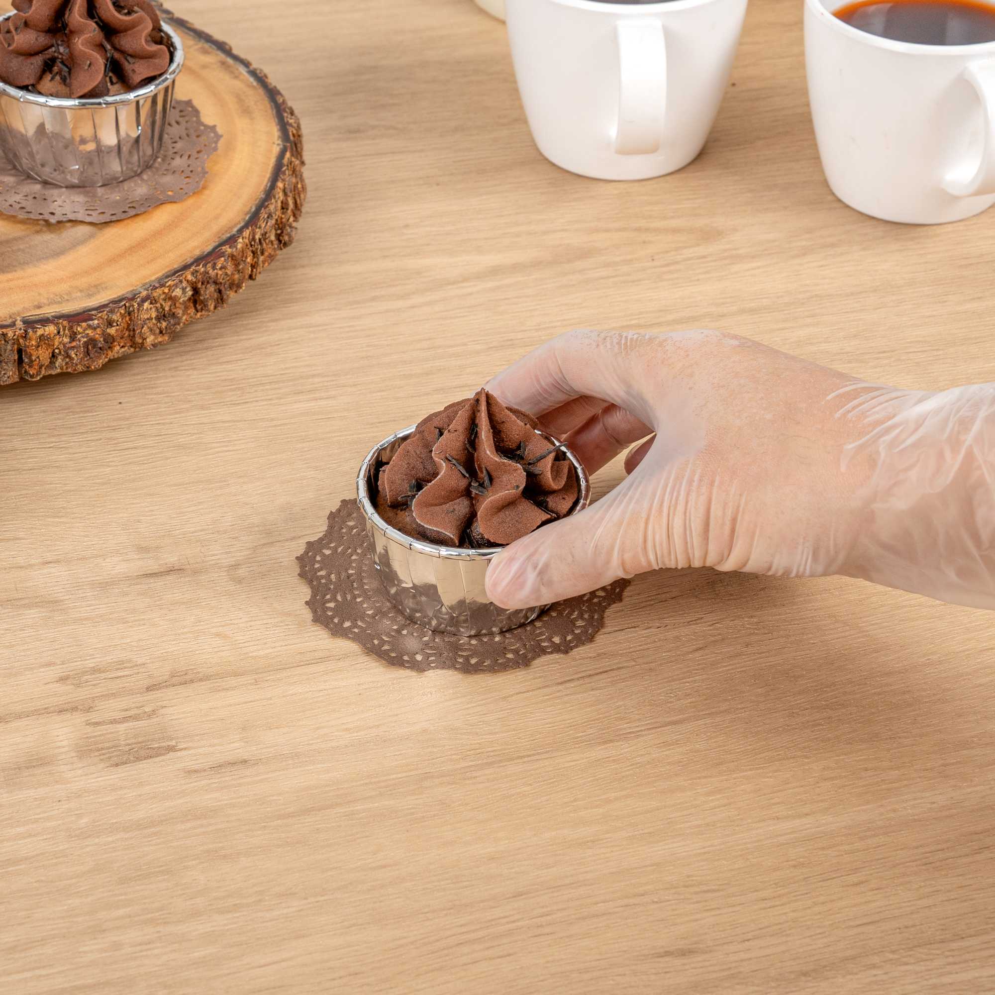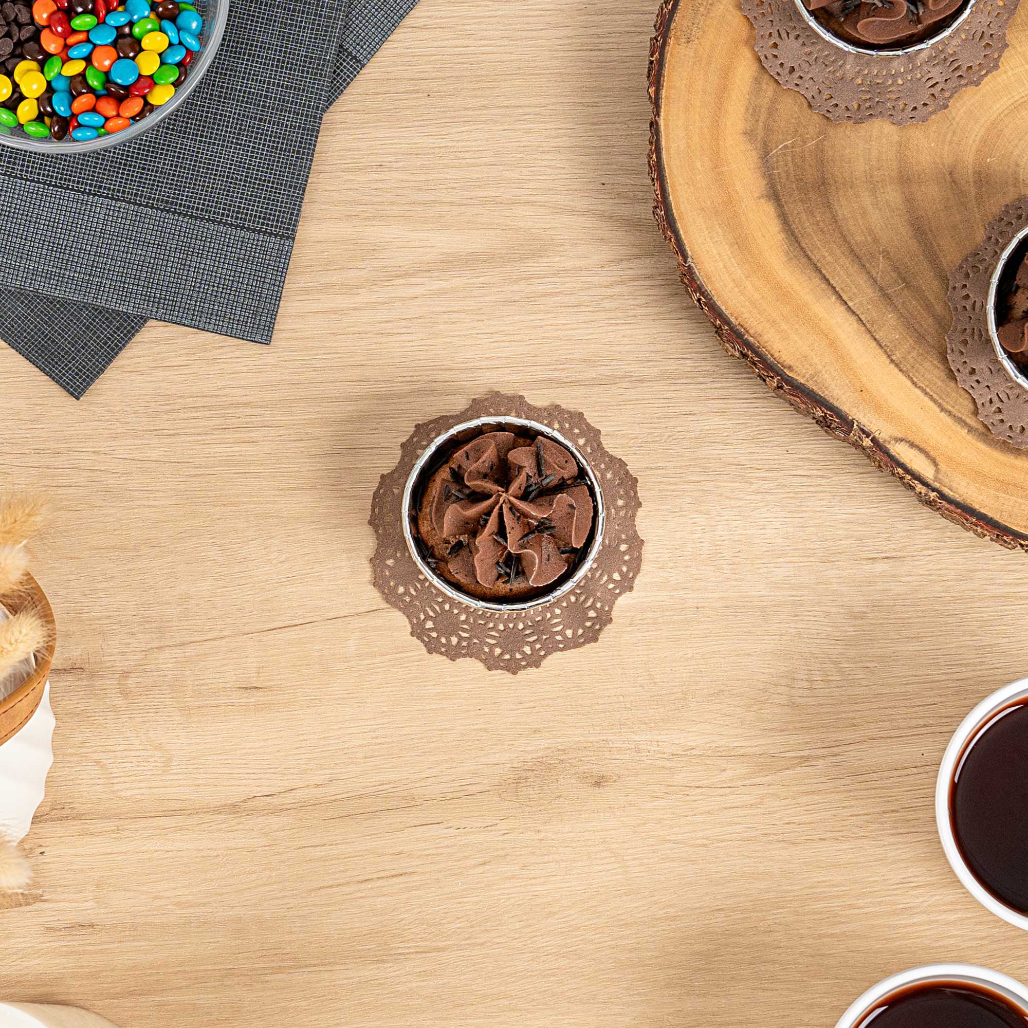 Elevate your dessert displays with our Pastry Tek Round Brown Paper Doilies. Adding an elegant touch to your table settings, these paper doilies are perfect for showcasing double chocolate brownies without compromising durability. Crafted from high-quality paper, these lace doilies maintain their structural integrity, ensuring your treats remain presentable. The intricate lace-like details enhance the visual appeal of food presentations while acting as functional barriers to protect surfaces and absorb moisture. These brown colored paper doilies complement a wide range of table settings and themes, making them ideal for various events and occasions. Designed for convenience, These disposable doilies eradicate the hassle of post-event cleanup, saving time for busy hosts and food establishments. Perfect for small treats like cupcakes, petit fours, and macarons, these small doilies measure 4 inches in diameter. Sold in a 100 count box.