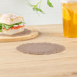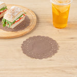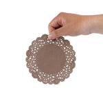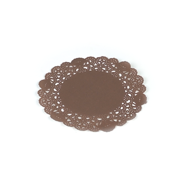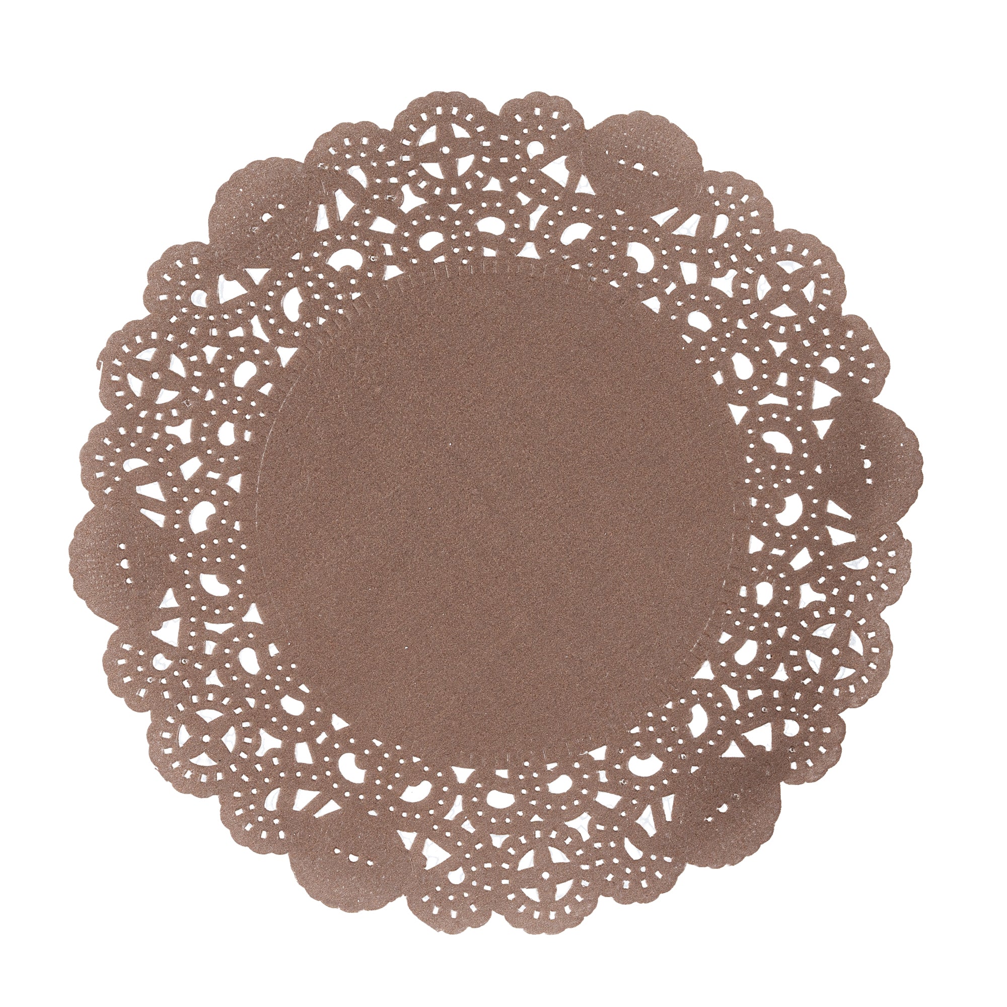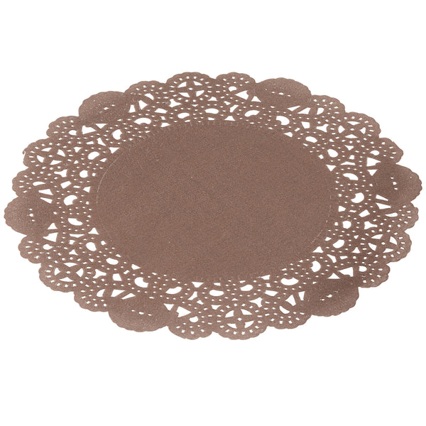 Enhance your dessert displays with our Pastry Tek Round Brown Paper Doilies, adding an elegant touch to any presentation. Crafted from high-quality paper, these durable lace doilies ensure your double chocolate brownies at bakeries or catered luncheons maintain their structural integrity without tearing. With intricate lace-like details, these table doilies increase the visual appeal of food presentations while serving as functional barriers to protect surfaces and absorb moisture. The brown colored finish of these paper doilies is versatile, allowing them to seamlessly complement a wide range of table settings and themes, making them ideal for various events and occasions. Designed for convenience, these disposable doilies eradicate the hassle of post-event cleanup, offering a time-saving solution for busy hosts and food establishments. Perfect for use under cupcakes, petit fours, macarons, and other small treats, these small doilies measure 6 inches in diameter. Sold in a 4,000 count box.