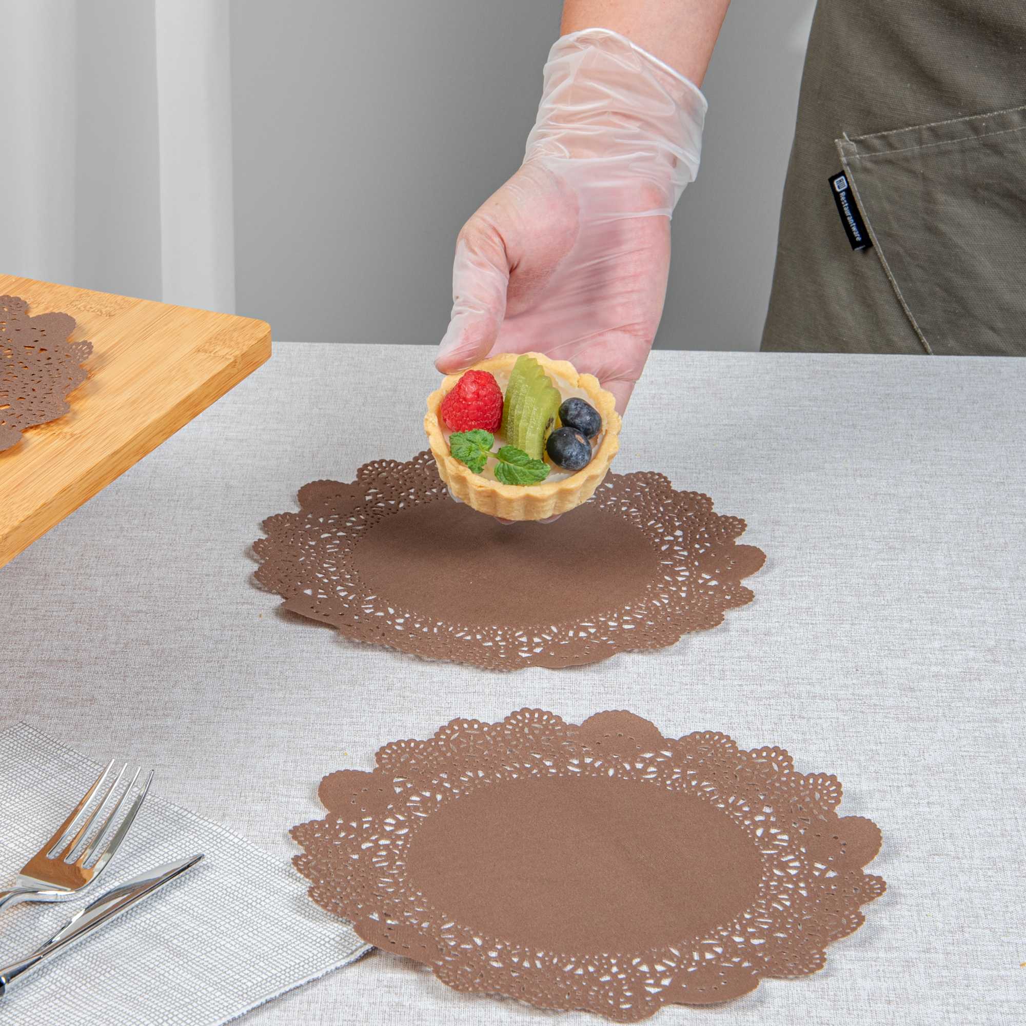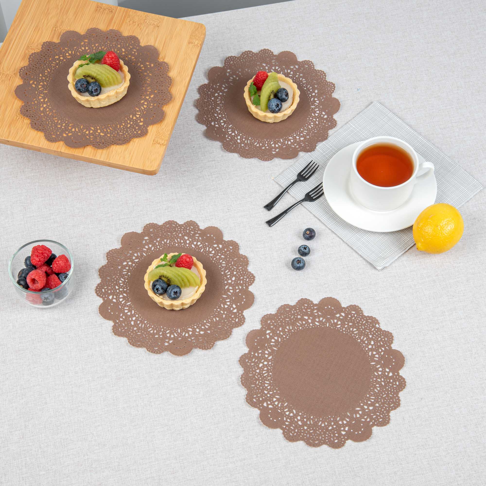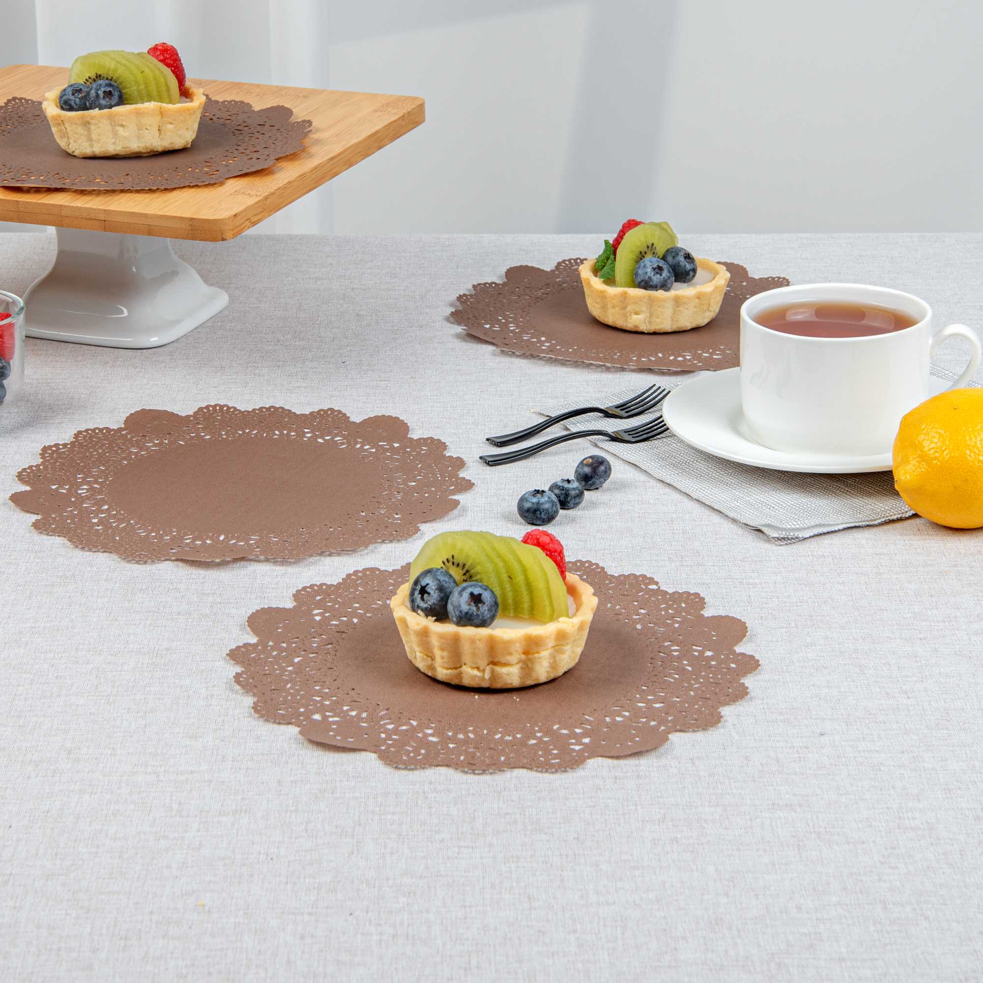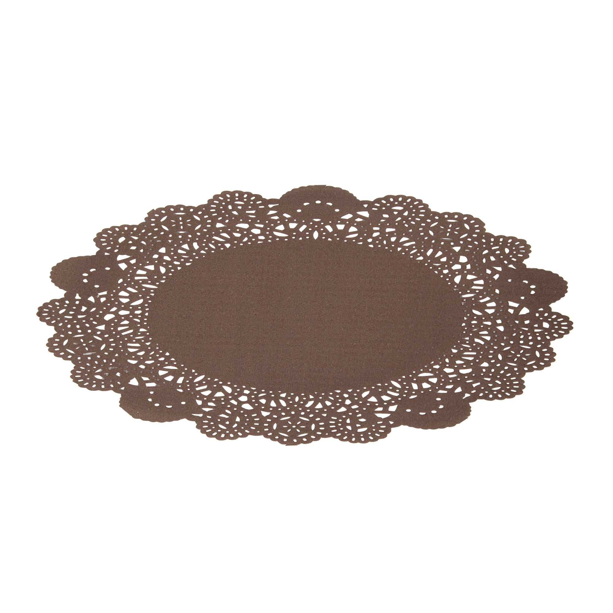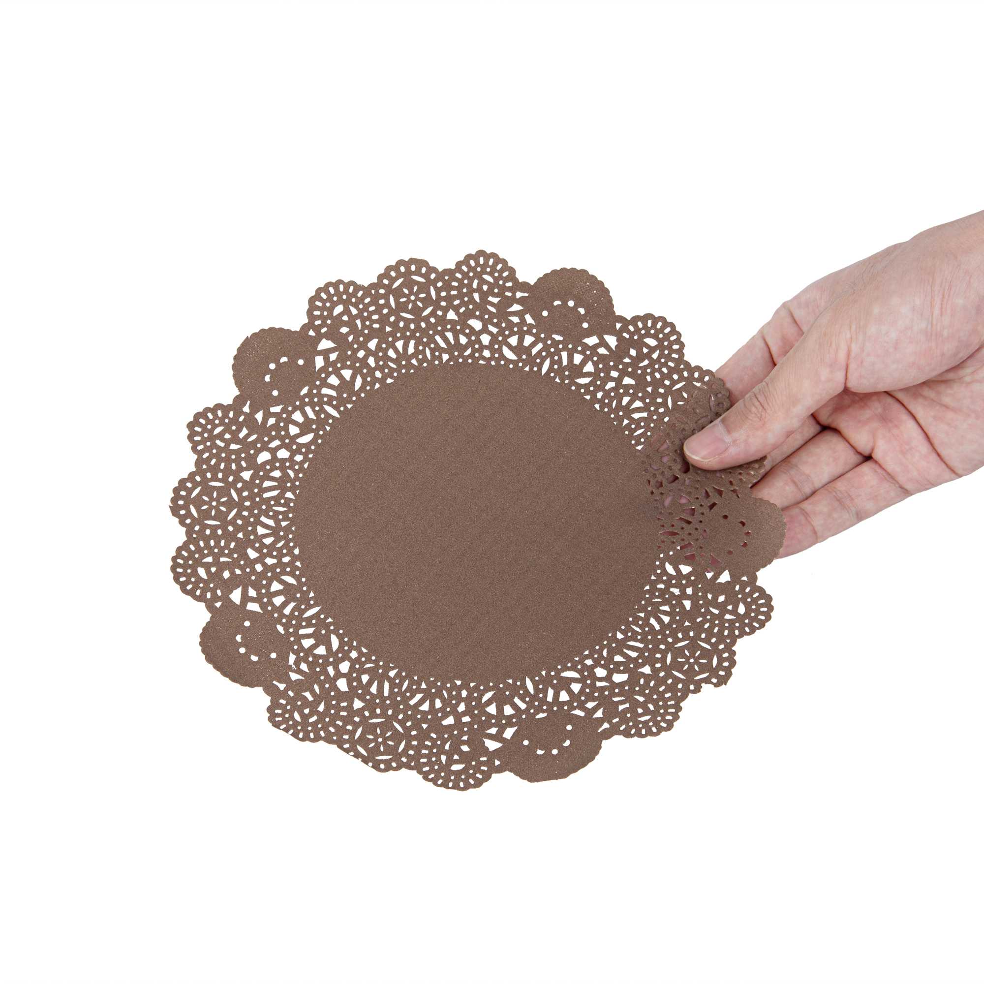 Enhance your dessert presentations with our Pastry Tek Round Brown Paper Doilies. Crafted from high-quality paper, these lace doilies provide durability while ensuring they don't tear or lose their structural integrity. With intricate lace-like details, these table doilies boost the visual appeal of food presentations and serve as functional barriers, protecting surfaces and absorbing moisture. The colored paper doilies feature a versatile brown finish, allowing them to complement a wide range of table settings and themes, making them an ideal choice for various events and occasions. Disposable by design, these small doilies eradicate the hassle of post-event cleanup, offering a convenient and time-saving solution for busy hosts and food establishments. These paper doilies add an elegant touch to your dessert displays, making them perfect for showcasing desserts at bakeries or catered luncheons. Measuring 8 inches in diameter, these lace doilies are perfect for use under cupcakes, petit fours, macarons, and other small treats. Sold in a 4,000 count box.