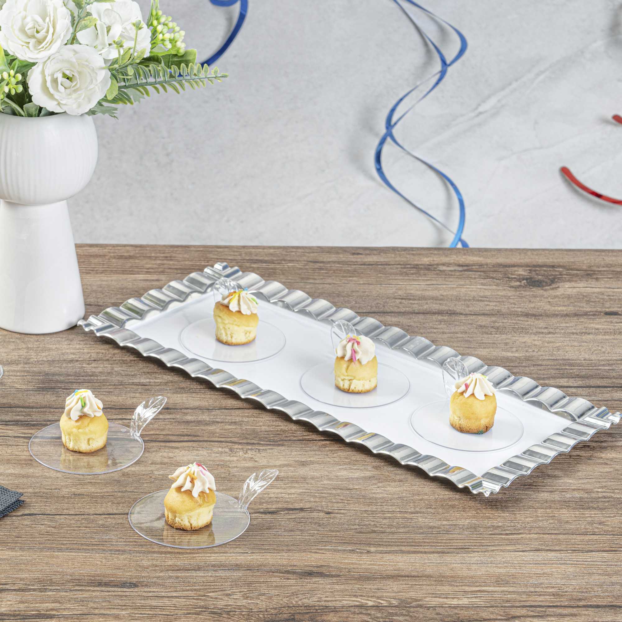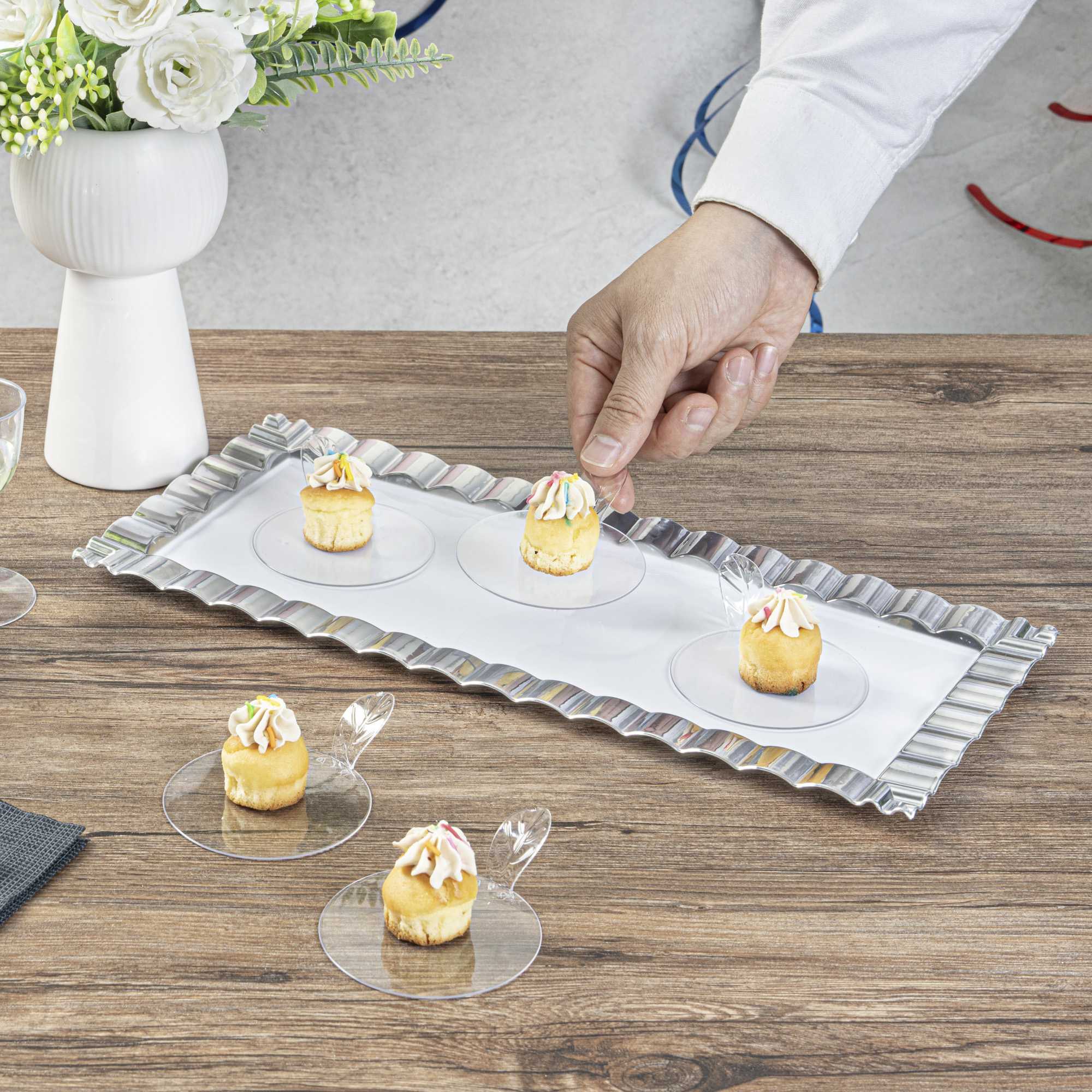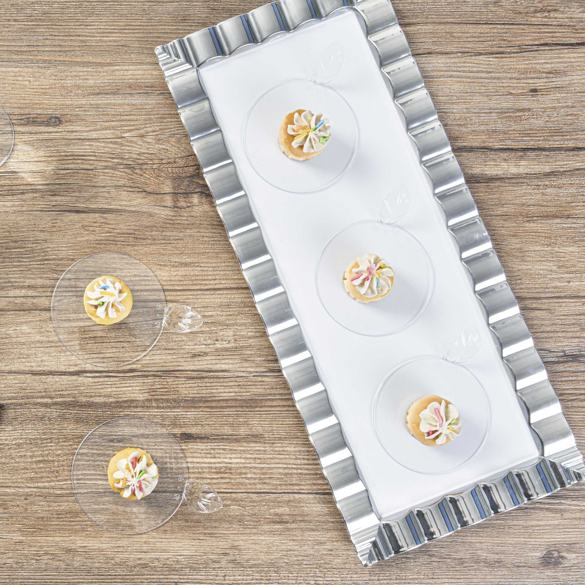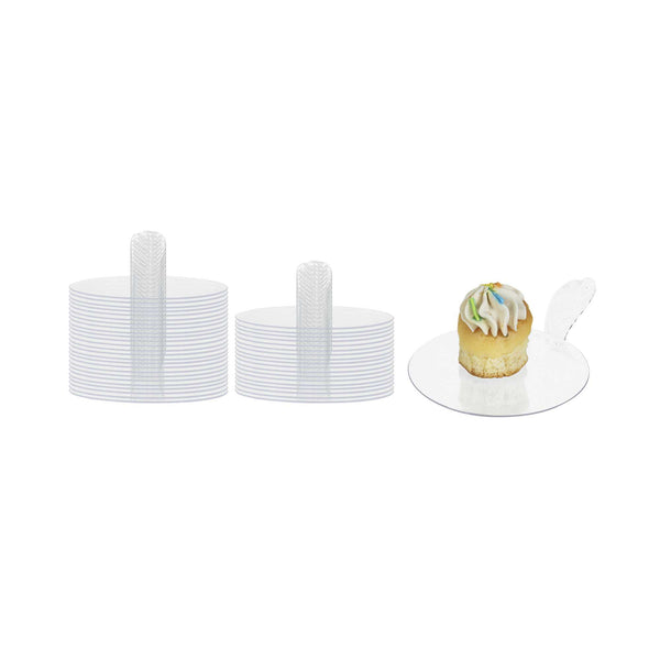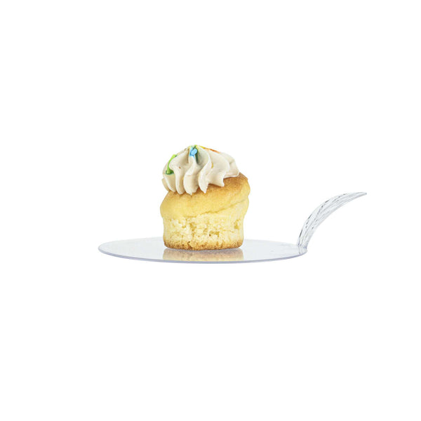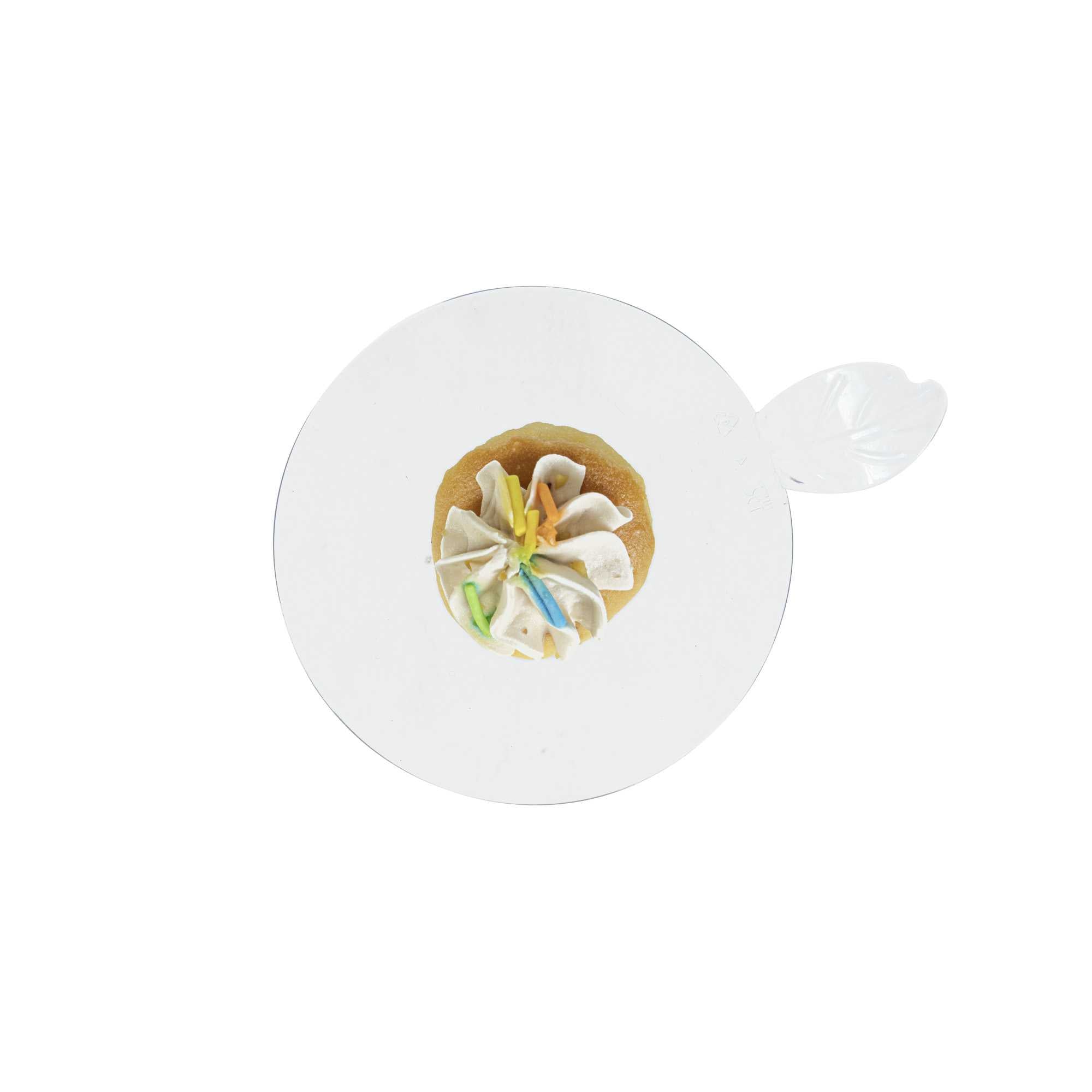 Present your delicious creations with our Pastry Tek Round Clear Plastic Pastry Pallets. Made from premium plastic, these dessert dishes come with a built-in handle designed with a leaf shape, ensuring seamless serving of macaroons, mini pies, cupcakes, and small cookies while adding a stylish look. The transparent finish of these dessert serving plates spotlights your delicacies, enhancing your confectionery display. These disposable dessert plates have a round shape for a minimalist look. Each plastic cupcake holder is disposable, making your post-party tidying a breeze. These pastry plates are ideal for showcasing your delectable delights at formal or casual occasions.. Each clear plastic plate is 3 inches in diameter by 1 inch in height. Shipped in a 100 count box.