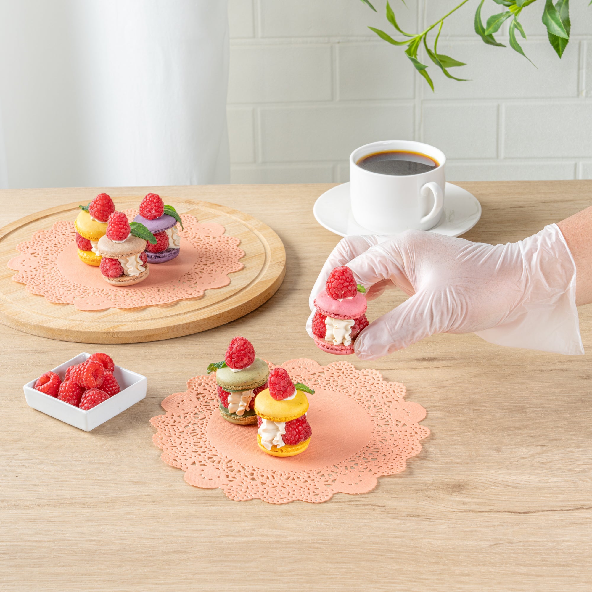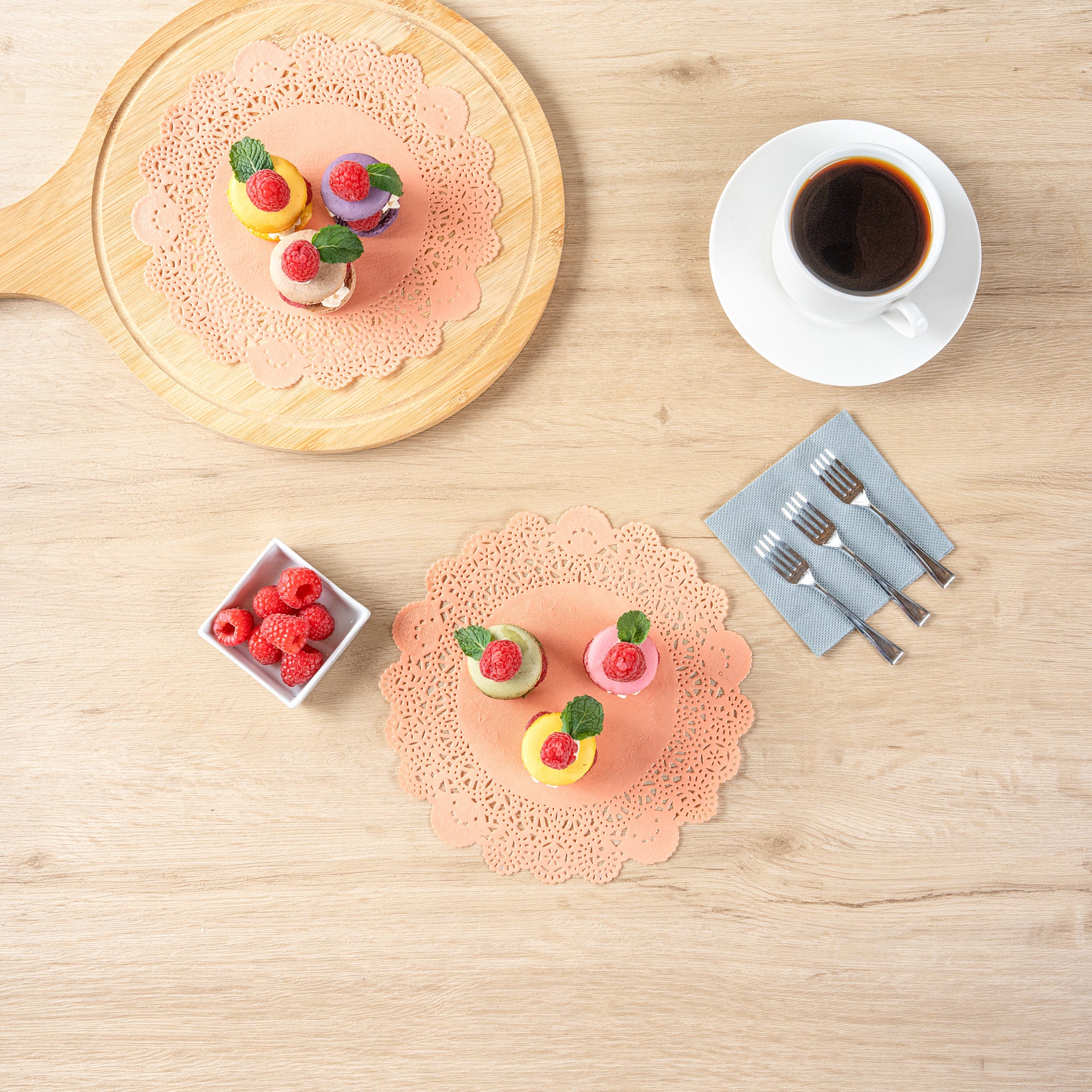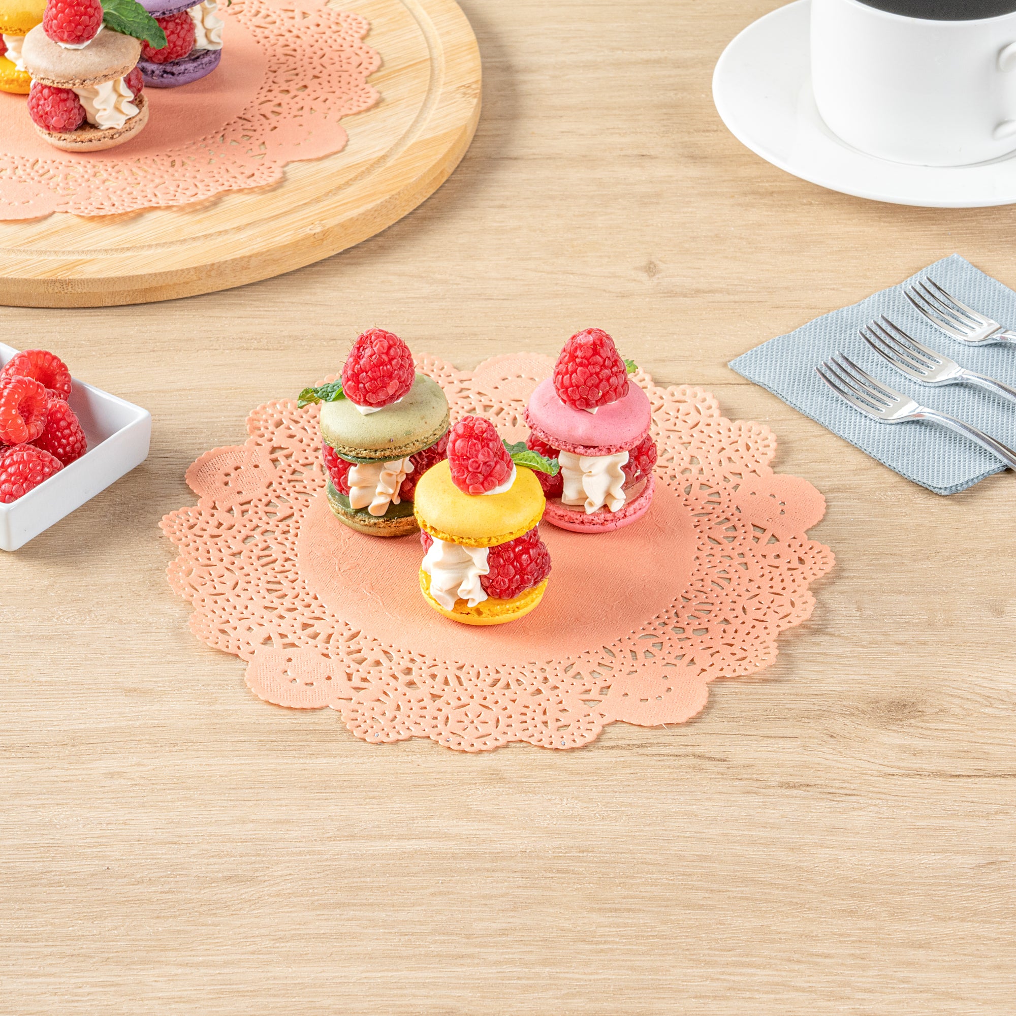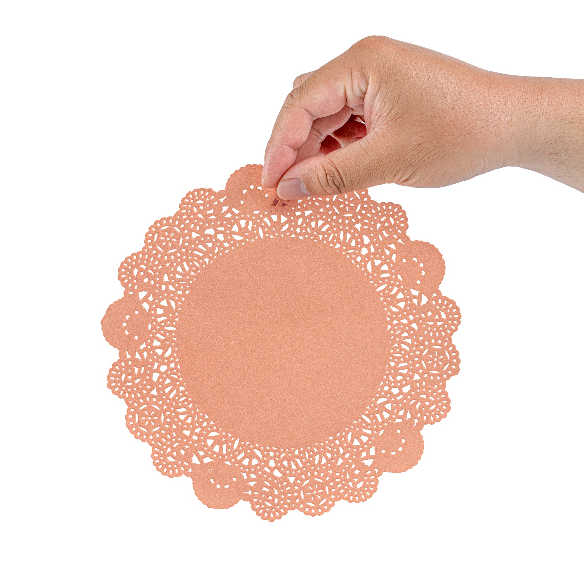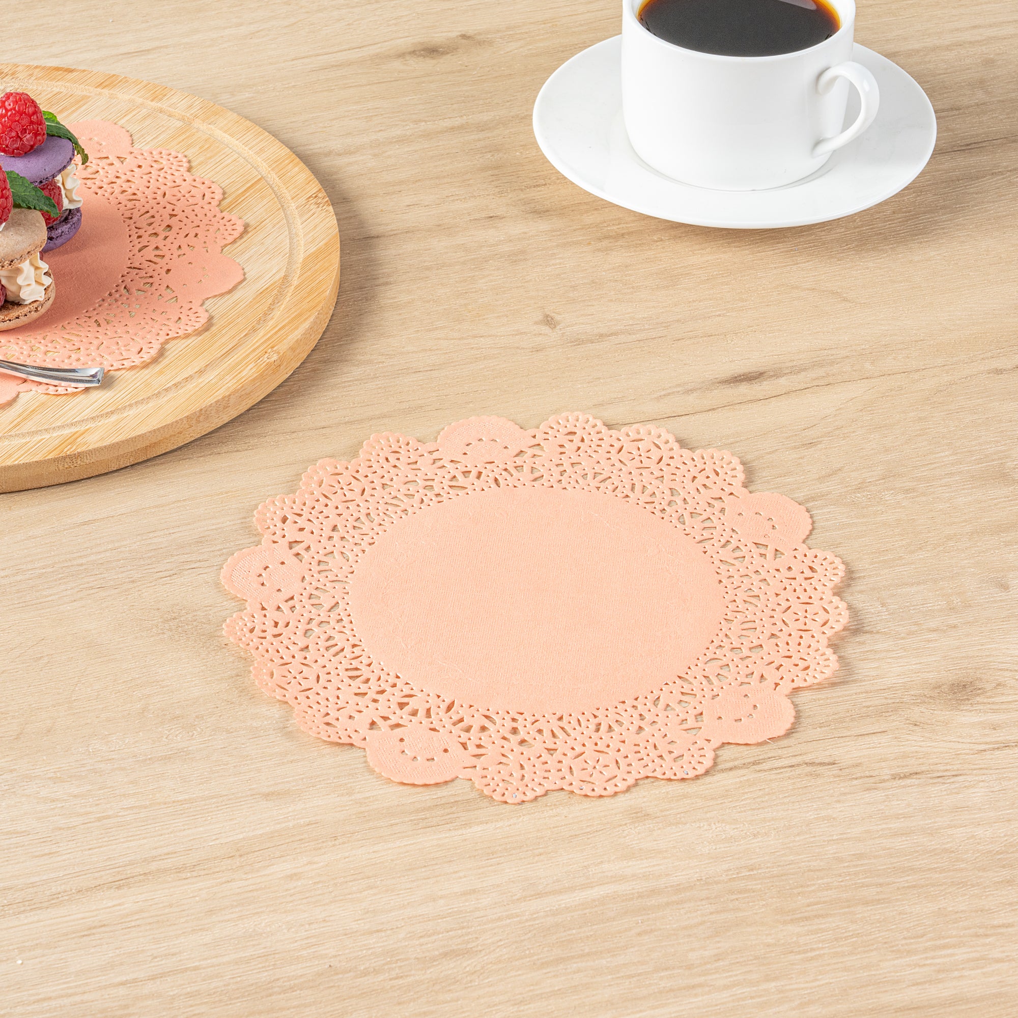Elevate your dessert displays with our Pastry Tek Round Coral Paper Doilies, perfect for adding an elegant touch to any presentation. Crafted from high-quality paper, these lace doilies provide unparalleled durability, ensuring your desserts remain intact without tearing. Featuring intricate lace-like details, these table doilies not only enhance the visual appeal of your food presentations but also serve as functional barriers, protecting surfaces and absorbing moisture. The coral colored paper doilies complement a wide range of table settings and themes, making them an ideal choice for various events and occasions. These small doilies are disposable, offering a convenient and time-saving solution for busy hosts and food establishments, eliminating the hassle of post-event cleanup. Use these lace doilies under cupcakes, petit fours, macarons, and other small treats to impress your guests. Measuring 8 inches in diameter, these paper doilies fit perfectly into your display settings. Sold in a 100 count box.