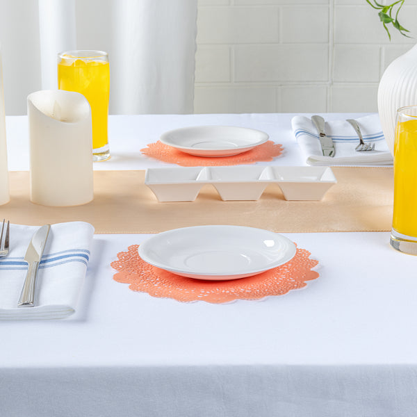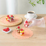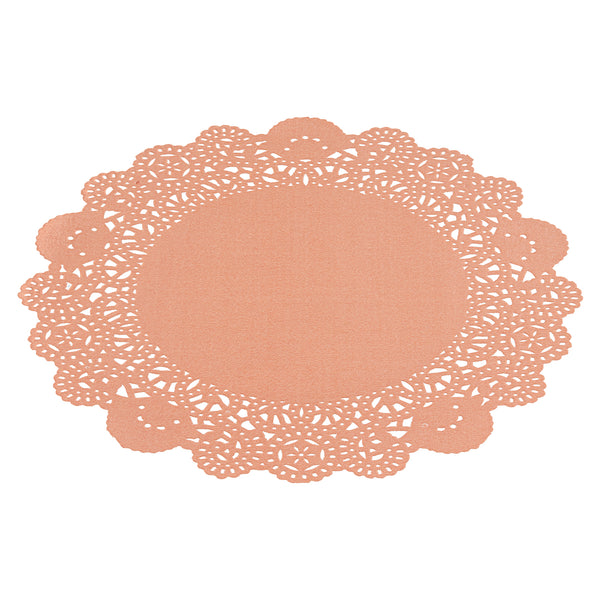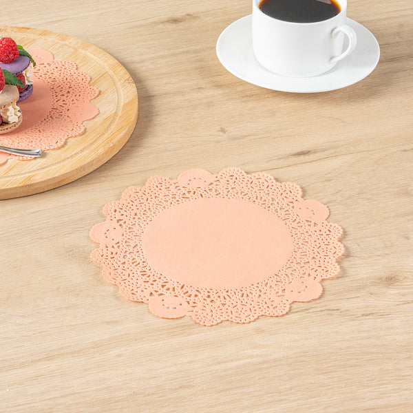 Elevate your dessert displays with our Pastry Tek Round Coral Paper Doilies, perfect for adding an elegant touch to any presentation. Crafted from high-quality paper, these lace doilies provide unparalleled durability, ensuring your desserts remain intact without tearing. Featuring intricate lace-like details, these table doilies not only enhance the visual appeal of your food presentations but also serve as functional barriers, protecting surfaces and absorbing moisture. The coral colored paper doilies complement a wide range of table settings and themes, making them an ideal choice for various events and occasions. These small doilies are disposable, offering a convenient and time-saving solution for busy hosts and food establishments, eliminating the hassle of post-event cleanup. Use these lace doilies under cupcakes, petit fours, macarons, and other small treats to impress your guests. Measuring 8 inches in diameter, these paper doilies fit perfectly into your display settings. Sold in a 4,000 count box.
