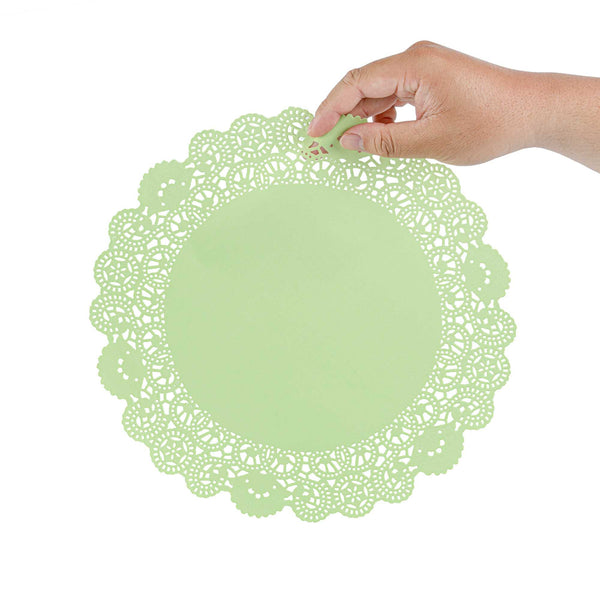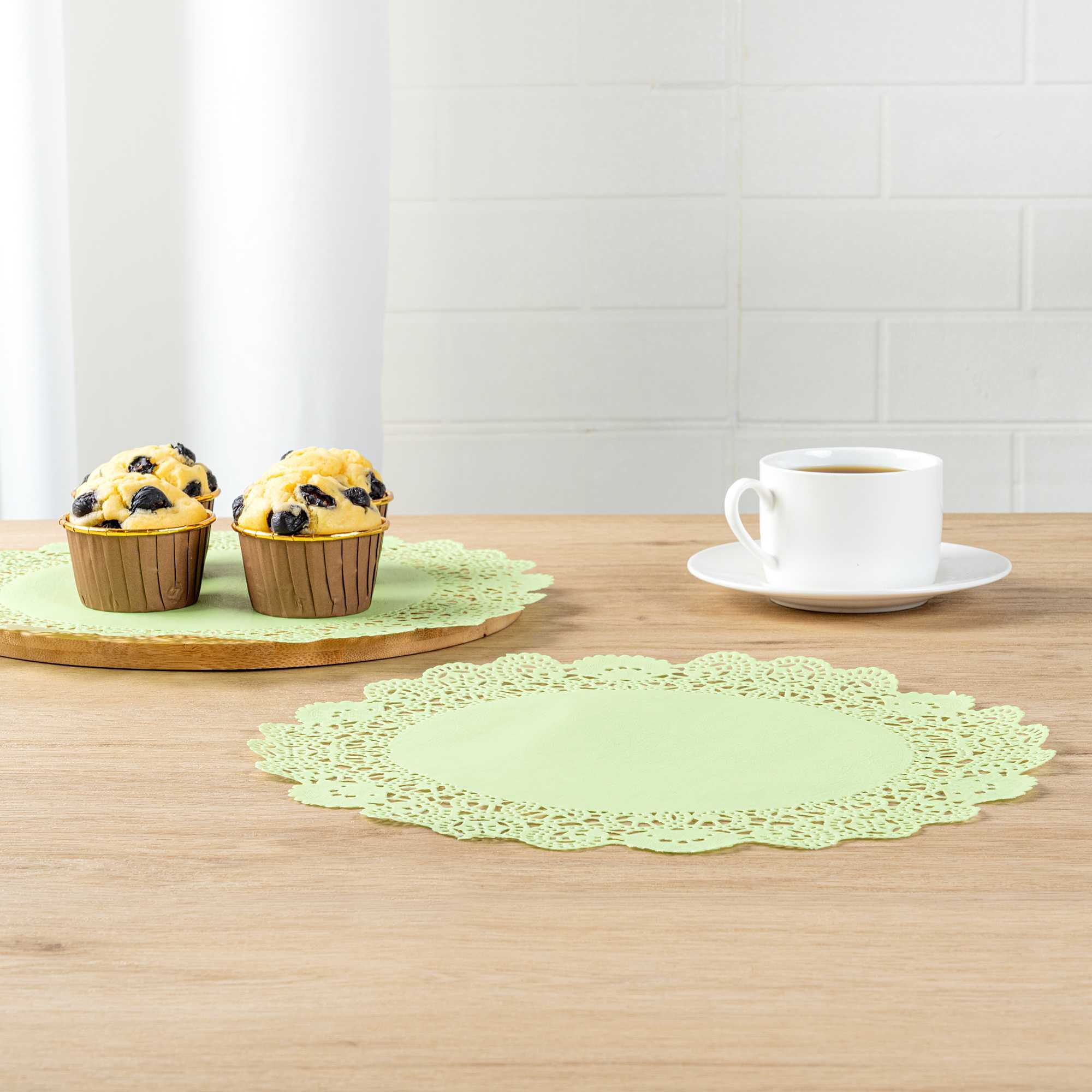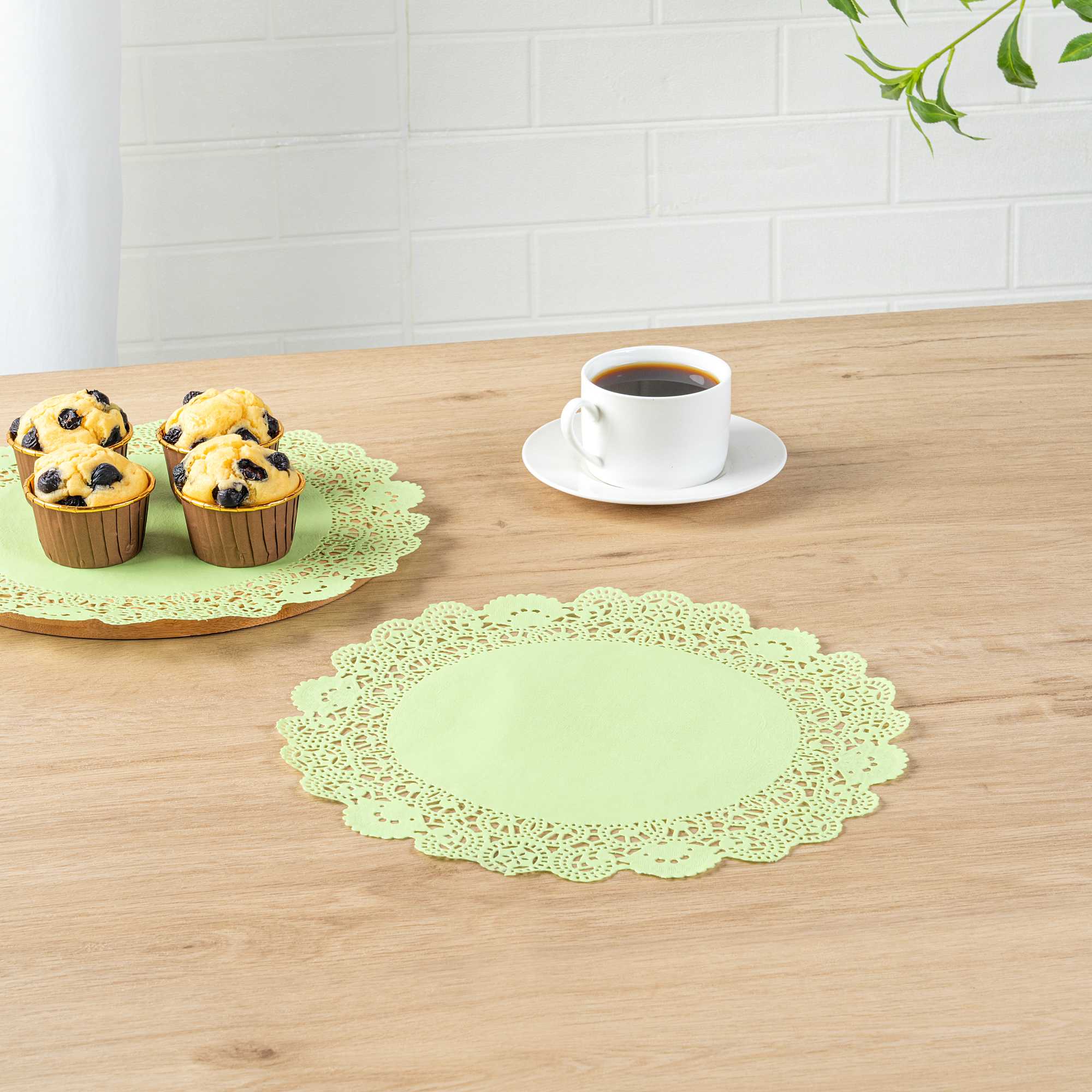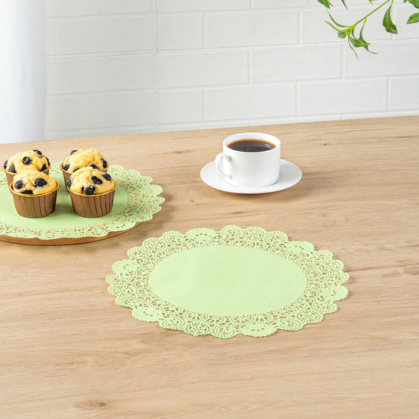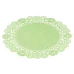 Elevate your dessert displays with our Pastry Tek Round Green Paper Doilies. These paper doilies add an elegant touch to any table setting, making them perfect for showcasing desserts at bakeries or catered luncheons. Crafted from high-quality paper, these table doilies provide durability without tearing or losing their structural integrity. Featuring intricate lace-like details, these lace doilies not only increase the visual appeal of food presentations but also serve as functional barriers by protecting surfaces and absorbing moisture. The green colored finish of these doilies is versatile, allowing them to complement a wide range of table settings and themes, making them an ideal choice for various events and occasions. With their disposable nature, these colored paper doilies eradicate the hassle of post-event cleanup, offering a convenient and time-saving solution for busy hosts and food establishments. Measuring 12 inches in diameter, these small doilies can be used under cupcakes, petit fours, macarons, and other small treats. Sold in a 4,000 count box.