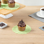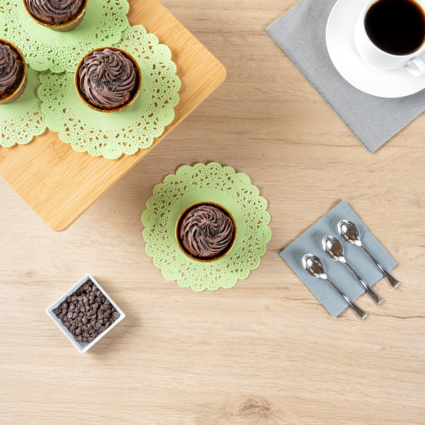 Elevate your dessert presentations with our Pastry Tek Round Green Paper Doilies. These paper doilies add an elegant touch to your dessert displays, making every treat look more enticing. Crafted from high-quality paper, these lace doilies provide durability while displaying desserts at bakeries or catered luncheons without tearing or losing their structural integrity. With their intricate lace-like details, these table doilies increase the visual appeal of food presentations while serving as functional barriers, protecting surfaces, and absorbing moisture. The green finish of these colored paper doilies is versatile, allowing them to complement a wide range of table settings and themes, making them an ideal choice for various events and occasions. Additionally, these disposable doilies eradicate the hassle of post-event cleanup, offering a convenient and time-saving solution for busy hosts and food establishments. Measuring 6 inches in diameter, these small doilies are perfect for use under cupcakes, petit fours, macarons, and other small treats. Sold in a 100 count box.