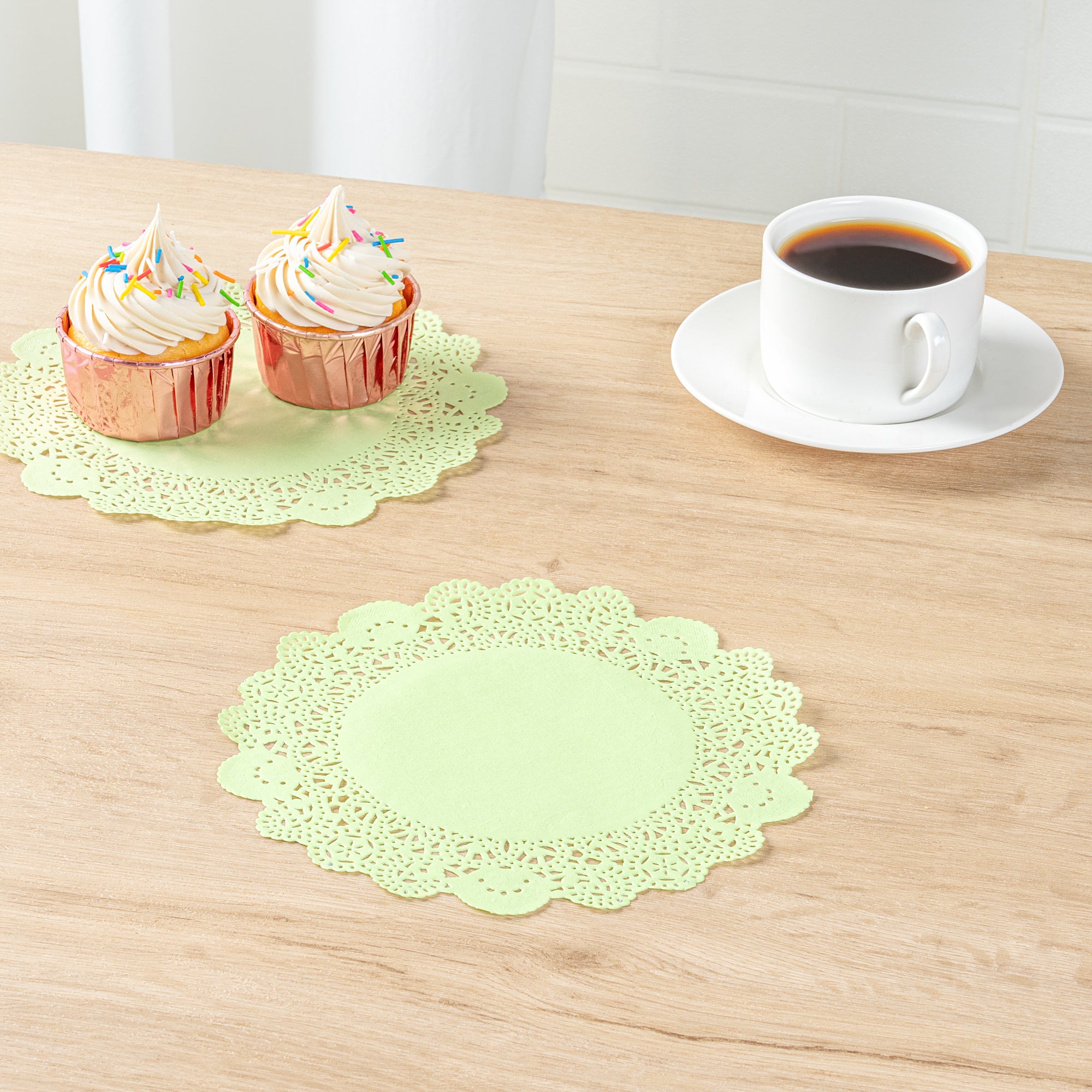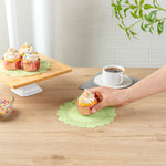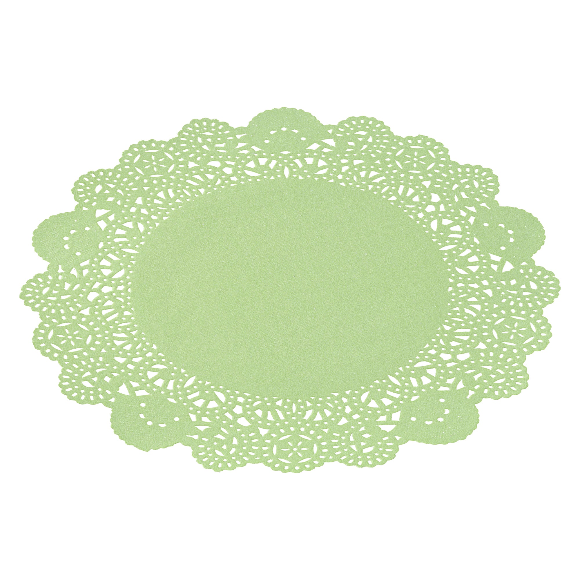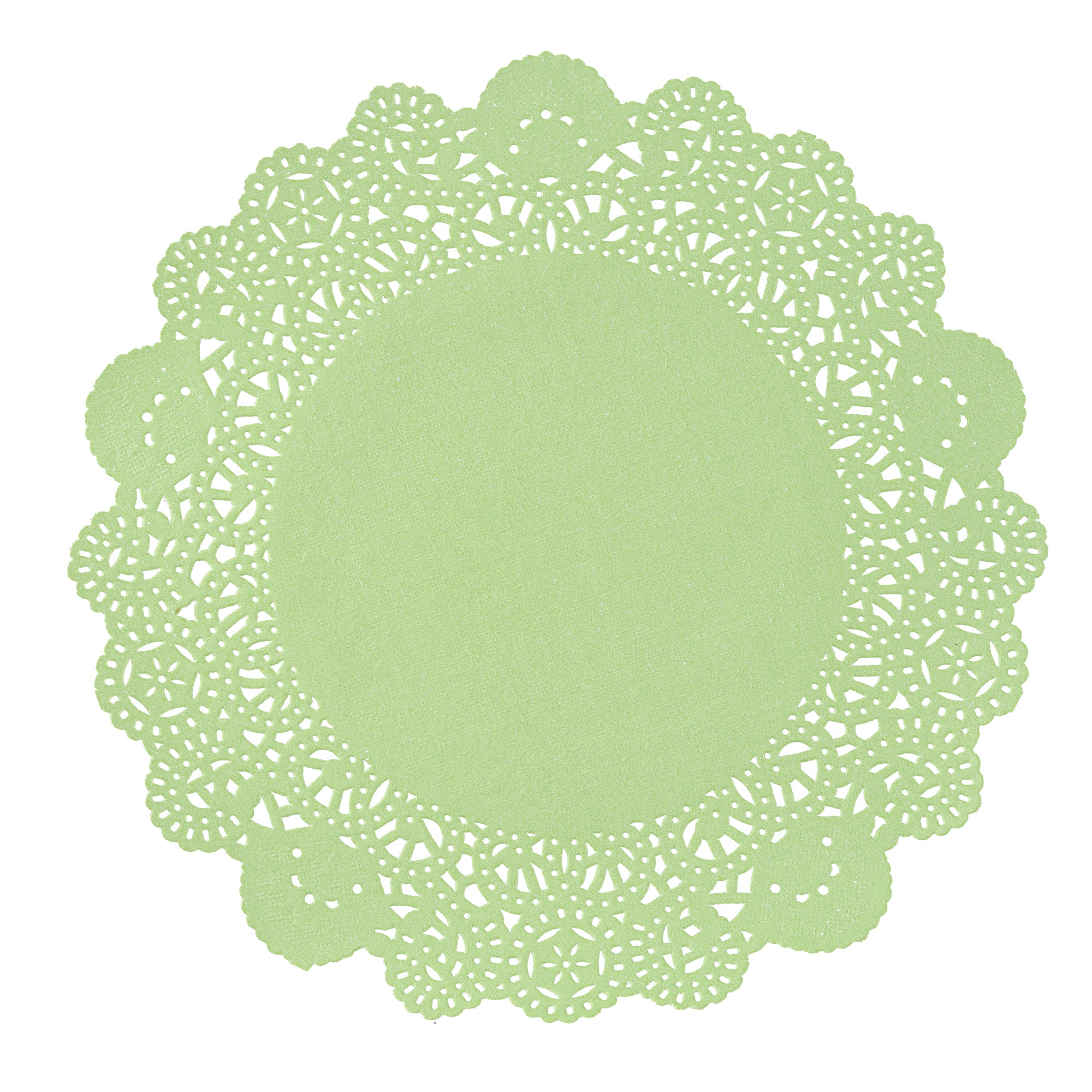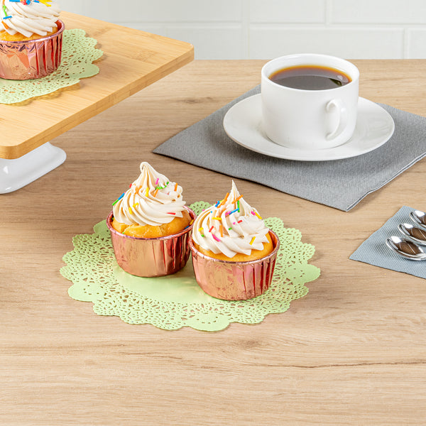 Enhance your dessert displays with our Pastry Tek Round Green Paper Doilies. Crafted from durable paper, these lace doilies showcase desserts at bakeries or catered luncheons without tearing. The intricate lace-like details increase the visual appeal of food presentations while serving as functional barriers, protecting surfaces and absorbing moisture. These colored paper doilies are versatile, complementing a wide range of table settings and themes, making them an ideal choice for various events and occasions. Disposable by design, these table doilies eradicate the hassle of post-event cleanup, offering a convenient and time-saving solution for busy hosts and food establishments. Small doilies like these can be used under cupcakes, petit fours, macarons, and other small treats. These high-quality paper doilies add an elegant touch to any table setting. Measuring 8 inches in length and width, these lace doilies fit perfectly under a variety of desserts. Sold in a 4,000 count box.