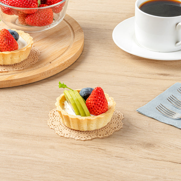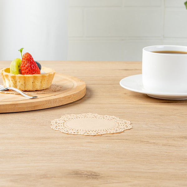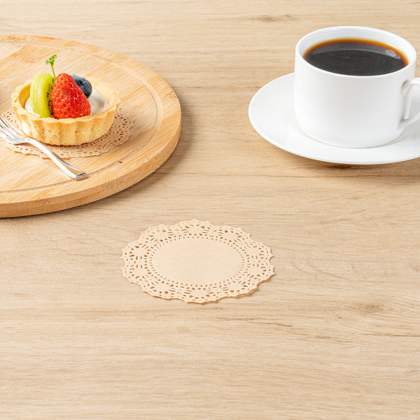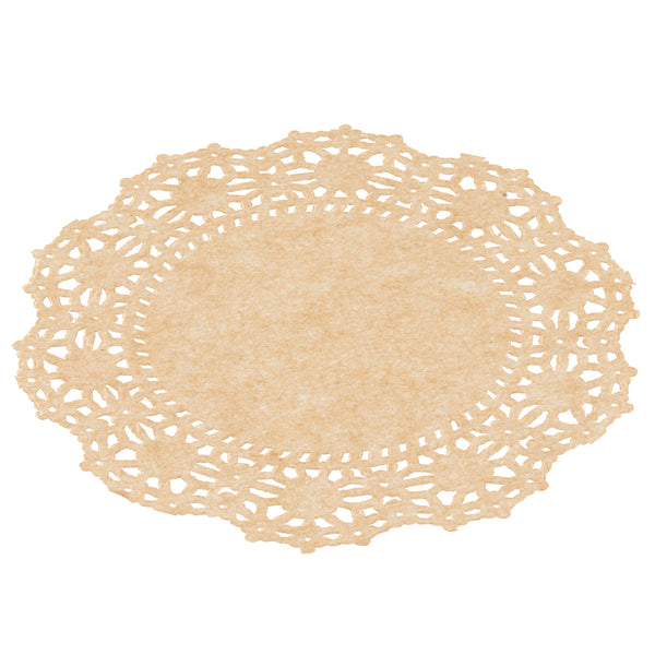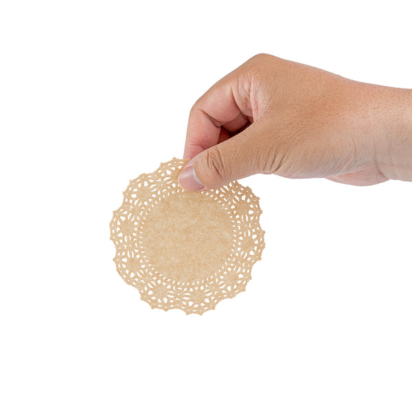 Enhance your dessert displays with our Pastry Tek Round Kraft Paper Doilies, adding a touch of elegance to any presentation. Crafted from high-quality paper, these durable lace doilies showcase double chocolate brownies at bakeries or catered luncheons without tearing or losing their structural integrity. Featuring intricate lace-like details, these table doilies increase the visual appeal of food presentations while serving as functional barriers that protect surfaces and absorb moisture. Their specific colored finish is versatile, ensuring that these colored paper doilies seamlessly complement a wide range of table settings and themes, making them ideal for various events and occasions. Designed for convenience, these disposable doilies eradicate the hassle of post-event cleanup, offering a time-saving solution for busy hosts and food establishments. Perfect for use under cupcakes, petit fours, macarons, and other small treats, these small doilies measure 4 inches in diameter. Sold in a 100 count box.