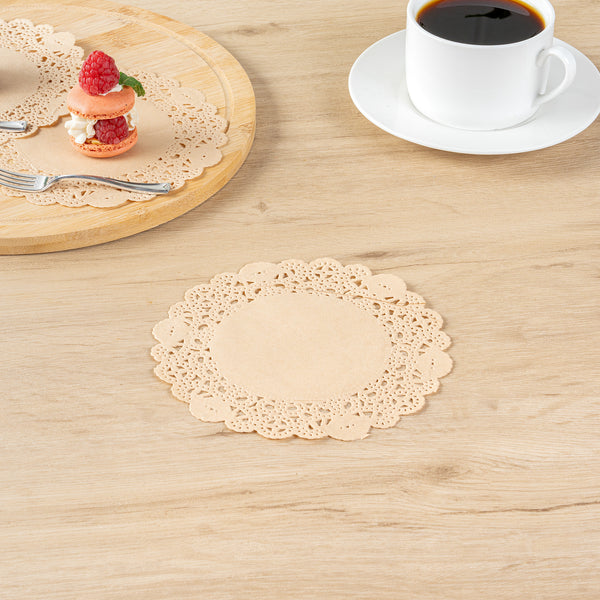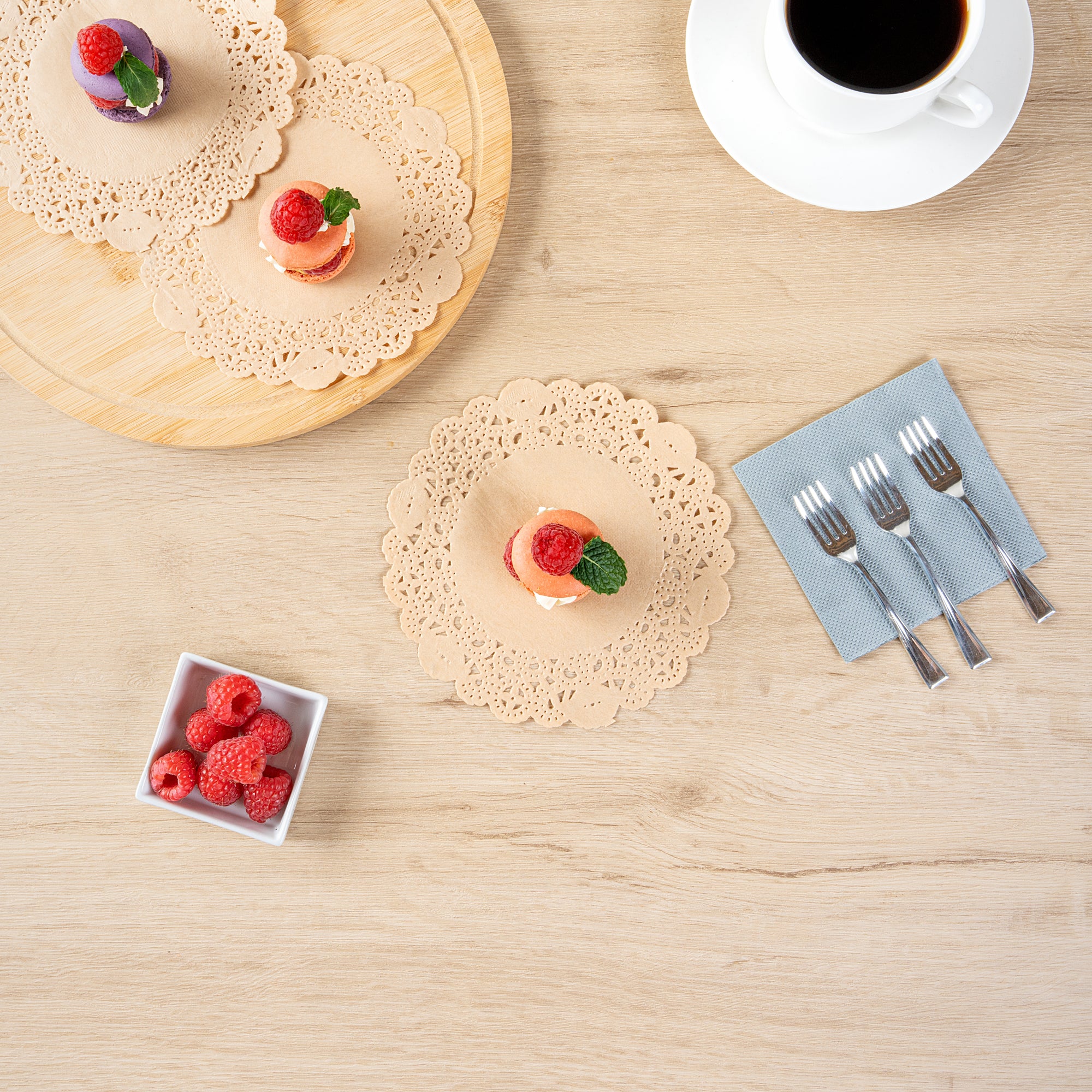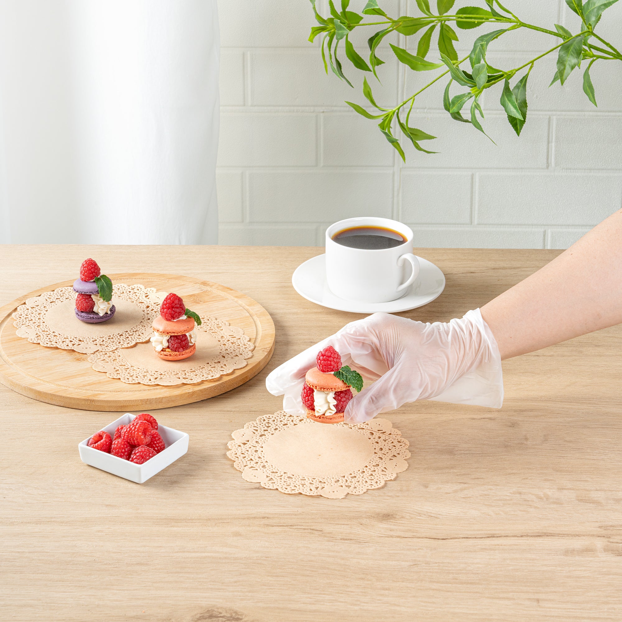 Elevate your presentations with elegant kraft paper doilies. Pastry Tek Elegant Presentation Kraft Paper Doilies showcase an intricate lace design that enhances the visual appeal of your baked goods and table settings, adding sophistication to any event. With a 6-inch round size, these lace paper doilies are ideal for displaying various pastries and cakes, accommodating diverse portion sizes seamlessly. Crafted from eco-friendly kraft paper, they provide a rustic aesthetic that resonates with environmentally conscious consumers. Their absorbent nature helps preserve the freshness of pastries, ensuring quality from kitchen to table. The disposable design of these decorative doilies for tables simplifies cleanup, making them perfect for high-volume foodservice events, reducing waste effortlessly. Meet your operational needs with ease; each order includes 4000 Pastry Tek Elegant Presentation Kraft Paper Doilies.