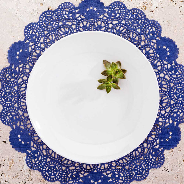 Discover elegant pastry presentation with our Pastry Tek Navy Blue Paper Doilies. These navy blue lace doilies are crafted from premium paper for superior durability. The circular design with lace-like details of these paper doilies significantly enhance the visual appeal of any food presentation. To ensure delectable treats retain their freshness, these navy blue paper doilies absorb excess moisture to provide a clean dessert display. These round doilies have a classy navy blue finish exudes elegance and suitable for a wide range of themes and styles of parties, events, or occasions. Each 12-inch doily is disposable and can be simply discarded for an effortless cleanup. Measuring 12 inches in diameter, these lace doilies provides a luxurious foundation for a wide range of pastry and bakery items. Shipped in a 4,000 count box.