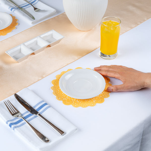 Elevate your dessert presentations with our Pastry Tek Round Orange Paper Doilies. Crafted from high-quality paper, these lace doilies provide durability and elegance, ensuring that desserts at bakeries or catered luncheons remain intact without tearing. Featuring intricate lace-like details, these table doilies not only enhance the visual appeal of your food displays but also serve as functional barriers, protecting surfaces and absorbing moisture. The vibrant orange finish of these colored paper doilies makes them versatile enough to complement a wide range of table settings and themes, perfect for various events and occasions. Designed to be disposable, these small doilies eradicate the hassle of post-event cleanup, offering a convenient and time-saving solution for busy hosts and food establishments. Measuring 8 inches in diameter, these lace doilies are ideal for use under cupcakes, petit fours, macarons, and other small treats. Sold in a 4,000 count box.