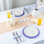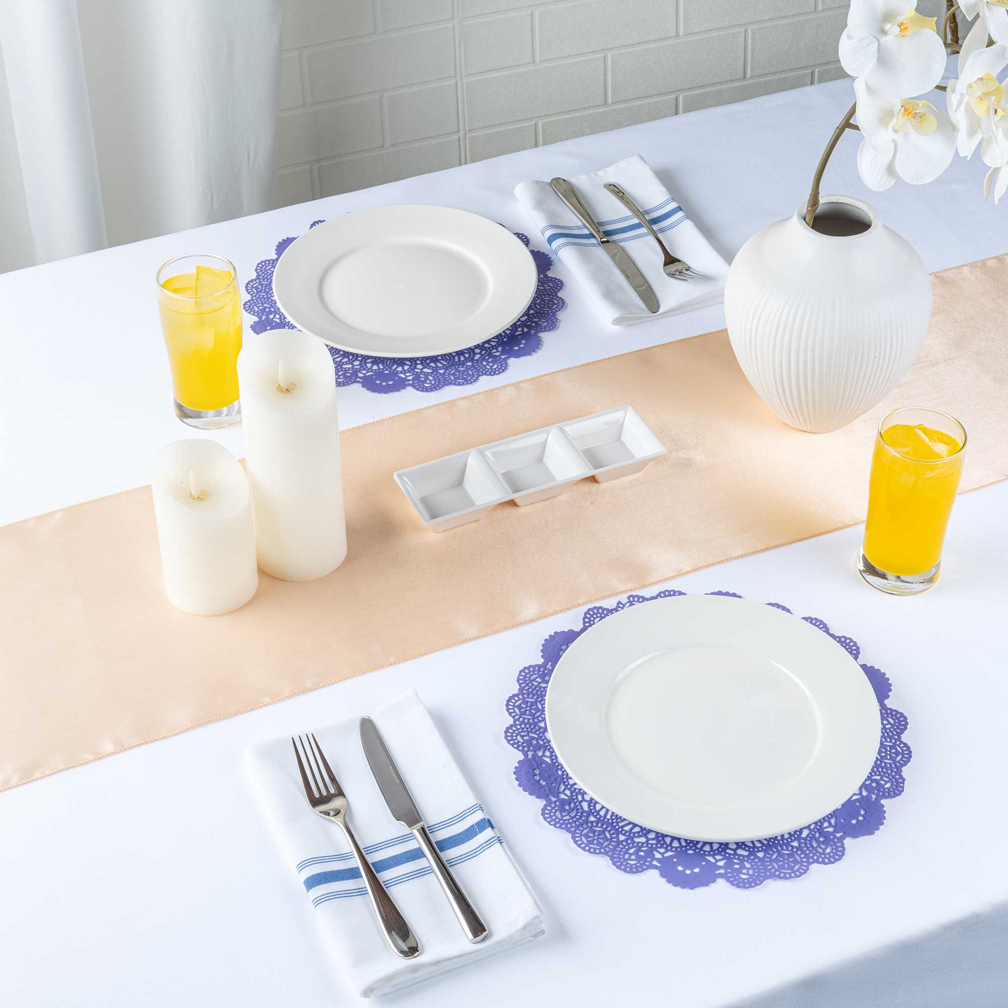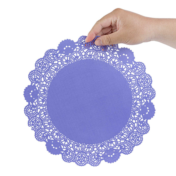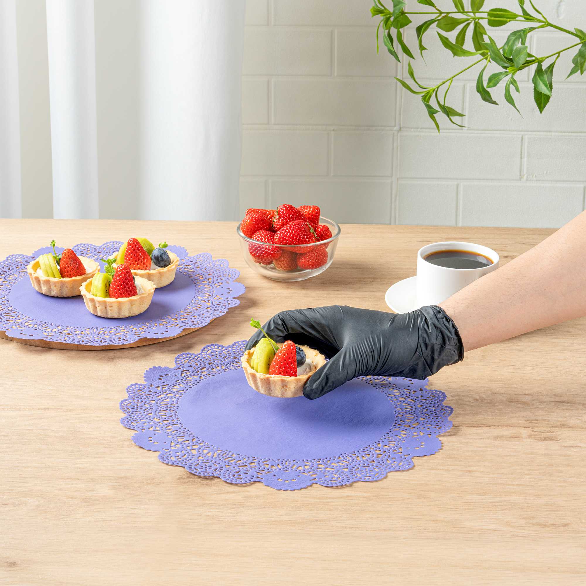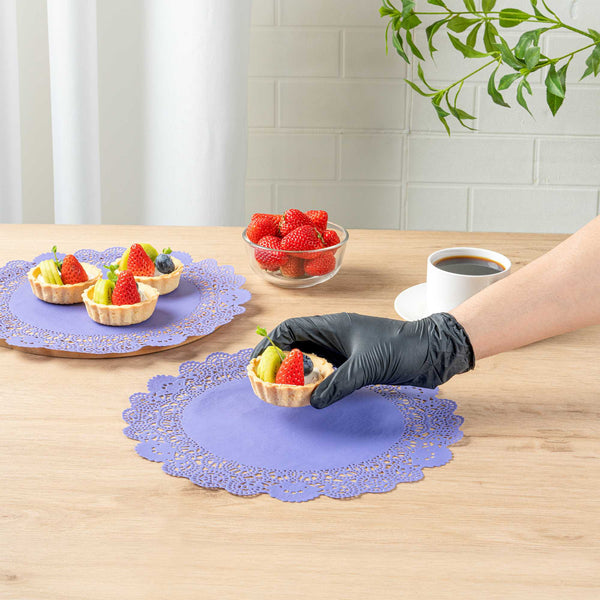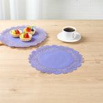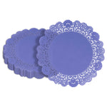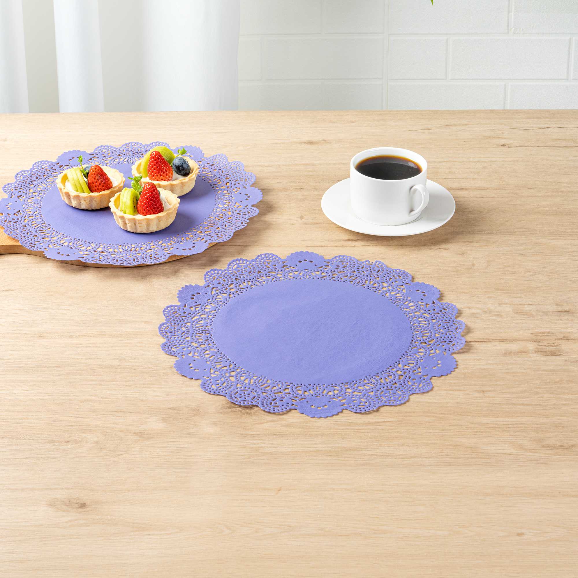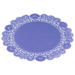 Enhance your dessert displays with our Pastry Tek Round Purple Paper Doilies, perfect for adding an elegant touch to any event. Crafted from high-quality paper, these lace doilies ensure durability while showcasing desserts at bakeries or catered luncheons without tearing or losing their structural integrity. Featuring intricate lace-like details, these table doilies not only enhance the visual appeal of food presentations but also serve as functional barriers, protecting surfaces and absorbing moisture. The specific purple finish of these colored paper doilies is versatile, allowing them to complement a wide range of table settings and themes, making them ideal for various events and occasions. Designed to be disposable, these small doilies eradicate the hassle of post-event cleanup, offering a convenient and time-saving solution for busy hosts and food establishments. Measuring 12 inches in diameter, these lace doilies are the perfect size for under cupcakes, petit fours, macarons, and other small treats. Sold in a 4,000 count box.