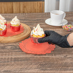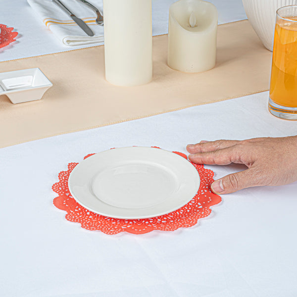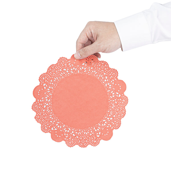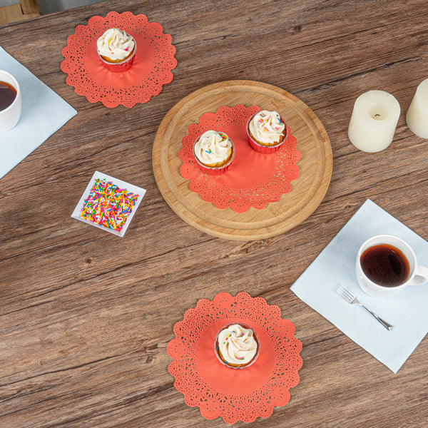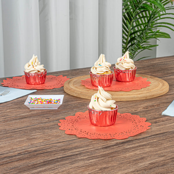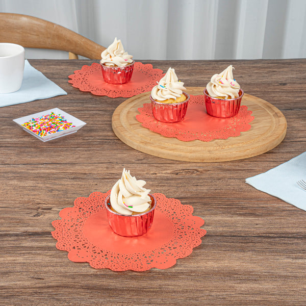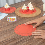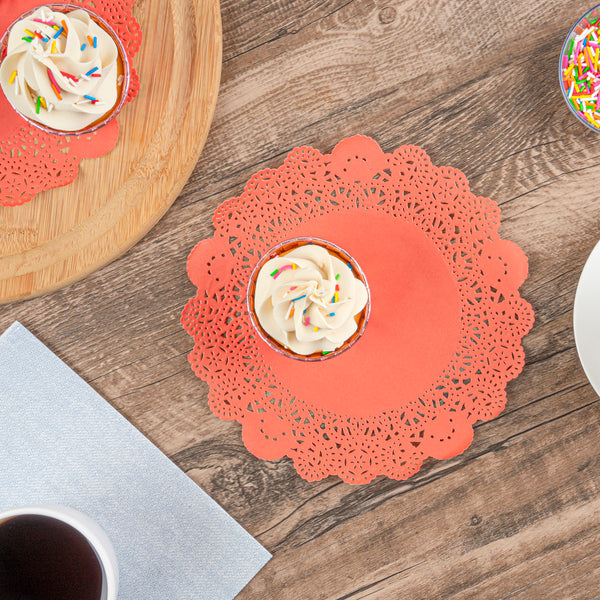 Enhance any dining experience with elegant, disposable decor. Pastry Tek Lace Design Paper Doilies with their intricate lace-like details elevate the visual appeal of food presentations, making them ideal for caterers and bakers using paper doilies for events. The vibrant red color of these lace paper doilies adds a festive touch to themed events, transforming ordinary table settings into standout displays. Measuring 8 inches in diameter, they are versatile enough to accommodate a range of plate sizes, whether you're serving cold or hot dishes. Upgrade your table presentations and impress guests with these versatile doilies that are both cold and hot food friendly, perfect for diverse menu items. Invest in a solution that combines elegance with practicality, perfect for catering and restaurant environments. Each order includes 4000 Pastry Tek Lace Design Paper Doilies.