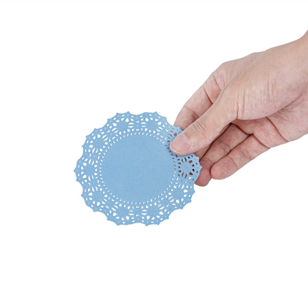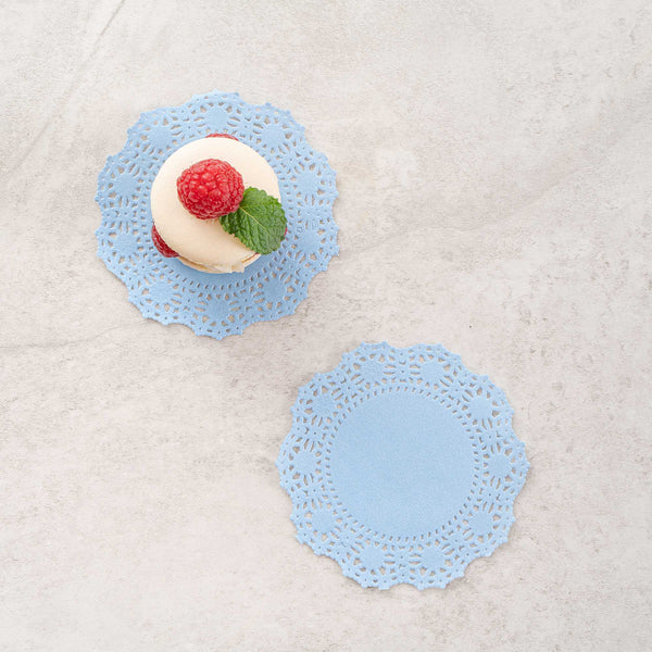Enhance your dessert displays with our Pastry Tek Round Sky Blue Paper Doilies, perfect for adding an elegant touch. Crafted from high-quality paper, these table doilies provide durability while showcasing double chocolate brownies at bakeries or catered luncheons without tearing or losing their structural integrity. Featuring intricate lace-like details, these lace doilies increase the visual appeal of food presentations while serving as functional barriers that protect surfaces and absorb moisture. The specific colored paper doilies finish is versatile, allowing them to complement a wide range of table settings and themes, making them an ideal choice for various events and occasions. Designed to be disposable, these small doilies eradicate the hassle of post-event cleanup, offering a convenient and time-saving solution for busy hosts and food establishments. Perfect for use under cupcakes, petit fours, macarons, and other small treats, these lace doilies measure 4 inches in diameter. Sold in a 100 count box.