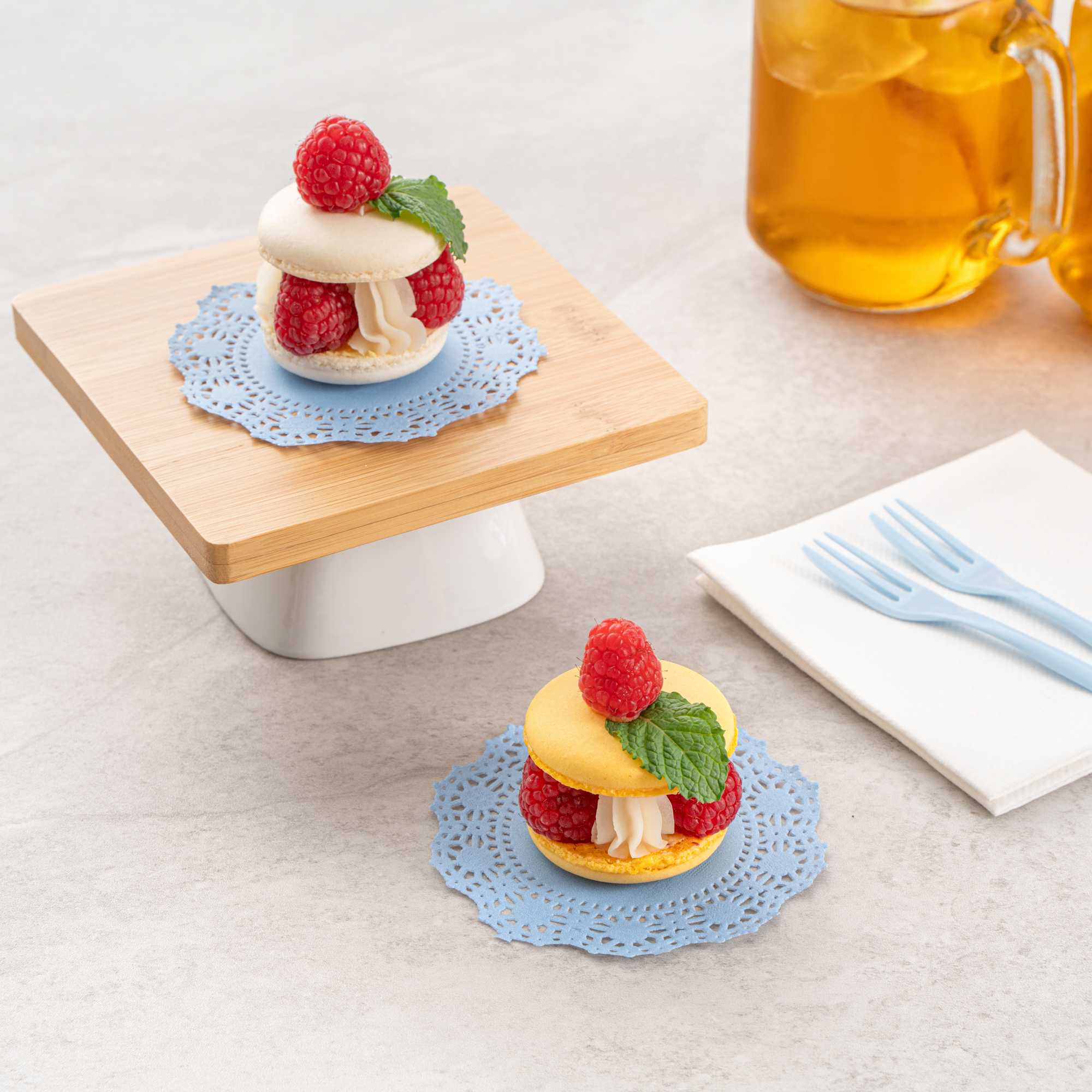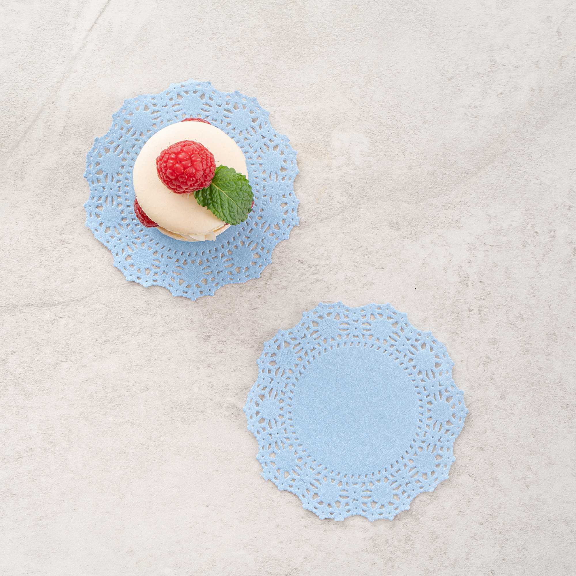 Elevate your dessert displays with our Pastry Tek Round Sky Blue Paper Doilies, designed to add an elegant touch to any setting. Crafted from high-quality paper, these lace doilies provide exceptional durability, ensuring your double chocolate brownies remain intact at bakeries or catered luncheons. Featuring intricate, lace-like details, these table doilies not only enhance the visual appeal of your food presentations but also serve as functional barriers that protect surfaces and absorb moisture. The versatile colored finish of these paper doilies allows them to seamlessly complement a wide range of table settings and themes, making them perfect for various events and occasions. These small doilies are disposable, eliminating the hassle of post-event cleanup and offering a convenient solution for busy hosts and food establishments. Ideal for placing under cupcakes, petit fours, macarons, and other small treats, these colored paper doilies ensure your desserts stand out. Measuring 4 inches in diameter, these lace doilies fit snugly under your sweet creations. Sold in a 4,000 count box.