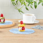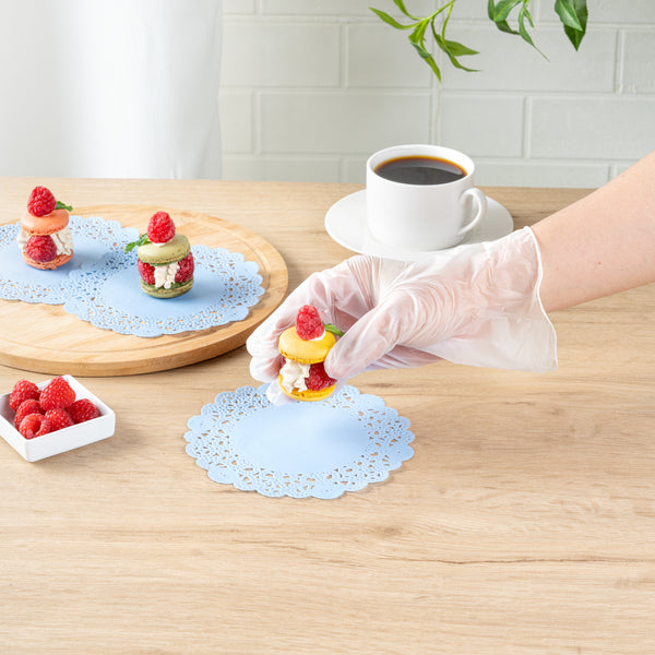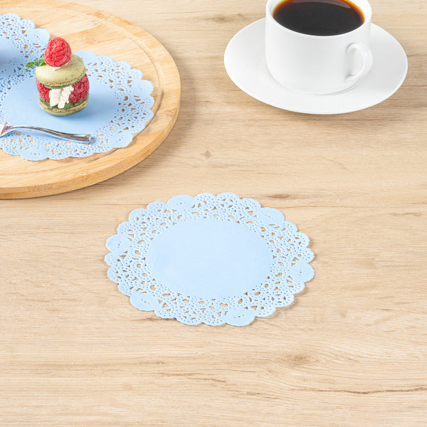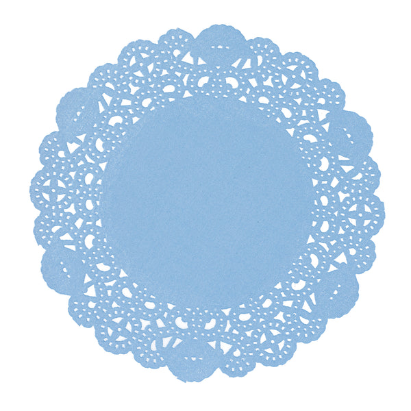 Elevate your dessert presentations with our Pastry Tek Round Sky Blue Paper Doilies. Adding an elegant touch to your dessert displays, these lace doilies enhance the visual appeal of your bakery's offerings. Crafted from high-quality paper, these table doilies provide durability while showcasing desserts without tearing or losing their structural integrity. With intricate lace-like details, these colored paper doilies serve as functional barriers, protecting surfaces and absorbing moisture efficiently. The versatile sky blue finish of these small doilies complements a wide range of table settings and themes, making them perfect for various events and occasions. Disposable by design, these paper doilies eradicate the hassle of post-event cleanup, offering a convenient and time-saving solution for busy hosts and food establishments. Measuring 6 inches in diameter, these lace doilies are ideal for use under cupcakes, petit fours, macarons, and other small treats. Sold in a 100 count box.