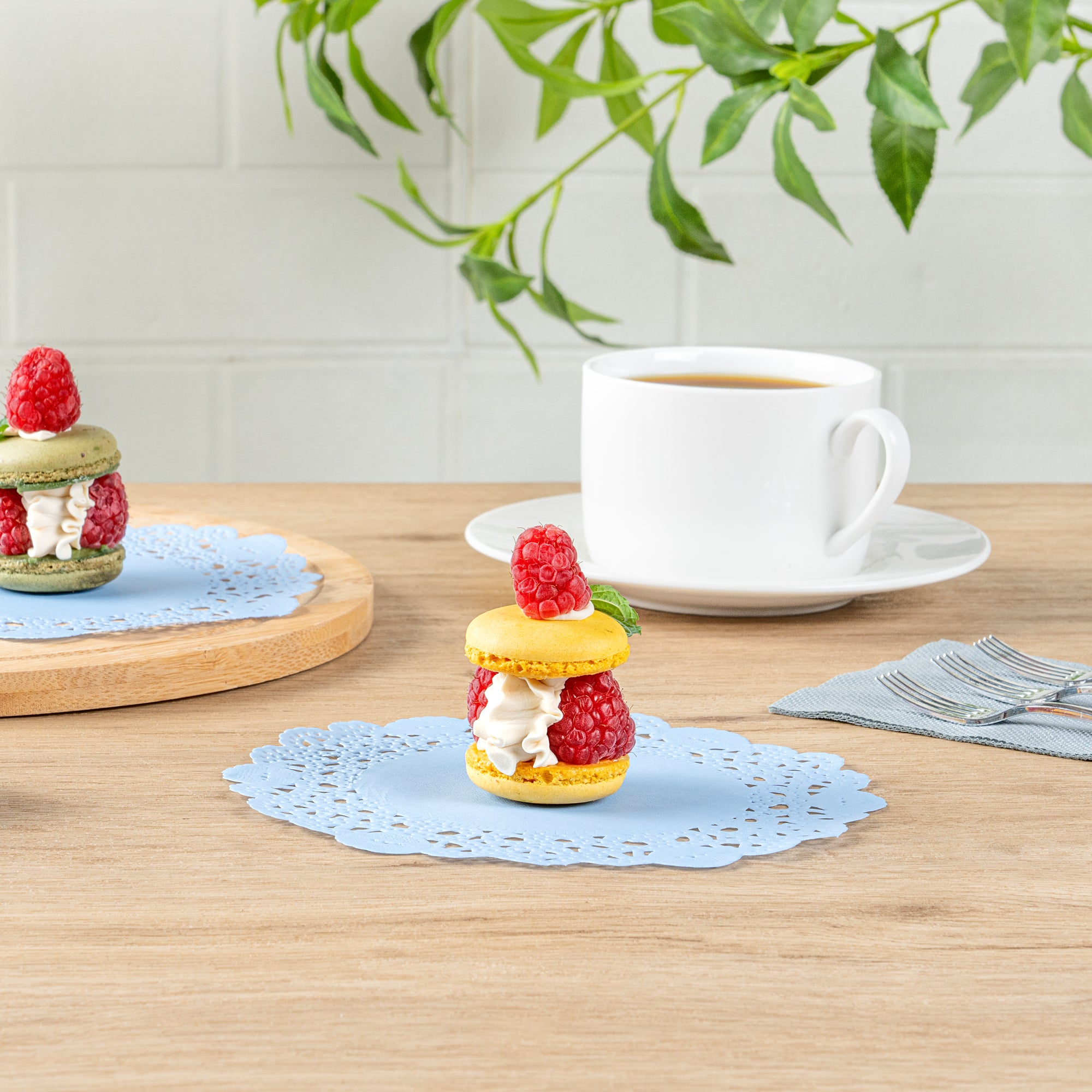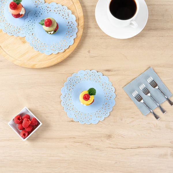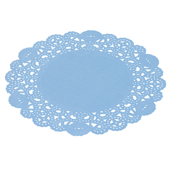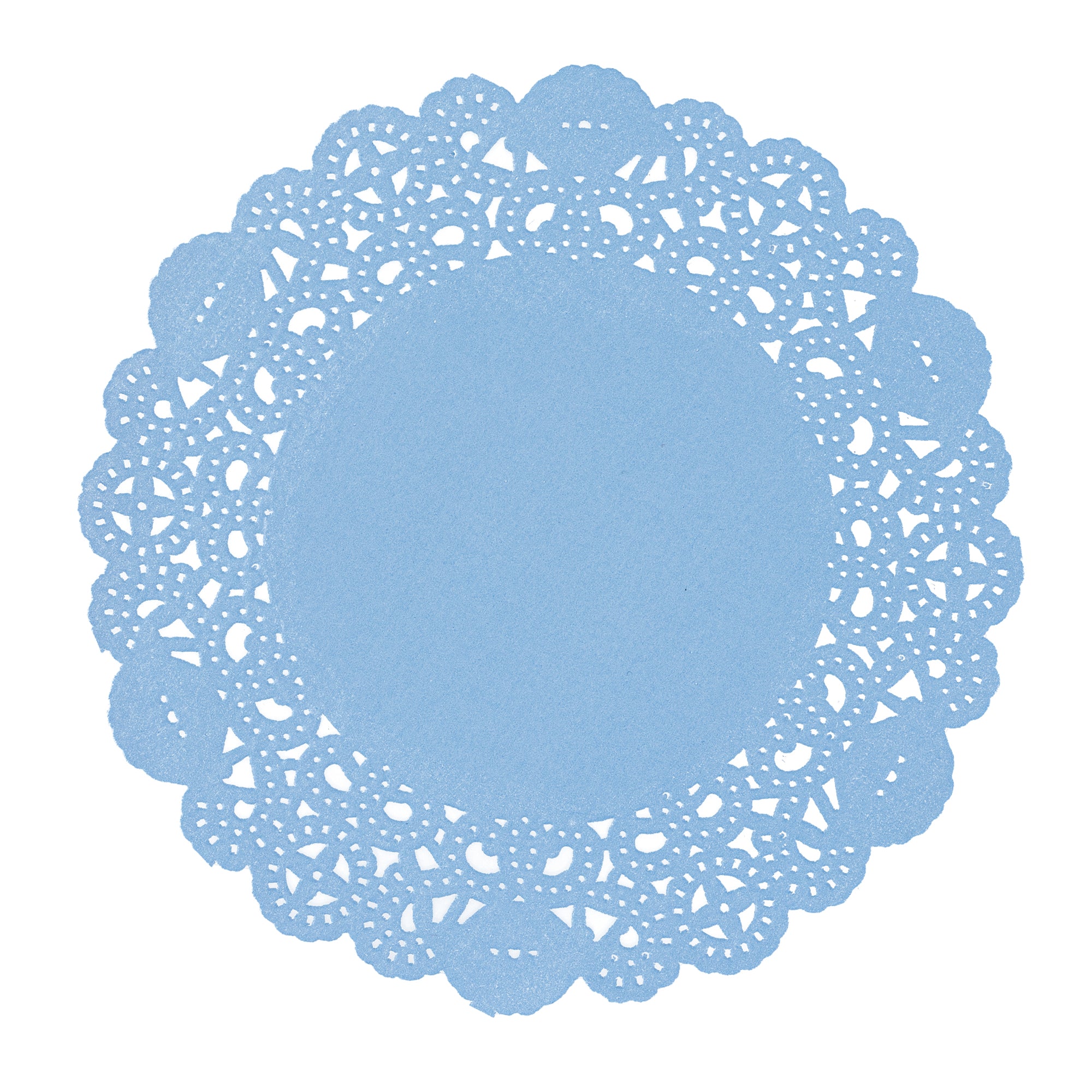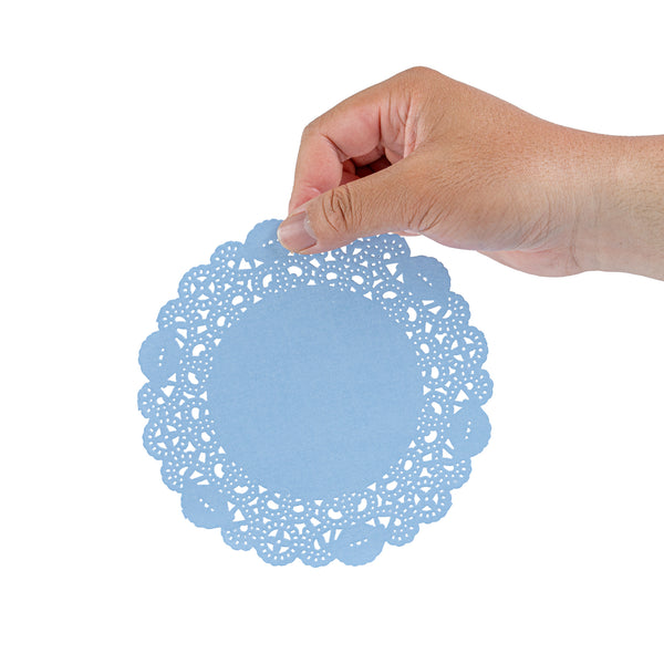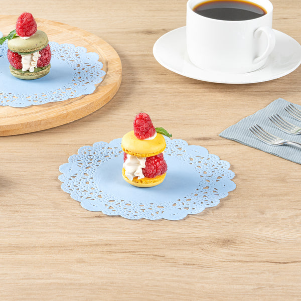 Elevate your dessert presentations with our Pastry Tek Round Sky Blue Paper Doilies. Adding an elegant touch to your dessert displays, these lace doilies enhance the visual appeal of your bakery's offerings. Crafted from high-quality paper, these table doilies provide durability while showcasing desserts without tearing or losing their structural integrity. With intricate lace-like details, these colored paper doilies serve as functional barriers, protecting surfaces and absorbing moisture efficiently. The versatile sky blue finish of these small doilies complements a wide range of table settings and themes, making them perfect for various events and occasions. Disposable by design, these paper doilies eradicate the hassle of post-event cleanup, offering a convenient and time-saving solution for busy hosts and food establishments. Measuring 6 inches in diameter, these lace doilies are ideal for use under cupcakes, petit fours, macarons, and other small treats. Sold in a 4,000 count box.
