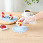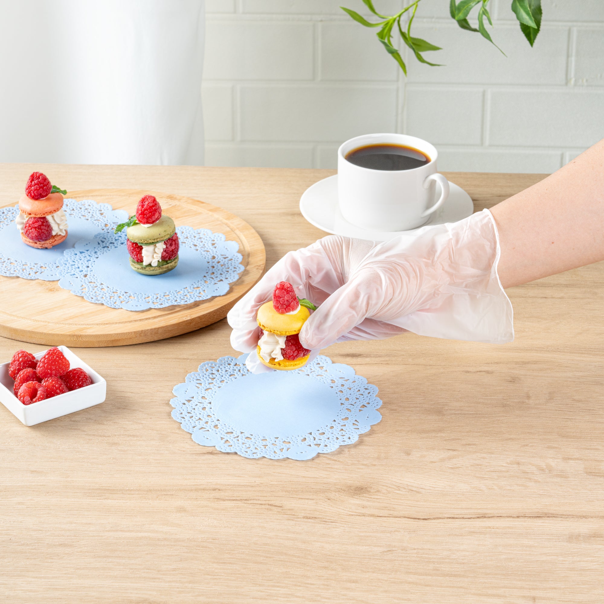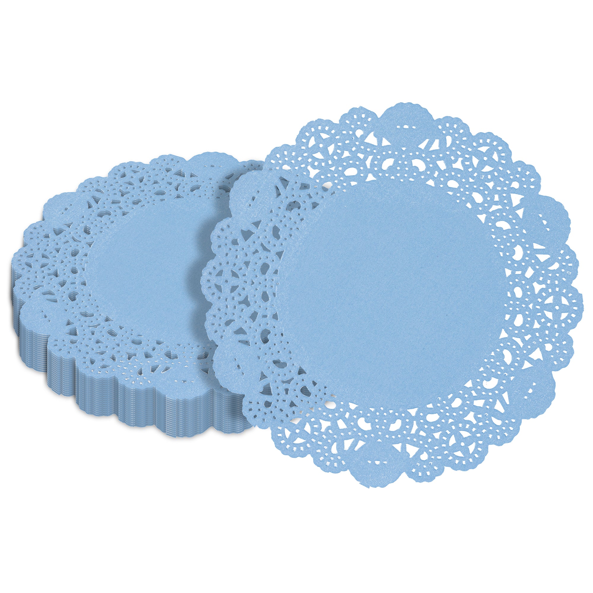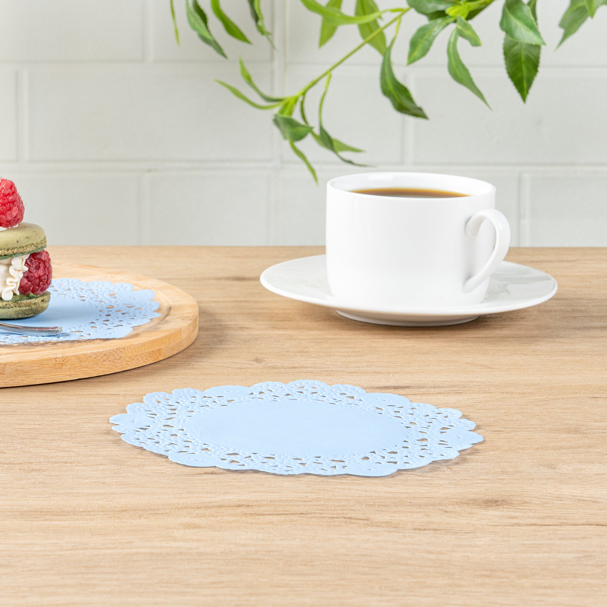 Elevate your dessert presentations with our Pastry Tek Round Sky Blue Paper Doilies. Adding an elegant touch to your dessert displays, these lace doilies enhance the visual appeal of your bakery's offerings. Crafted from high-quality paper, these table doilies provide durability while showcasing desserts without tearing or losing their structural integrity. With intricate lace-like details, these colored paper doilies serve as functional barriers, protecting surfaces and absorbing moisture efficiently. The versatile sky blue finish of these small doilies complements a wide range of table settings and themes, making them perfect for various events and occasions. Disposable by design, these paper doilies eradicate the hassle of post-event cleanup, offering a convenient and time-saving solution for busy hosts and food establishments. Measuring 6 inches in diameter, these lace doilies are ideal for use under cupcakes, petit fours, macarons, and other small treats. Sold in a 4,000 count box.