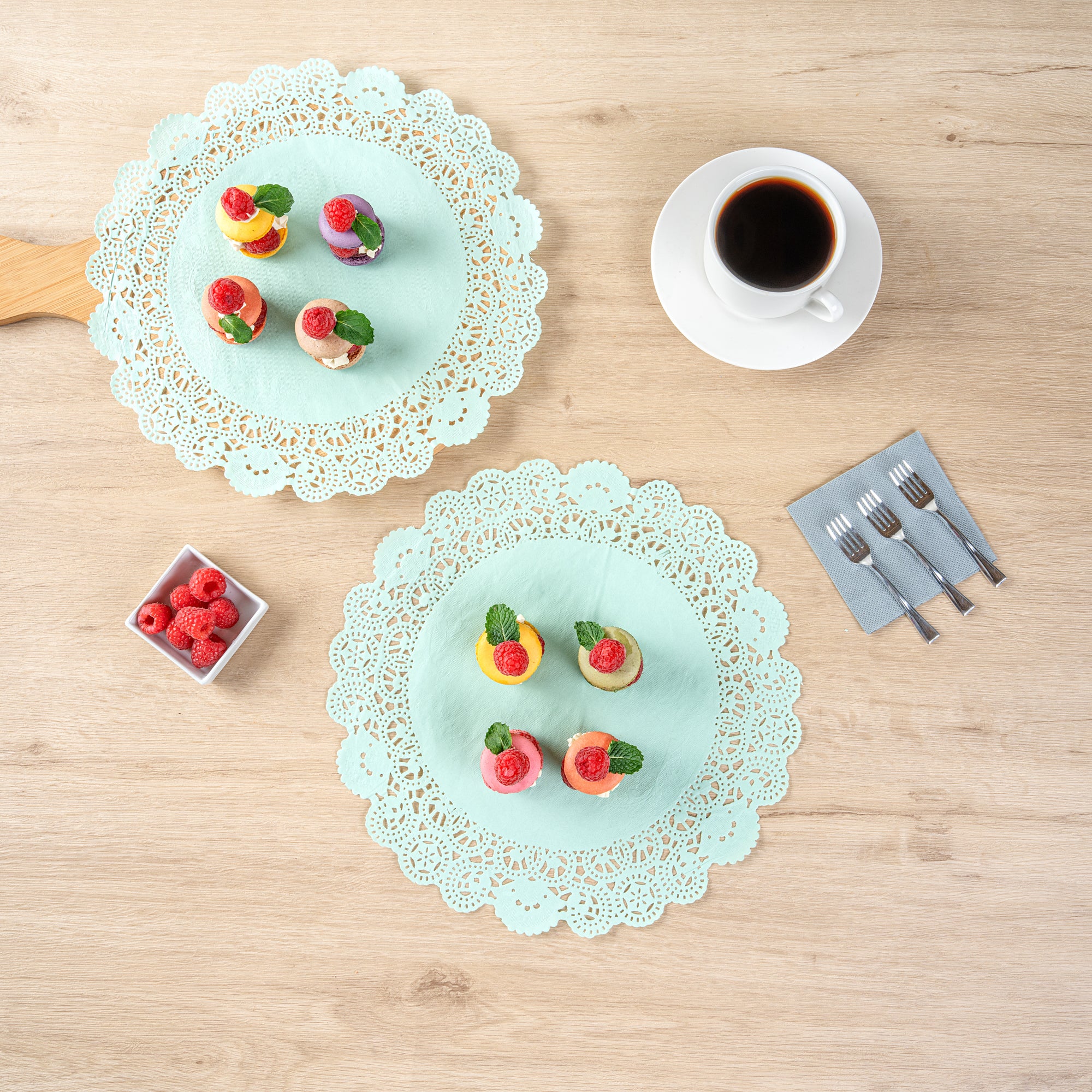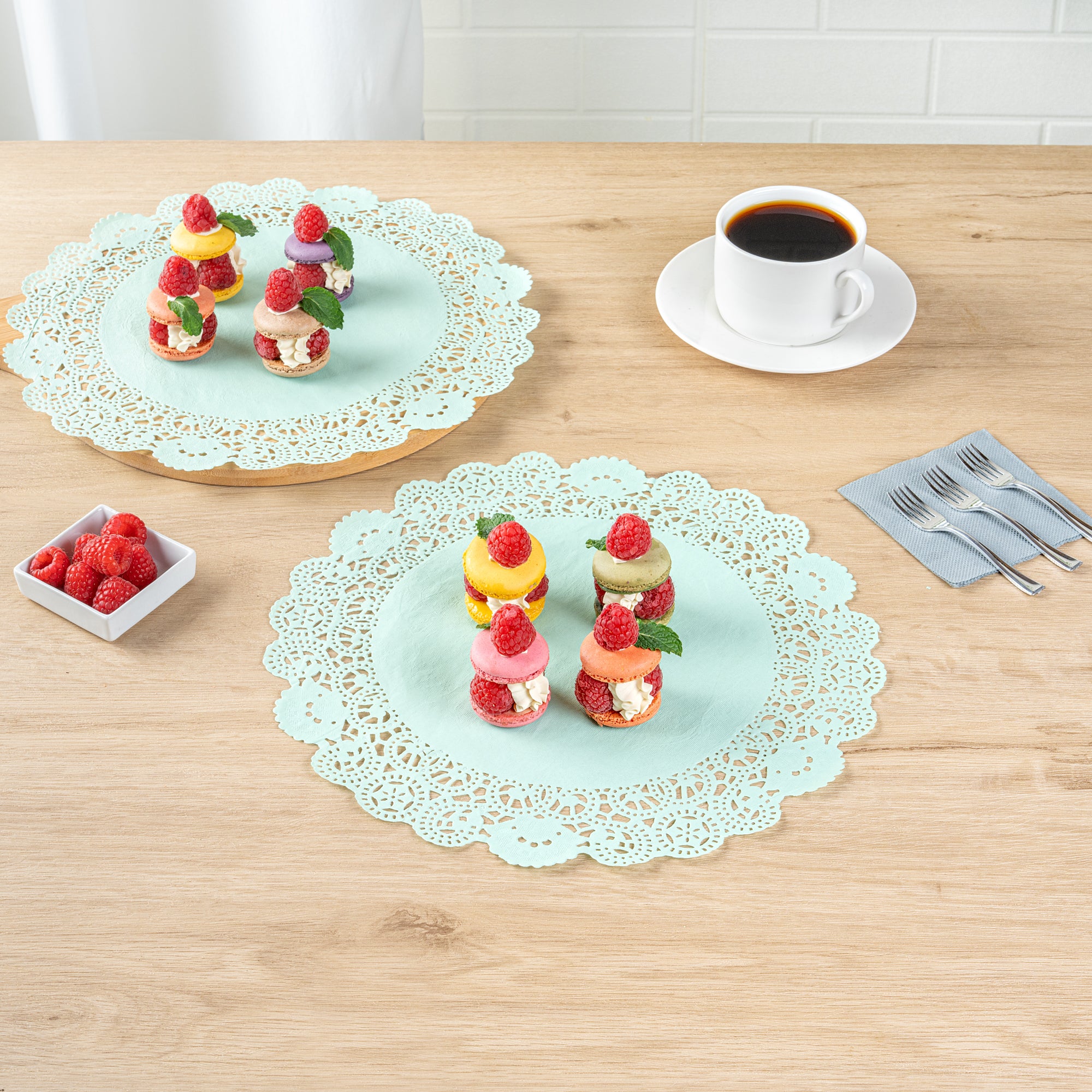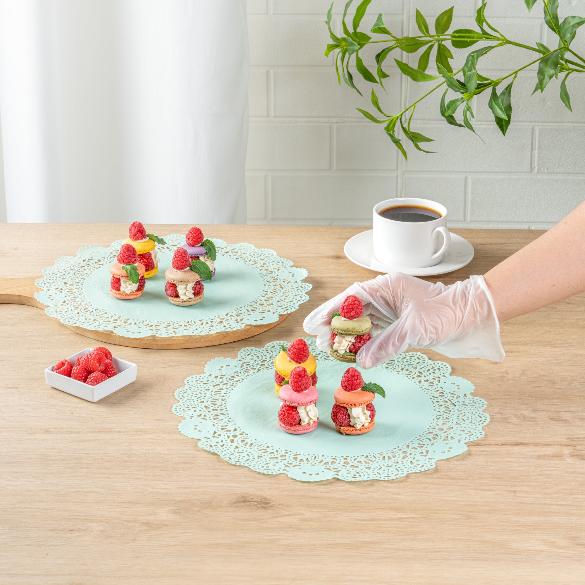 Enhance your dessert displays with our Pastry Tek Round Teal Paper Doilies, the perfect addition to any food presentation. Crafted from high-quality paper, these lace doilies provide exceptional durability, allowing you to display desserts at bakeries or catered luncheons without tearing or losing their structural integrity. Designed with intricate lace-like details, these table doilies increase the visual appeal of food presentations while serving as functional barriers that protect surfaces and absorb moisture. The teal finish of these colored paper doilies is versatile, complementing a wide range of table settings and themes, making them ideal for various events and occasions. Perfect for busy hosts and food establishments, these disposable paper doilies eradicate the hassle of post-event cleanup, offering a convenient and time-saving solution. These small doilies are perfect for use under cupcakes, petit fours, macarons, and other small treats. Measuring 12 inches in diameter, these lace doilies fit perfectly on standard serving trays and dessert displays. Sold in a 100 count box.