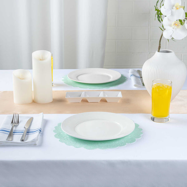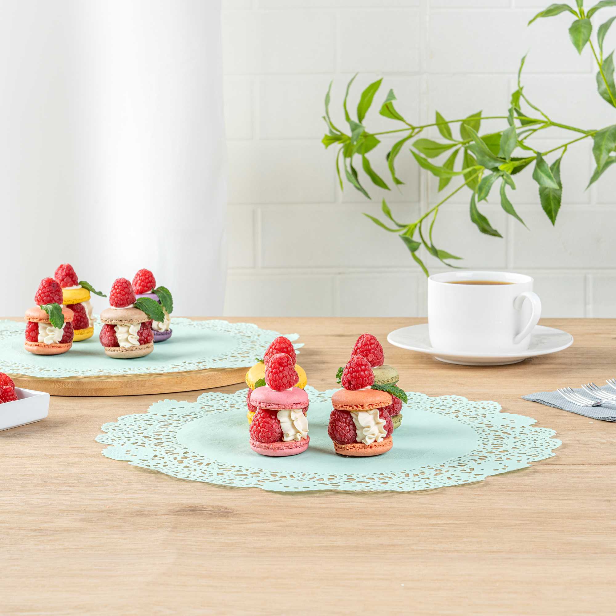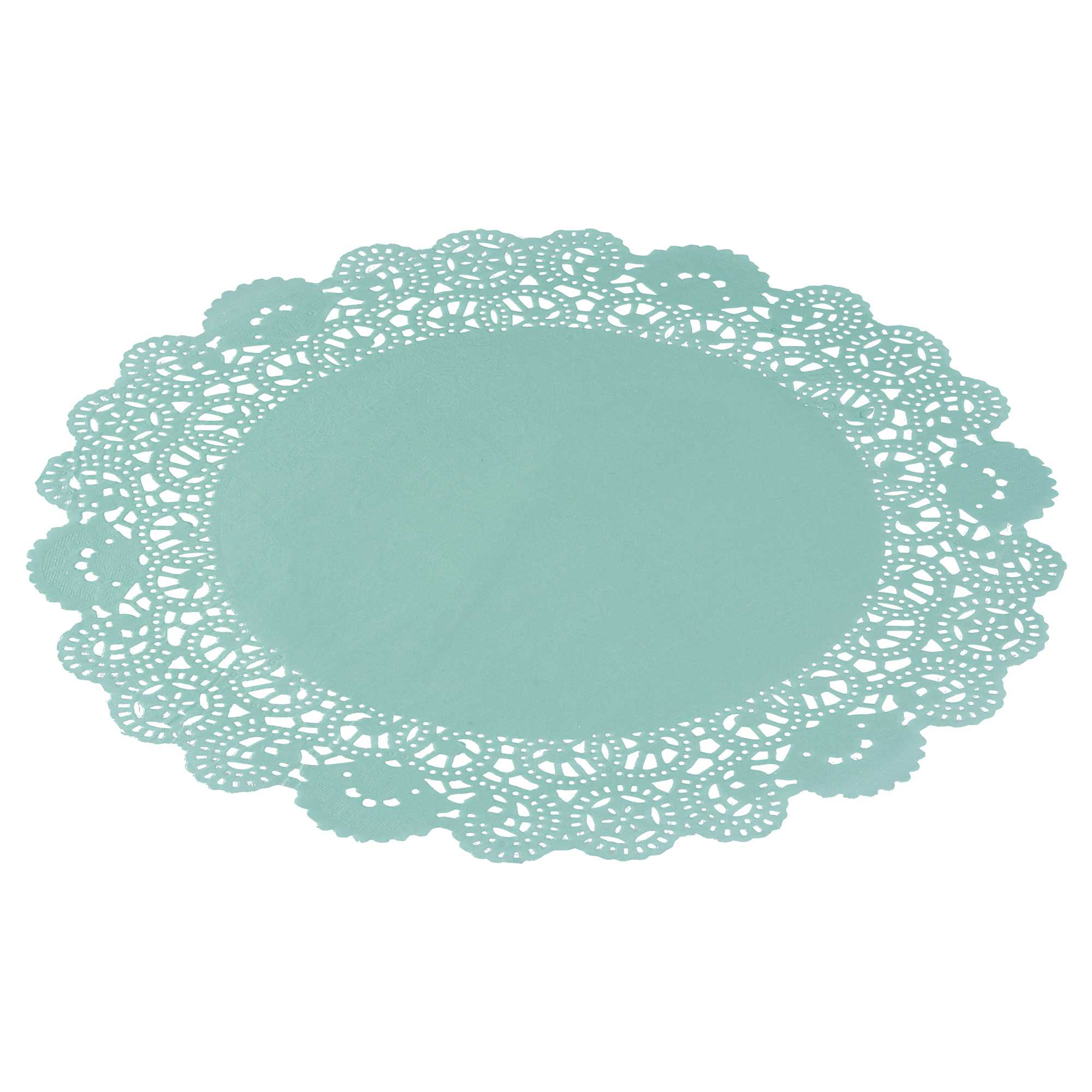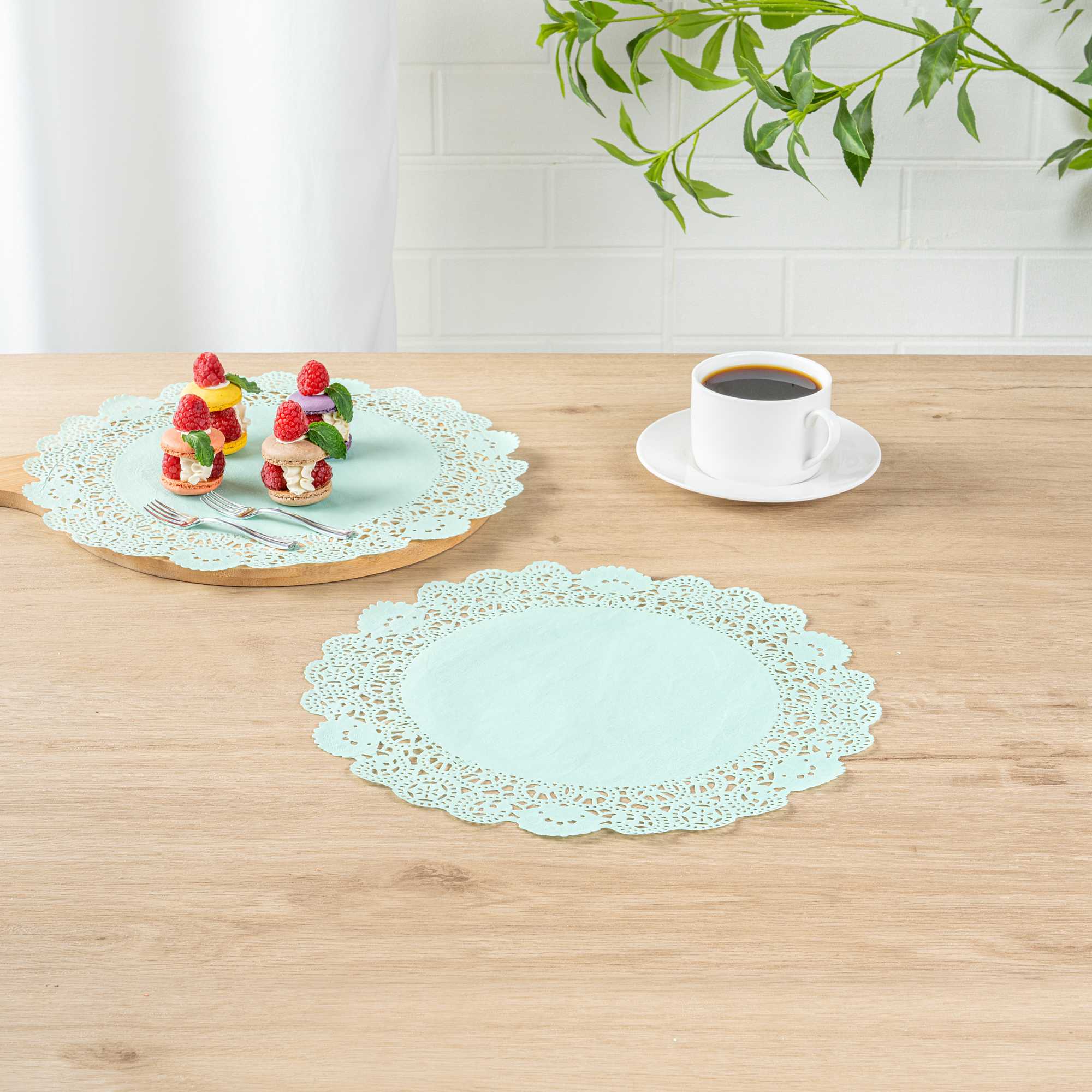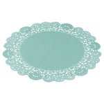 Enhance your dessert displays with our Pastry Tek Round Teal Paper Doilies, the perfect addition to any food presentation. Crafted from high-quality paper, these lace doilies provide exceptional durability, allowing you to display desserts at bakeries or catered luncheons without tearing or losing their structural integrity. Designed with intricate lace-like details, these table doilies increase the visual appeal of food presentations while serving as functional barriers that protect surfaces and absorb moisture. The teal finish of these colored paper doilies is versatile, complementing a wide range of table settings and themes, making them ideal for various events and occasions. Perfect for busy hosts and food establishments, these disposable paper doilies eradicate the hassle of post-event cleanup, offering a convenient and time-saving solution. These small doilies are perfect for use under cupcakes, petit fours, macarons, and other small treats. Measuring 12 inches in diameter, these lace doilies fit perfectly on standard serving trays and dessert displays. Sold in a 4,000 count box.