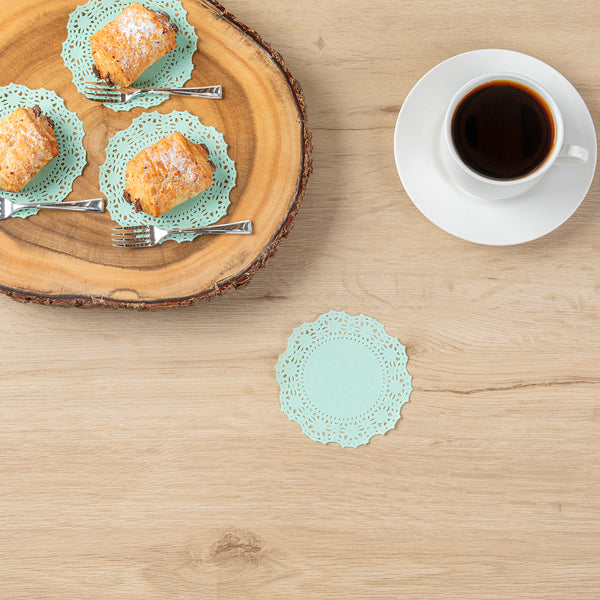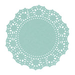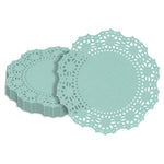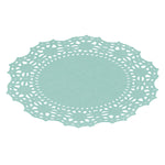 Enhance your dessert presentations with our Pastry Tek Round Teal Paper Doilies. Crafted from high-quality paper, these lace doilies provide durability while displaying double chocolate brownies at bakeries or catered luncheons without tearing or losing their structural integrity. The lace-like details of these table doilies increase the visual appeal of food presentations while serving as functional barriers, protecting surfaces, and absorbing moisture. With a specific colored finish, these colored paper doilies are versatile enough to complement a wide range of table settings and themes, making them an ideal choice for various events and occasions. Designed to be disposable, these small doilies eradicate the hassle of post-event cleanup, offering a convenient and time-saving solution for busy hosts and food establishments. Perfect for use under cupcakes, petit fours, macarons, and other small treats, these paper doilies are both practical and stylish. Measuring 4 inches in diameter, these lace doilies fit perfectly on small plates and trays. Sold in a 100 count box.