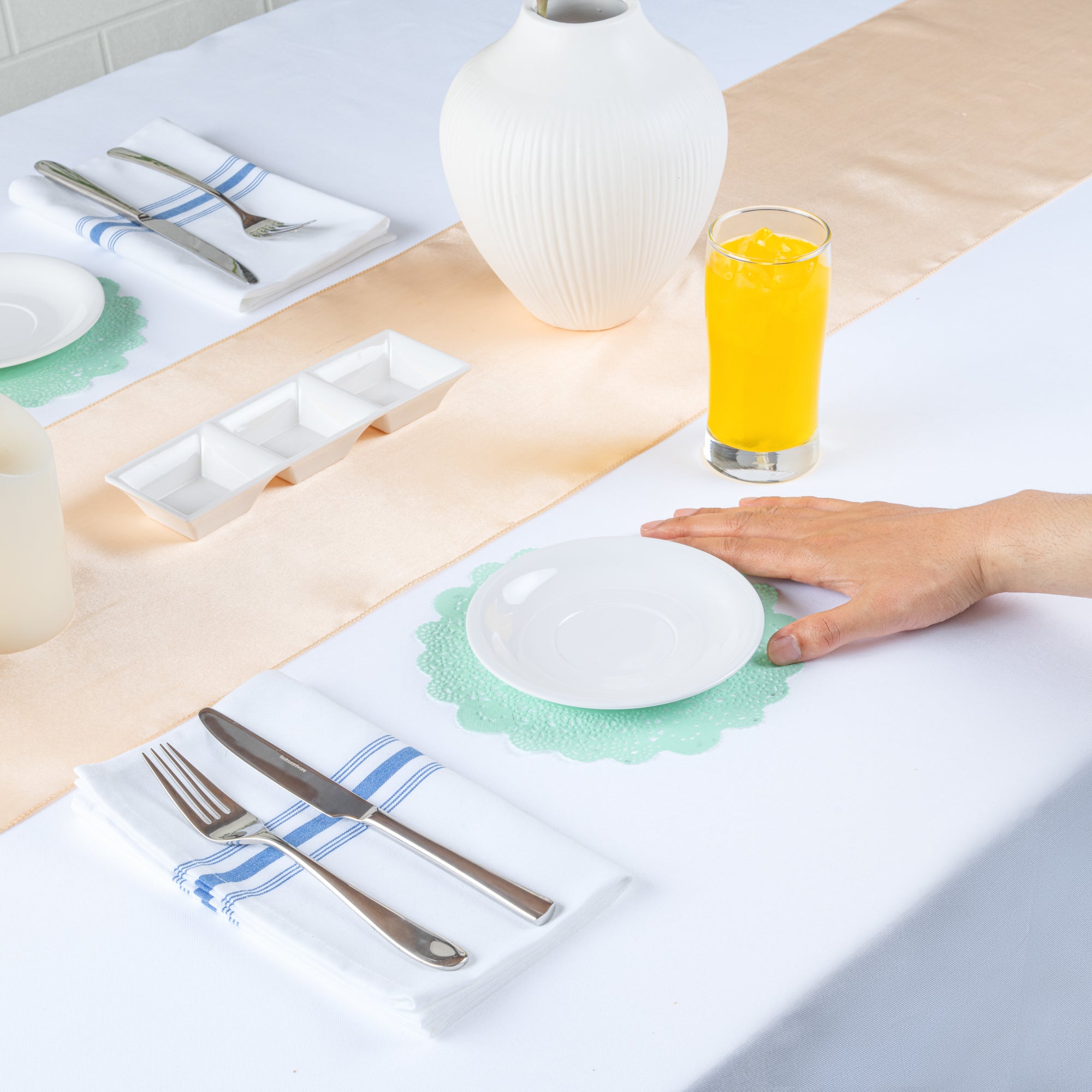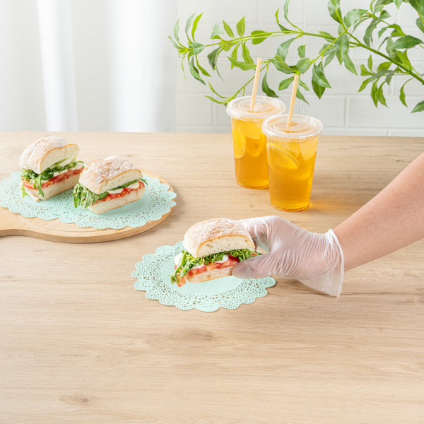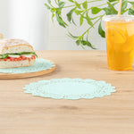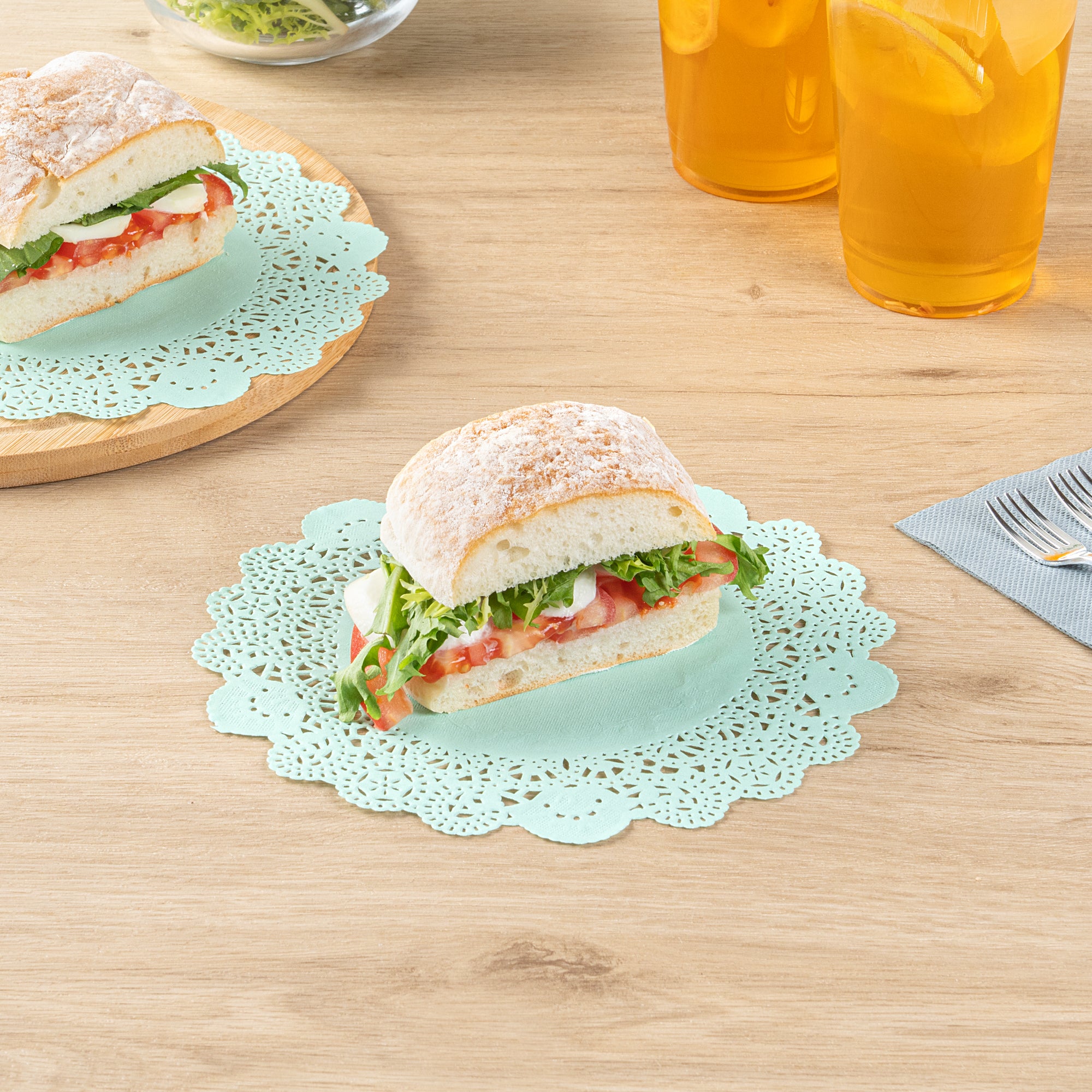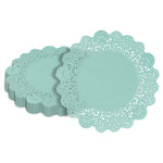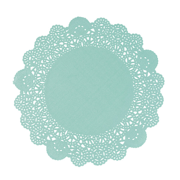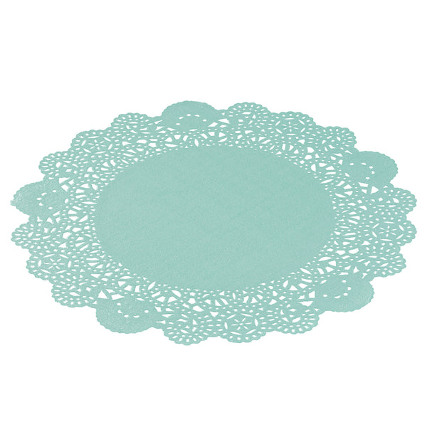 Elevate the elegance of your dessert displays with our Pastry Tek Round Teal Paper Doilies. Crafted from high-quality paper, these lace doilies provide durability while beautifully showcasing desserts at bakeries or catered luncheons without tearing or losing their structural integrity. Featuring intricate lace-like details, these table doilies not only increase the visual appeal of food presentations but also serve as functional barriers, protecting surfaces and absorbing moisture. The versatile teal finish of these colored paper doilies allows them to complement a wide range of table settings and themes, making them an ideal choice for various events and occasions. Designed for convenience, these disposable paper doilies eradicate the hassle of post-event cleanup, offering a time-saving solution for busy hosts and food establishments. Perfect for use under cupcakes, petit fours, macarons, and other small treats, these small doilies enhance the presentation of your delectable creations. Measuring 8 inches in diameter, these lace doilies fit seamlessly into your foodservice setup. Sold in a 100 count box.