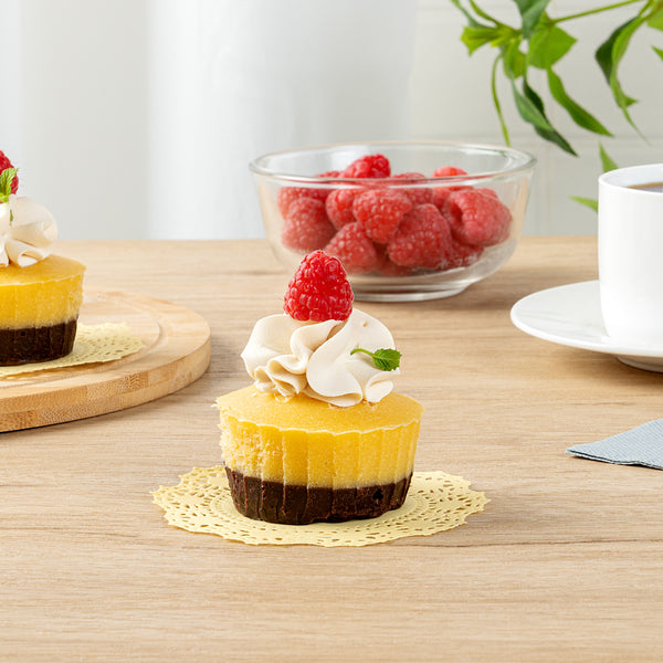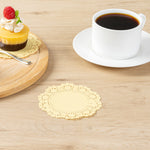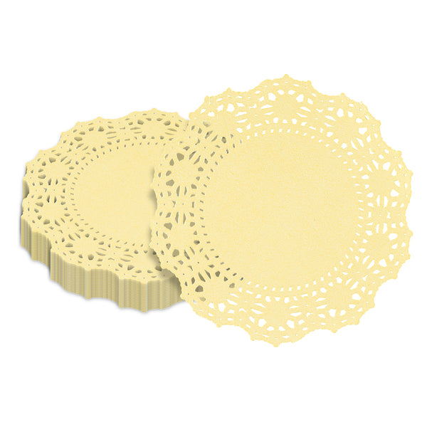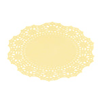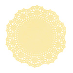 Add an elegant touch to your dessert displays with our Pastry Tek Round Yellow Paper Doilies. Crafted from high-quality paper, these table doilies provide durability while displaying double chocolate brownies at bakeries or catered luncheons without tearing or losing their structural integrity. Lace-like details on these lace doilies increase the visual appeal of food presentations while serving as functional barriers, protecting surfaces, and absorbing moisture. The specific colored finish of these colored paper doilies is versatile, allowing them to complement a wide range of table settings and themes, making them an ideal choice for various events and occasions. These paper doilies are disposable to eradicate the hassle of post-event cleanup, offering a convenient and time-saving solution for busy hosts and food establishments. Small doilies such as these can be used under cupcakes, petit fours, macarons, and other small treats. Measuring 4 inches in diameter, these lace doilies are perfectly sized for an array of dessert presentations. Sold in a 100 count box.