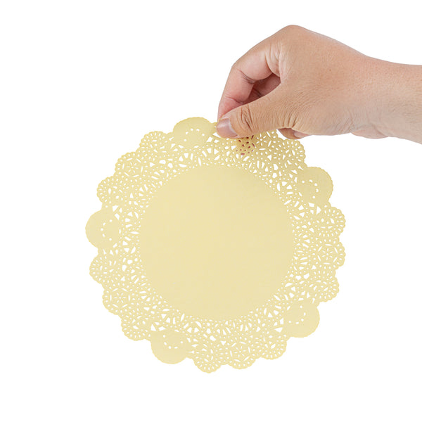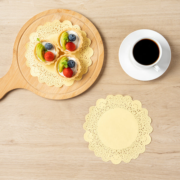 Enhance your dessert displays with our Pastry Tek Round Yellow Paper Doilies, adding an elegant touch to any presentation. Crafted from high-quality paper, these lace doilies provide exceptional durability while showcasing desserts at bakeries or catered luncheons without tearing or losing their structural integrity. The intricate lace-like details of these table doilies elevate the visual appeal of food presentations, serving as functional barriers that protect surfaces and absorb moisture. This yellow colored finish in these paper doilies seamlessly complements a wide range of table settings and themes, making it an ideal choice for various events and occasions. For busy hosts and food establishments, these disposable doilies eradicate the hassle of post-event cleanup, offering a convenient and time-saving solution. Perfect for use under cupcakes, petit fours, macarons, and other small treats, these small doilies are versatile and practical. Measuring 8 inches in diameter, these lace doilies are designed to fit perfectly with your dessert needs. Sold in a 4,000 count box.