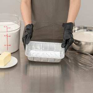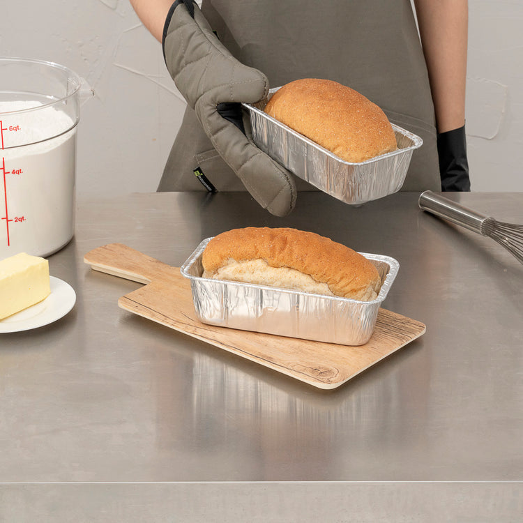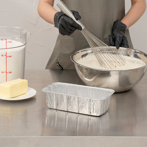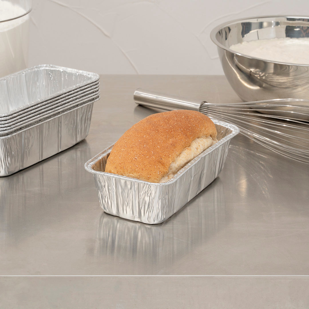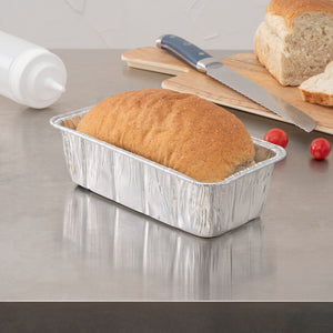 Bake multiple banana bread loaves with our Pastry Tek Silver Aluminum Bread Loaf Pans. The aluminum construction of these banana bread pans is strong and sturdy to hold up to 2 pounds of batter. These aluminum loaf pans are oven-safe so you can bake pumpkin bread, pound cake, and more at your bakery or restaurant. To easily store your baked goods, these disposable loaf pans are freezer-safe. Featuring a stackable design, these foil bread pans maximize the space used in your storage area. For a quick and simple cleanup, these loaf pans are conveniently recyclable. These loaf baking pans measure 8.5 inches long by 4.25 inches wide by 2.5 inches tall. Sold in a 25 count box.