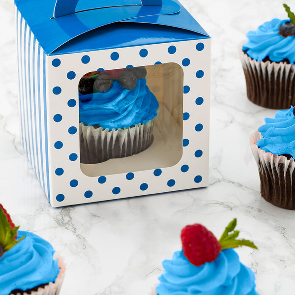 SQUARE BLUE PAPER CUPCAKE WINDOW BOX - POLKA DOTS, FITS 1