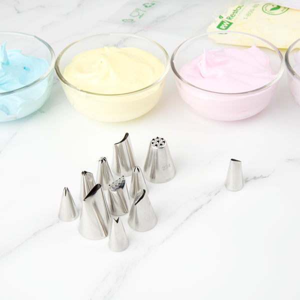 Frost creative designs on decadent desserts with our Pastry Tek #103 Petal Piping Tip. Crafted from high-quality stainless steel, this durable icing tip is rust-resistant, dishwasher-safe, and reusable. Use this versatile frosting nozzle to create delicate daisies on sweet coconut cupcakes or design a defined bow on a birthday cake at your bakery. Featuring a teardrop shape, this baking tool effortlessly produces realistic flower petals, dramatic ruffles, drapes, swags, bows, and more. This frosting decorating tip measures 0.7 inches wide by 1.2 inches tall and sold in a 1 count box.