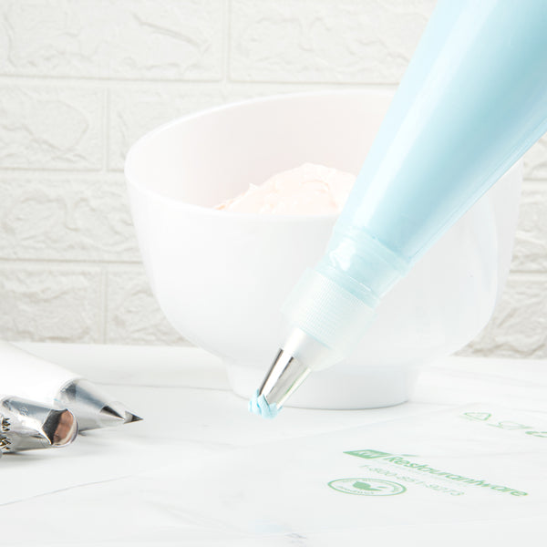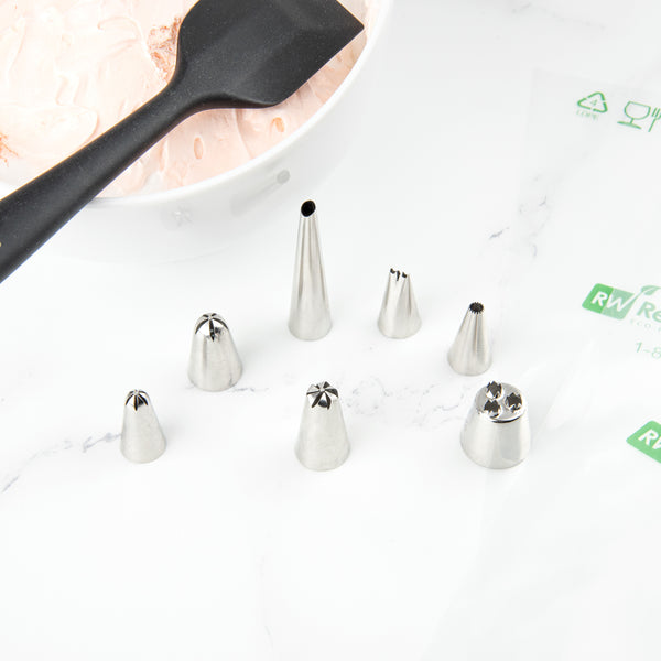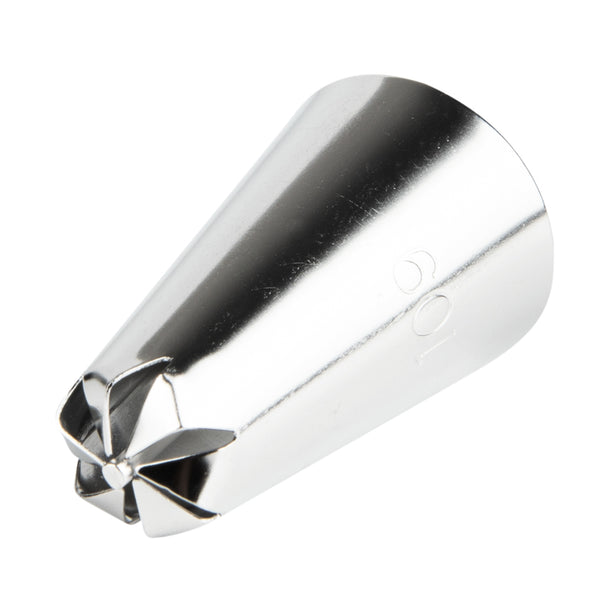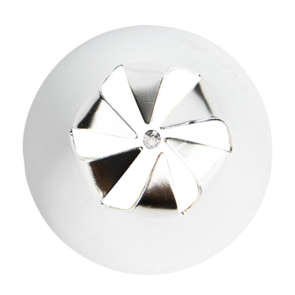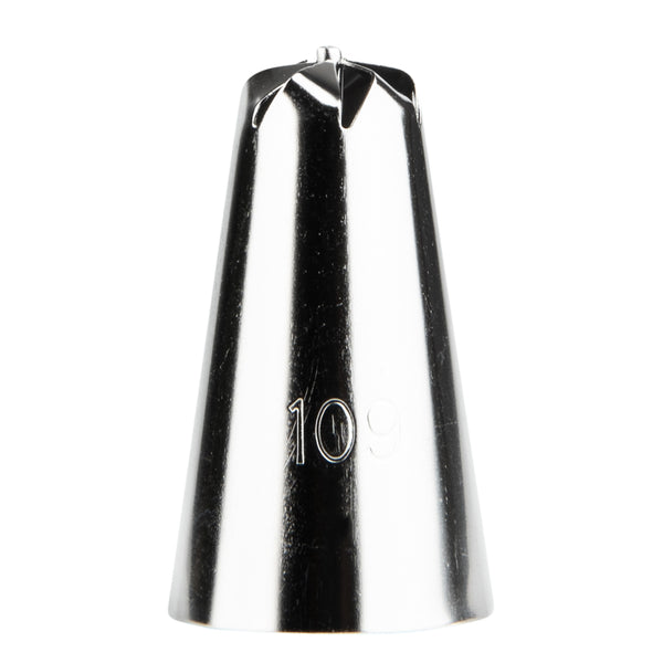 Design multi-colored icing flowers with our Pastry Tek #109 Drop Flower Piping Tip. Featuring a swirled top with a bar in the middle, this versatile icing tip creates gorgeous drop flowers, ribbons, drapes, full roses, swirls, ruffles and more. With a bar inside the tube, this frosting decorating tip designs a drop flower without a center allowing different designs or colors to be added. Use this rose nozzle icing tip to add full roses on top of chocolate cupcakes or sweet swirls on the border of chocolate chip cookies from your bakery. Made from stainless steel, this piping bag tip is conveniently reusable and rust-resistant. This piping nozzle measures 0.8 inches wide by 1.5 inches tall and ships in a 1 count box.