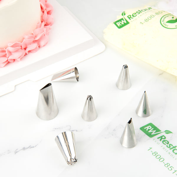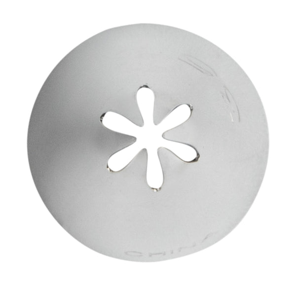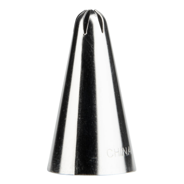 Effortlessly enhance dessert presentations with our Pastry Tek #129 Drop Flower Piping Tip. Featuring a 6 prong design with a bar in the center, this cake decorating tip effortlessly creates one-squeeze drop flowers, ribbons, drapes, swirls, borders, and more! Crafted from premium stainless steel, this drop flower tip is conveniently reusable and rust-resistant. Use this rose piping tip to design textured ribbons on top of scrumptious cupcakes or create full roses on birthday cakes from your bakery. This pastry bag tip measures 0.7 inches wide by 1.2 inches tall and ships in a 1 count box.