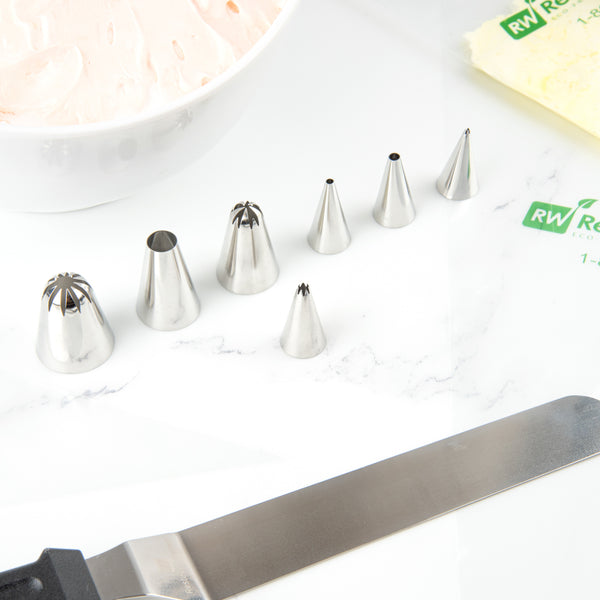 Go beyond the basics with this Pastry Tek Stainless Steel #18 Open Star Piping Tip. Featuring a 7-pointed round opening, this icing bag tip creates wonderfully textured ruffles and beautifully detailed rosettes. Use this professional-quality cake decorating tip with buttercream frosting or royal icing to make ridged swirls, shells, stars, ropes, borders, and more! Crafted from high-quality stainless steel, this cupcake frosting tip is corrosion-resistant and built to withstand commercial use. Each of these #18 piping tips measures 0.7 inches in width by 1.2 inches in height, and can be used with most standard-sized piping bags and couplers. Sold in a 1 count box.