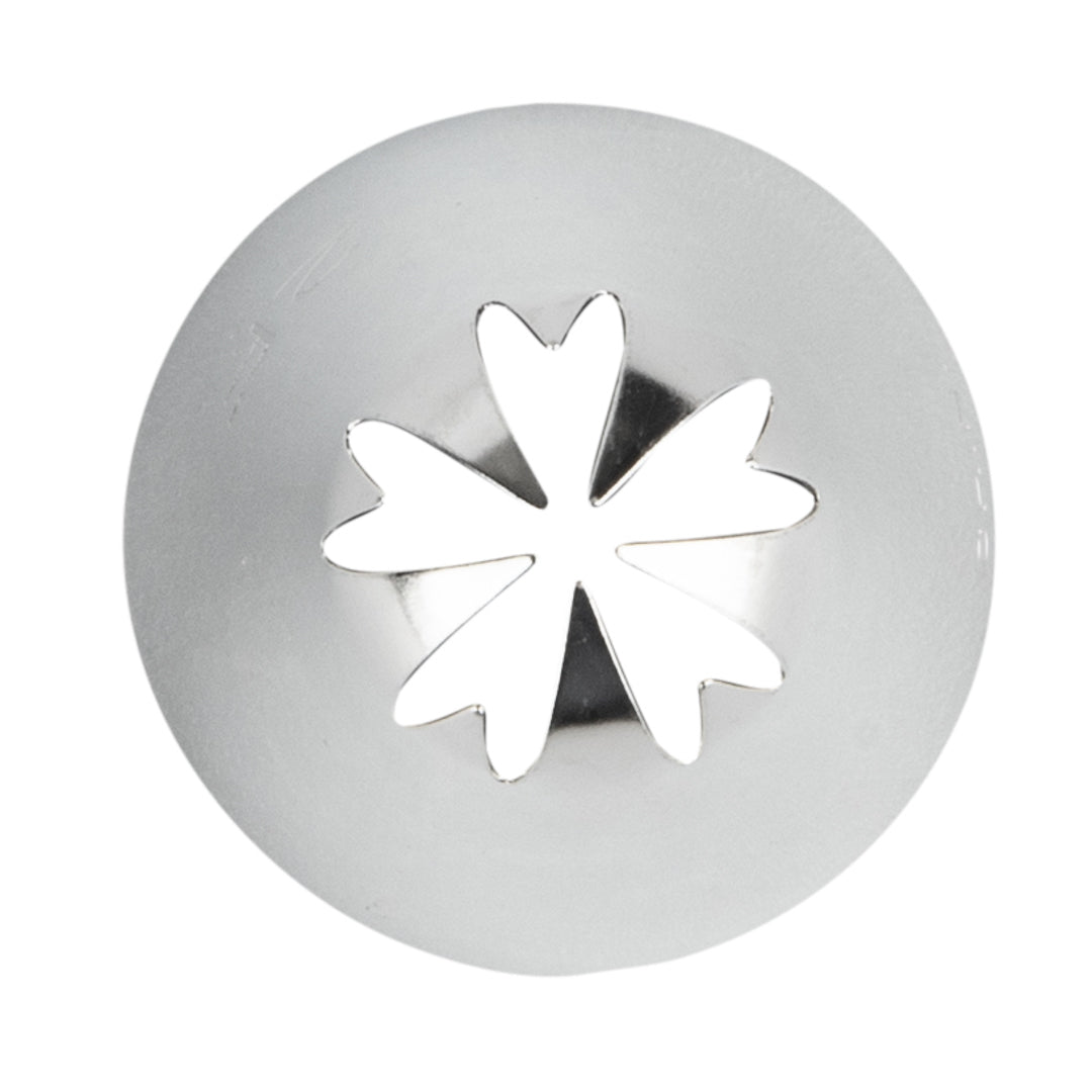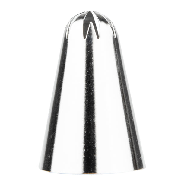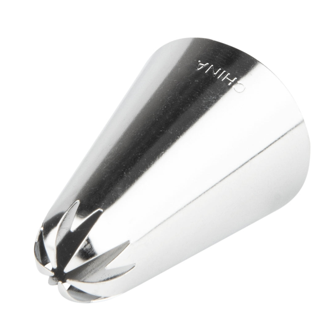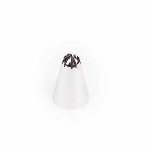 Easily add beautiful floral details to your baked goods with this Pastry Tek Stainless Steel #2D Drop Flower Piping Tip. Featuring a large 5-notched design, this cake decorating tip produces unique double-petal flowers with ease. A conveniently multi-use addition to your cake piping tools, this #2F tip can be used for piping icing to create gorgeous one-squeeze flowers, bold ruffles, eye-catching stars, and more! Made from food-safe stainless steel, this long-lasting piping tip is incredibly durable and dent-resistant. Each of these decorating tips measures 1 inch in width by 1.4 inches in height. Shipped in a 1 count box.