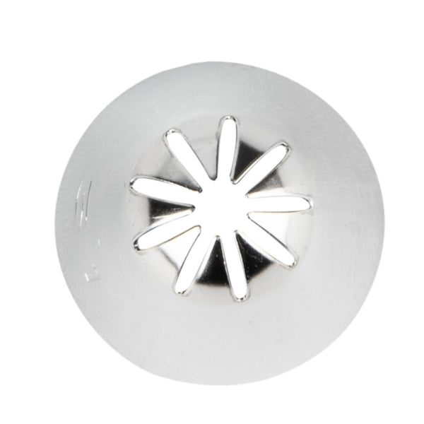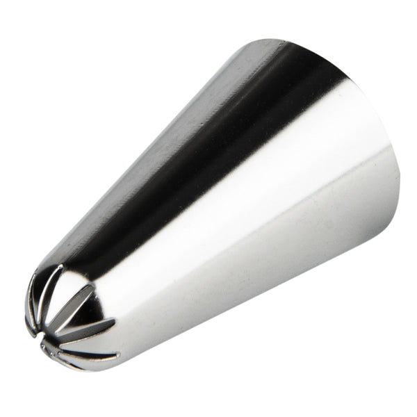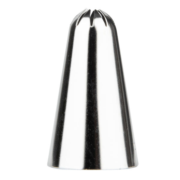 Give your treats some attention-grabbing flair with this Pastry Tek Stainless Steel #31 Closed Star Piping Tip. Featuring a 9-pointed closed star design, this piping bag tip produces deeply grooved shells, stars, swirls, rosettes, and all types of fanciful patterns. Try using this #31 piping tip to cover a birthday cake with beautiful ruffles or to add textured drop flower accents to a wedding cake! Each of these dent-resistant icing piping tips is made from food-safe stainless steel and designed to withstand commercial use in busy bakeries and cake shops. This professional cake decorating piping tip measures 0.7 inches in width by 1.2 inches in height and will fit most standard piping bags and couplers. Shipped in a 1 count box.