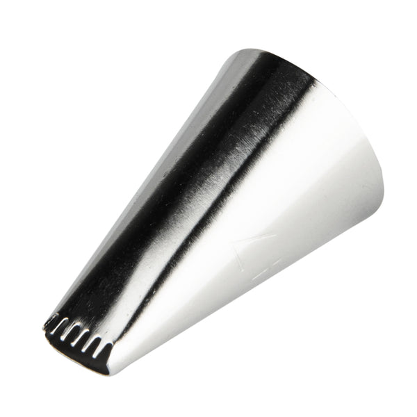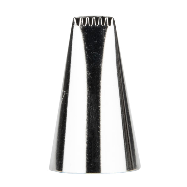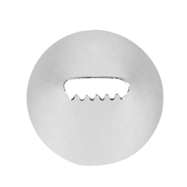 Cover the sides of your cakes with beautifully textured details using this Pastry Tek Stainless Steel #47 Basketweave Piping Tip. Featuring 5 sharp teeth, this professional cake icing tip creates dramatically ridged borders and bold ribbed stripes. Use this cake decorating tip to produce intricately woven patterns, ruffled zig-zags, geometric outlines, decorative bows and more! Ideal for adding the finishing touches to a basket weave cake, this piping tip is an excellent addition to any bakery, cake shop, or catering company. Each of these basketweave piping tips measures 0.7 inches in width by 1.2 inches in height and fits most standard-sized pastry bags and couplers. Made from food-safe stainless steel, this #47 piping tip has been specifically designed to be incredibly durable and corrosion-resistant. Shipped in a 1 count box.