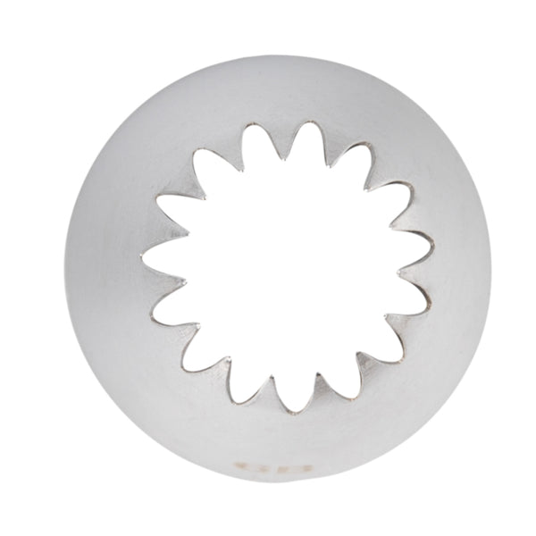 Create bold borders and textured designs using our Pastry Tek Stainless Steel #6B Open Star Piping Tip. Featuring a large round design with many pointed teeth, this piping bag nozzle produces dramatically ridged ruffles, shells, rosettes, gems, stars, and more! Use this professional cake decorating tip to add decorative borders to a birthday cake - or to add continuous swirls of frosting to cupcakes. Made from food-safe stainless steel, this #6B piping tip is incredibly strong and dent-resistant. Each of these large open star piping tips measures 1.2 inches in width by 1.7 inches in height. Shipped in a 1 count box.