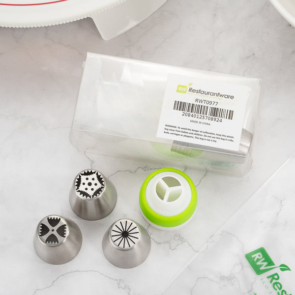 Frost all kinds of cakes and pastries using our Pastry Tek Stainless Steel Russian Piping Tip Decorating Set. This 20-piece frosting tip set features 9 Russian piping tips, 10 high-quality piping bags, and 1 tri-color coupler, all packaged in a clear plastic box to easily keep your decorating essentials stored in one place. Great for producing a variety of flowers and intricate designs, this piping nozzle set includes several Russian piping tip designs. To frost multiple colors at once, our tri-color coupler effortlessly creates swirls and borders onto cakes. Pipe frosting onto cupcakes with our biodegradable piping bags, to dispose of decorating tools in an eco-friendly way. Each piping tip in this cake decorating tip set measures 1.5 inches in diameter and 1.75 inches in height. Each piping bag measures 18 inches in length by 8.6 inches in width. The tri-color coupler measures 1.8 inches in diameter. The plastic box measures 5.1 inches in length by 2.3 inches in height. Shipped in a 1 count box. This item will only degrade outside of the traditional solid waste stream.