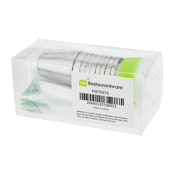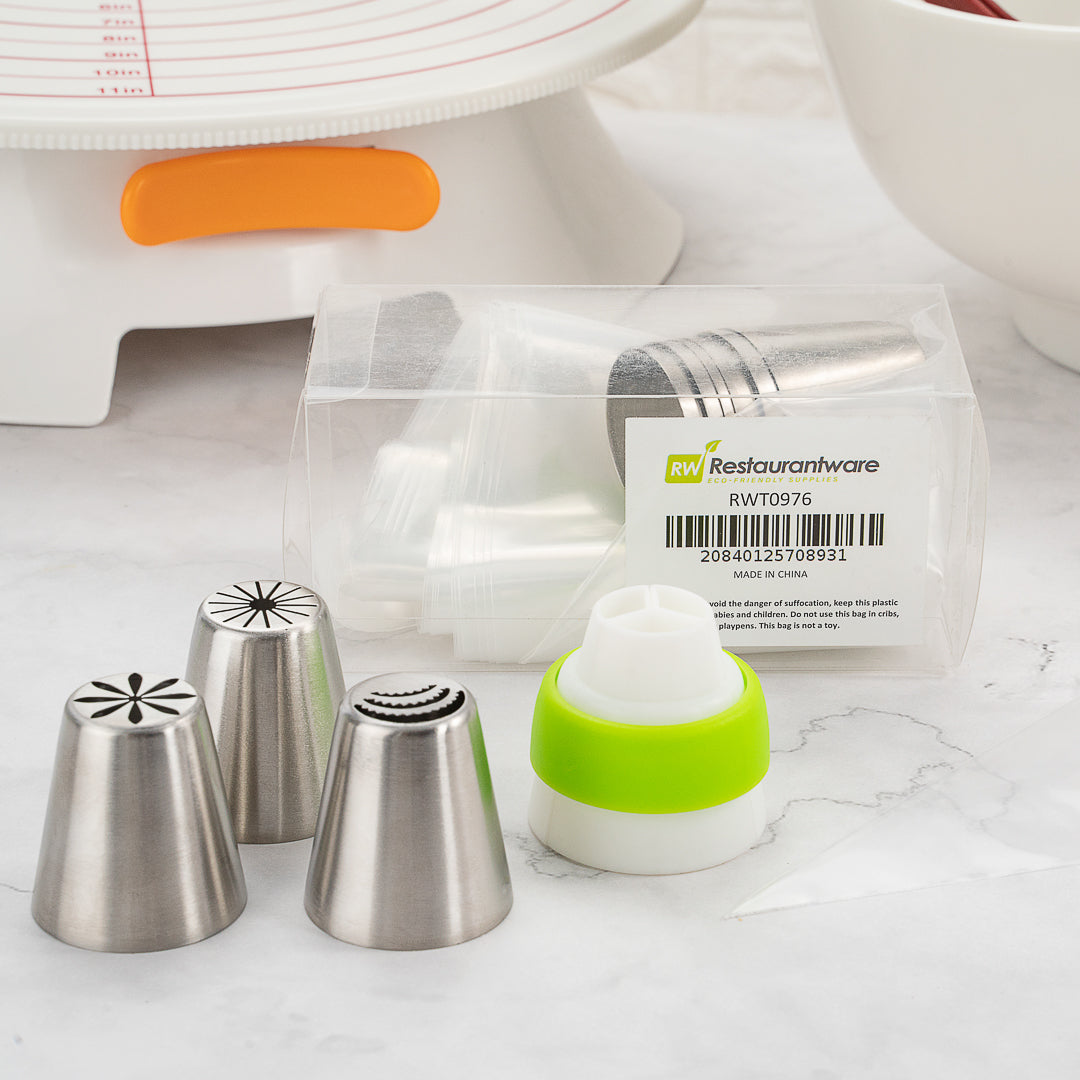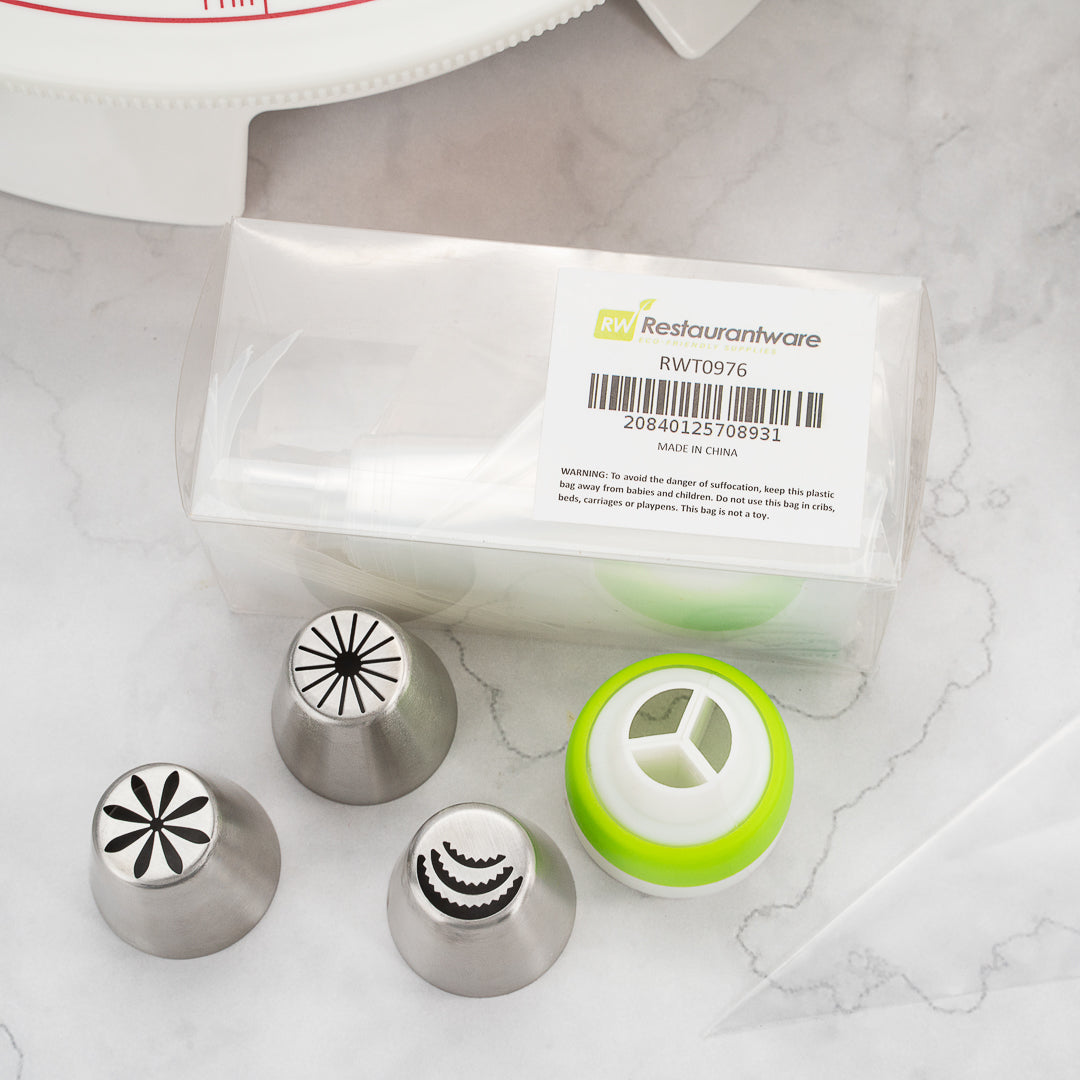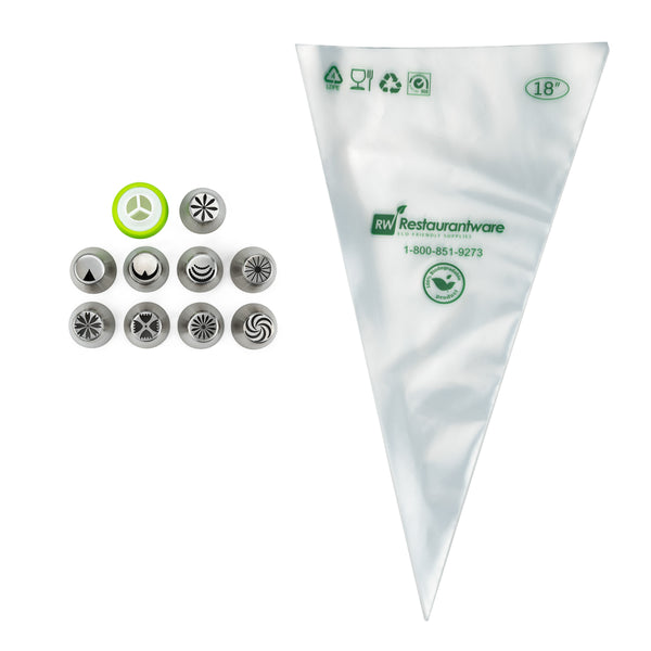 Our Pastry Tek Stainless Steel Russian Piping Tip Set has all the tools you need to beautifully decorate your cakes. This piping tip set includes 9 Russian piping tips, 10 piping bags, and 1 tri-color coupler for adding fine details to your baked goods. The piping nozzles of this cake decorating tip set create different designs so you can give your pastries a variety of borders and ribbons. Made from stainless steel, our dishwasher-safe cake frosting tips are corrosion-resistant and dent-resistant to maintain their shape and allow you to consistently pipe detailed decorations. To reduce your carbon footprint, the plastic piping bags in this Russian decorating tip set is biodegradable. The plastic coupler of this cake nozzle set can be used to combine different colors of frosting or switch between tips for easy decorating. This icing nozzle set arrives packaged in a clear plastic box for quickly identifying the frosting tip you need and easy storage. All of the Russian tips measure 1.5 inches in diameter by 1.75 inches in height while the pastry bags measure 18 inches long by 8.66 inches wide. The coupler in this Russian tip set measures 1.8 inches in diameter by 1.8 inches in height. The plastic box measures 5.11 inches long by 2.36 inches wide by 2.36 inches in height. Sold in a 1 count box. This item will only degrade outside of the traditional solid waste stream.