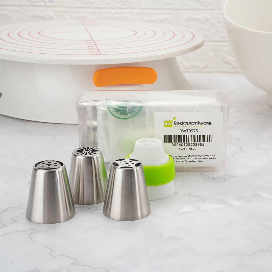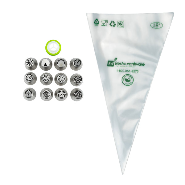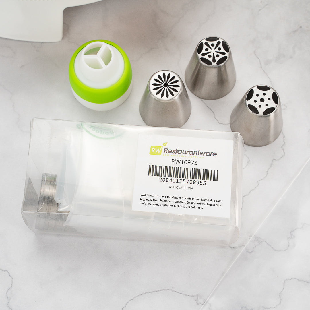 Seamlessly frost all kinds of flowers on desserts using our Pastry Tek Stainless Steel Russian Piping Tip Set. This 23-piece Russian icing tip set brings 12 Russian piping tips, 10 piping bags, and 1 tri-color coupler, all neatly packaged in a clear plastic box so you can store all your decorating tools in the same place. Perfect for piping decorations on cupcakes, this flower piping tip set includes several Russian tip designs that create a variety of detailed flowers. The biodegradable piping bags are durable and can be easily cut to size to fit your decorating needs. Use the tri-color coupler to frost several colors all at once or quickly switch between tips and bags. Each piping tip in this Russian icing tip set measures 1.5 inches in diameter and 1.75 inches in height. Each piping bag measures 18 inches in length by 8.6 inches in width. The tri-color coupler measures 1.8 inches in diameter. The plastic box measures 5.1 inches in length by 2.3 inches in height. Shipped in a 1 count box. This item will only degrade outside of the traditional solid waste stream.