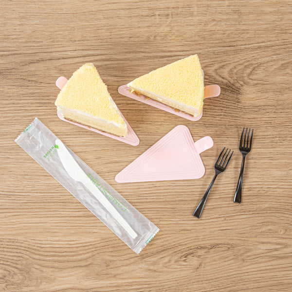Avoid the mess and awkwardness that can sometimes come with serving slices of cakes or pies by using our Pastry Tek Triangle Pink Plastic Cake Servers. Guests can simply use the little handle of these cake spatulas to pick up a slice of cake or pie without fidgeting with a knife or cake slicer. The adorable pink finish of these plastic servers makes them perfect for baby showers, weddings, and birthday parties. With a premium plastic construction, these cake servers are durable and, at the same time, recyclable once your event is over. Measuring 4.5 inches in length by 3 inches in width, these accurate pie servers ensure that every guest receives the right amount. Shipped in a 100 count box.