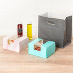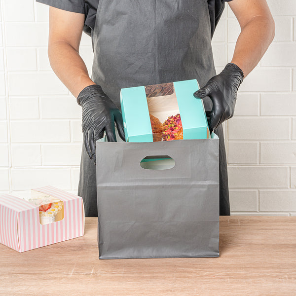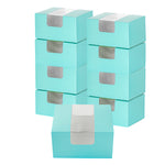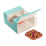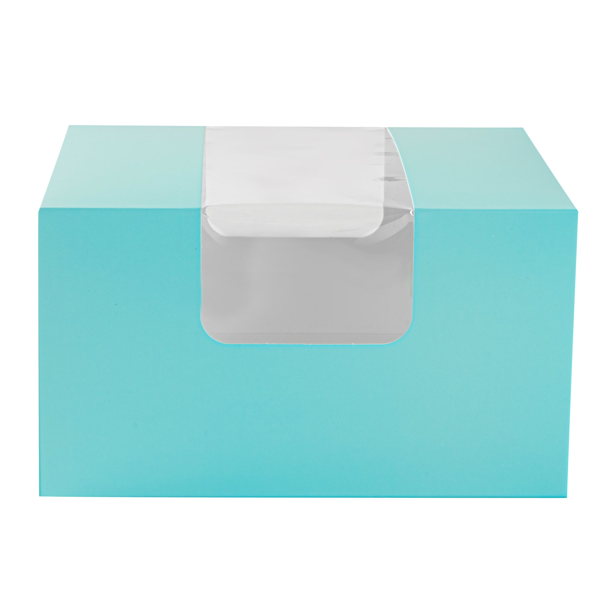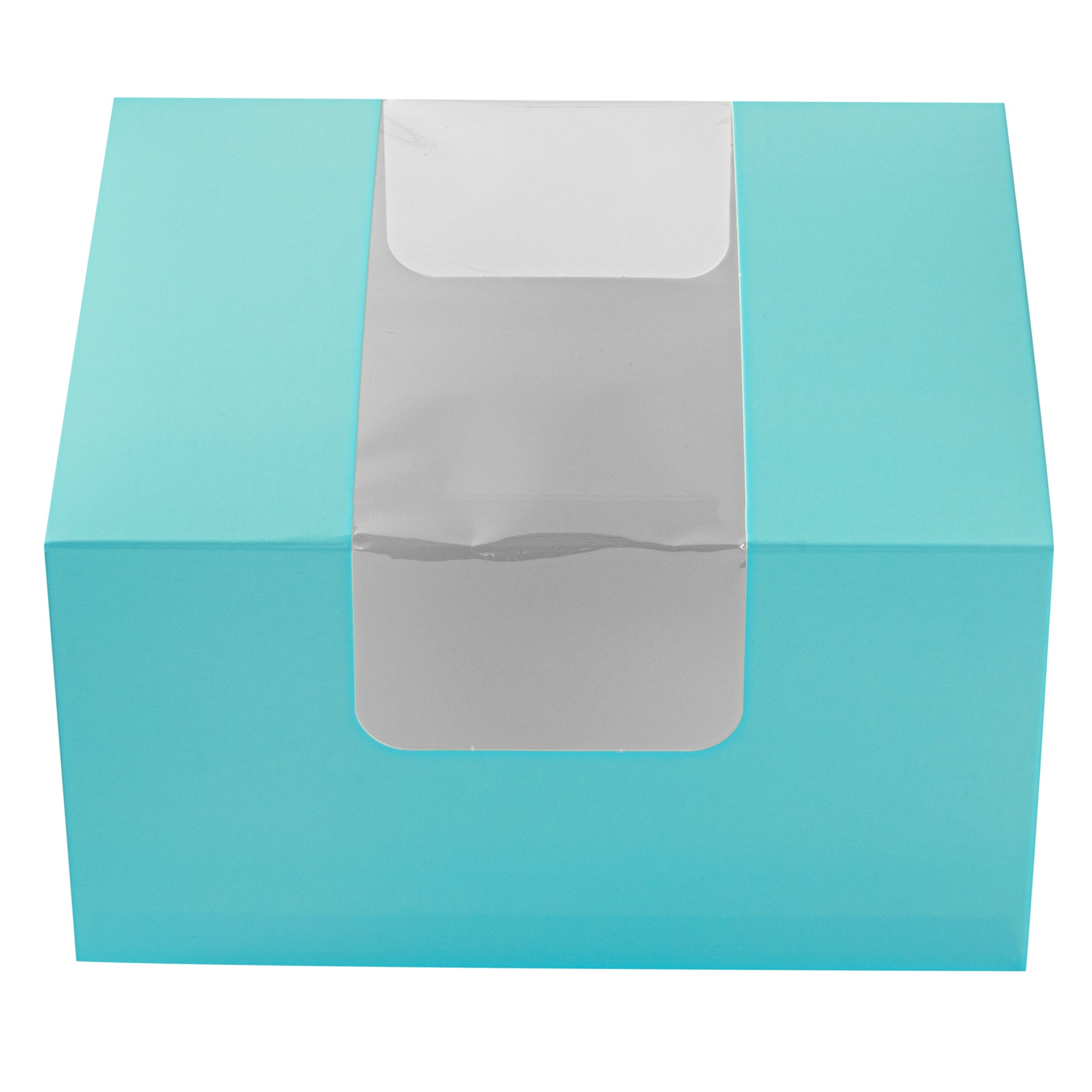 Accentuate your confectionery masterpieces using our Pastry Tek Turquoise Paper Pastry / Cake Boxes. Built with a clear window, these bakery boxes maximize visibility for a streamlined display and effective identification of your sweets. These turquoise boxes are grease-resistant, ensuring that oils are kept at bay. Being recyclable, these treat boxes promote simplified waste disposal in your establishment. With a vibrant turquoise finish, these disposable pastry boxes provide a sophisticated look that perfectly offsets the packaged treats. These confection boxes are shipped flat, offering easy storage in your bakery or cafe, and are easily assembled according to need. Each turquoise pastry box measures 7 inches in length by 6 inches in width by 4 inches in height. Sold in a 100 count box.