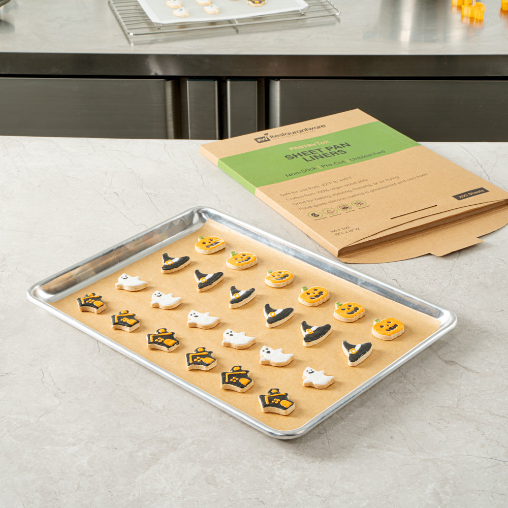 Reduce waste in your establishment with our Pastry Tek Unbleached Paper Half Size Sheet Pan Liners. These unbleached reusable cookie sheet liners are produced with a pre-cut, double-sided silicone coating to ensure durable usage and space for ingredients in your pan. To facilitate your cooking process, these odorless silicone cookie sheet liners are non-stick and greaseproof. With a temperature-resistant construction up to 445F, these baking sheet liners are built with high-fiber density paper for maximum security. To avoid unnecessary absorption, these sheet pan liners are waterproof. These non-stick cookie sheet liners can be used for baking bread or cookies, roasting chicken, and grilling meats. These cookie sheet liners are commercially compostable and made from virgin wood pulp. These sheet pan liners measure 12 inches long by 16 inches wide. Sold in a 200 count box.