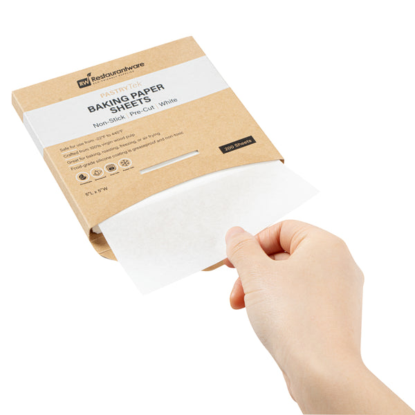 Choose an eco-friendly cooking supply alternative with our Pastry Tek White Paper Baking Paper Sheets. These pre-cut, reusable cookie sheet liners are constructed with a double-sided silicone coating to prevent any contamination to your ingredients. Great for baking, grilling, or roasting, these sheet pan liners are versatile, ideal to fit all your cooking needs. These silicone cookie sheet liners are greaseproof and non-stick for worry-free baking. To prevent any undesired absorption from liquids or oils, these non-stick cookie sheet liners are waterproof. These white baking sheet liners are odorless to preserve the flavor of your ingredients. Designed with a high-fiber density paper, these cookie sheet liners are temperature resistant up to 445F and are commercially compostable. These silicone lined baking sheets are made from virgin wood pulp and measure 5 inches long by 5 inches wide. Sold in a 200 count box.