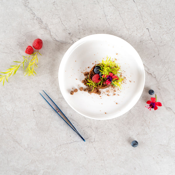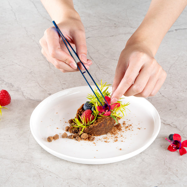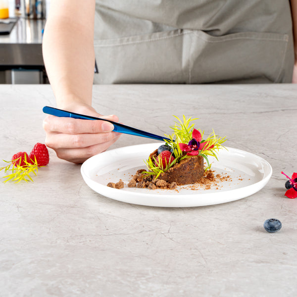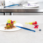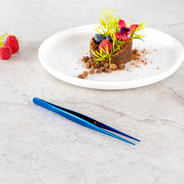 Present your culinary skills with our Perfect Point Titanium Blue Stainless Steel Fine Point Tweezers. These striking blue titanium stainless steel construction of these tweezers are aesthetically pleasing and exhibit superior durability, ready to meet demanding kitchen requirements. The fine-point design of these fine point tweezers integrates seamlessly with precision plating, offering excellent control for delicate garnishes or intricate decoration elements. Suitable for hot and cold food preparation, these stainless steel tweezers are essential assets to your kitchen for convenience. Measuring 6.25 inches in length, these blue tweezers provide a comfortable grip and assist in crafting detailed culinary presentations with ease and accuracy. Sold in 1 count box.