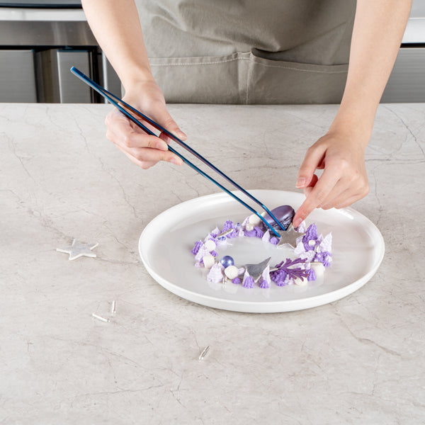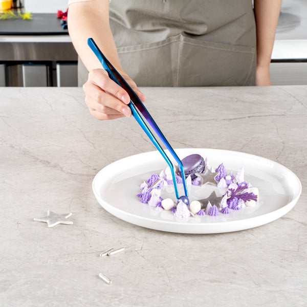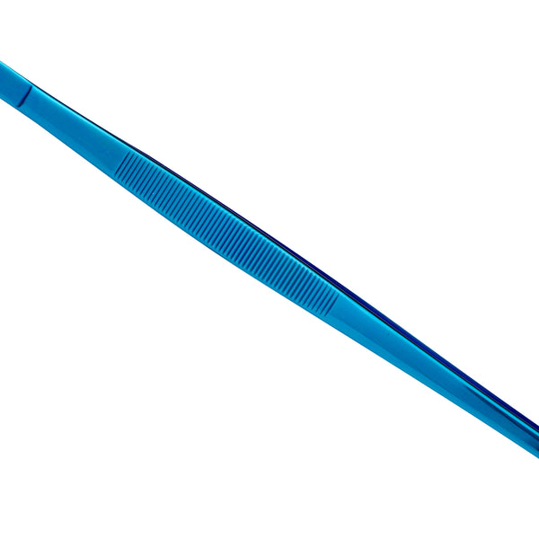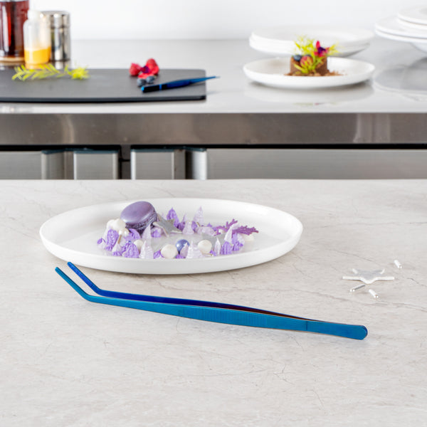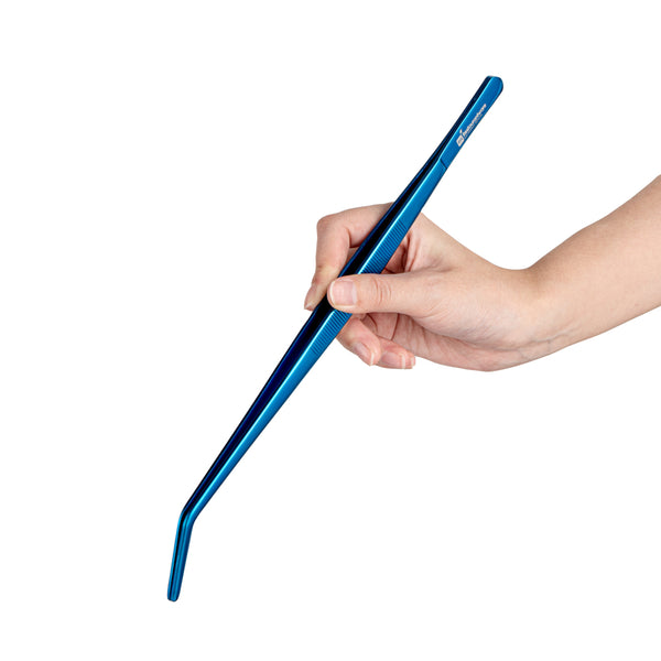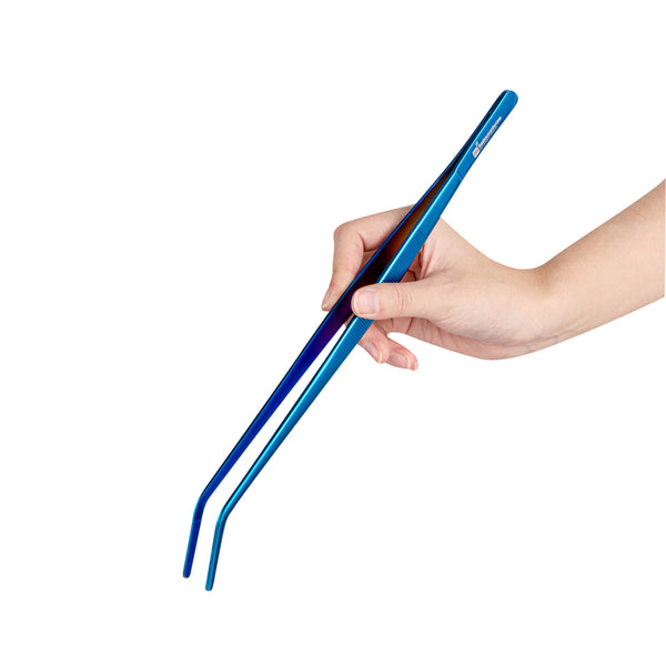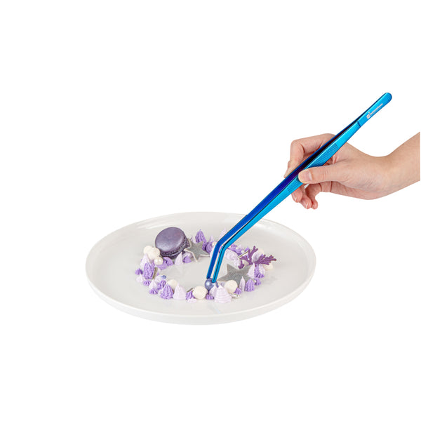 Enhance your food presentations with our Perfect Point Titanium Blue Stainless Steel Long Slant Nose Tweezers. Constructed from robust blue titanium stainless steel, these tweezers are as eye-catching as they are robust, standing up to the challenges of active kitchen settings. The elongated slant nose designs and precise tips of these blue tweezers lend themselves to detailed plating, ensuring effortless handling of delicate garnishes and complex decorative components. Ideal for both hot and cold food tweaking, these plating tweezers contribute to your kitchen's versatility. With lengths of 11.75 inches, these stainless steel tweezers provide comfortable grasps, enabling you to execute your culinary creations with exactitude and flair. Sold in 1 count box.