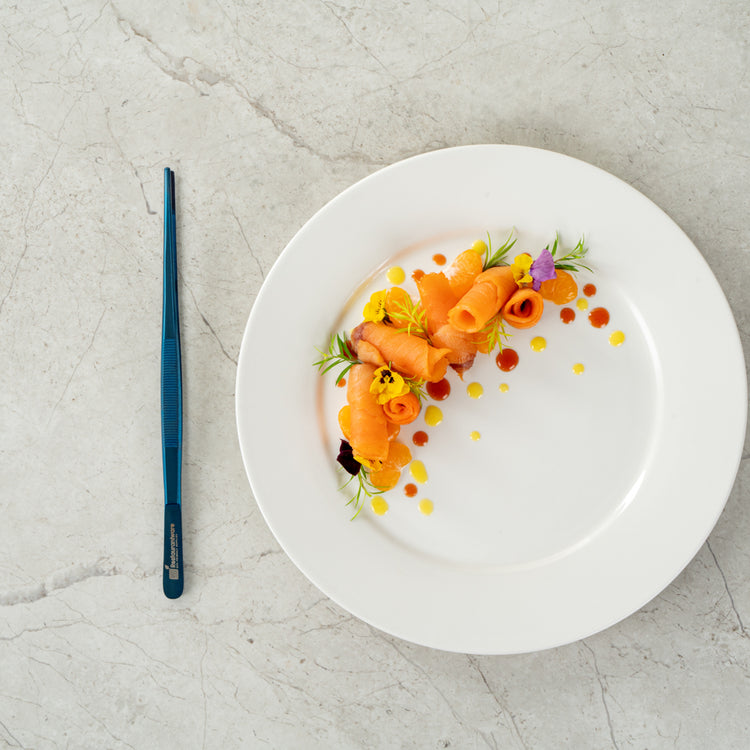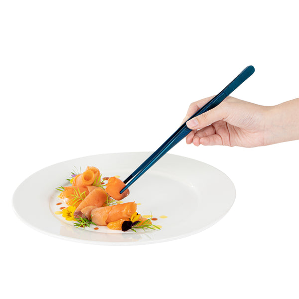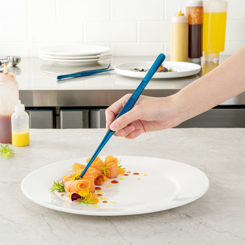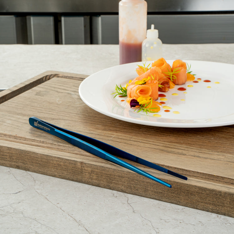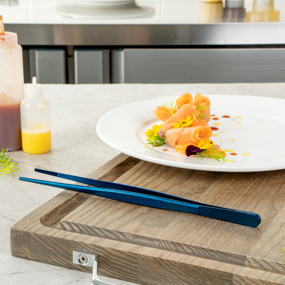 Welcome to the world of precise culinary creations with our Perfect Point Titanium Blue Stainless Steel Short Straight Tweezers. Manufactured from blue titanium stainless steel, these food plating tweezers are as durable as they are visually pleasing and ready for demanding kitchen scenarios. The straight designs of these blue tweezers, coupled with fine-pointed tips, are tailor-made for precision plating, ensuring excellent control with delicate garnishes and intricate food accents. Ideal for both hot and cold food, these stainless steel tweezers stand for multipurpose convenience. Measuring 9.5 inches in length, these food tweezers optimize grip, enabling you to present your food artistry with optimum detail and easy control. Sold in 1 count box.