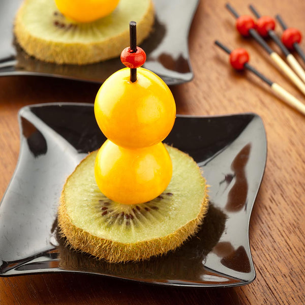 Serve your bite-sized appetizers and miniature desserts in style with our Pixy Black and Red Bamboo Short Mini Ball Skewers. Featuring short mini balls, these two-tone party picks feature a contrasting black tip and bright red wooden bead to grab your customer's attention and effortlessly enhance your presentation. These biodegradable bamboo skewers are durable and can withstand various appetizers and treats without compromising style. To pierce food easily, these commercially compostable bamboo appetizer skewers feature pointed ends. These disposable bamboo picks are suitable for use with hot and cold foods. Measuring 2.5 inches in length, these short mini-ball skewers are perfect for serving bite-sized delicacies at cocktail parties, family gatherings, or formal events. Shipped in a 1,000 count box.