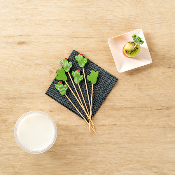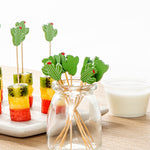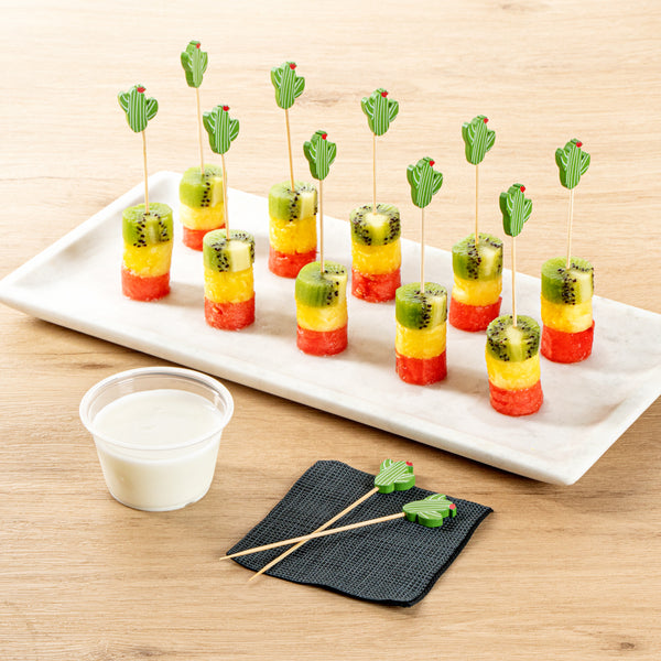 Elevate your culinary presentation with a trendy desert vibe. Trendy Presentation Pixy Bamboo Cocktail Picks feature a captivating cactus flower design, adding an eye-catching flair to appetizers and beverages while serving as indispensable bamboo cocktail picks. Crafted from biodegradable bamboo, these cocktail picks provide a splinter-free surface, ensuring safe handling during bustling services. Their sharp ends effortlessly pierce through a variety of ingredients, facilitating efficient assembly, making them ideal decorative food picks for garnishing cocktails or skewering hors d'oeuvres. Measuring 4.7 inches in length, these picks are both hot and cold food-friendly, making them versatile cocktail garnish sticks suitable for any occasion. Enhance your foodservice offerings with these eco-friendly and commercially compostable picks, aligning with sustainable practices. Sold in a 1000 count box.